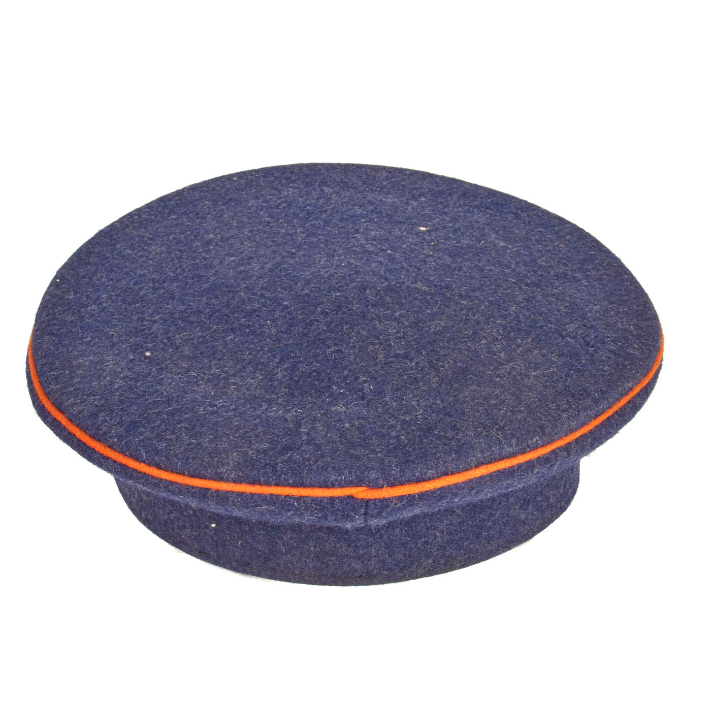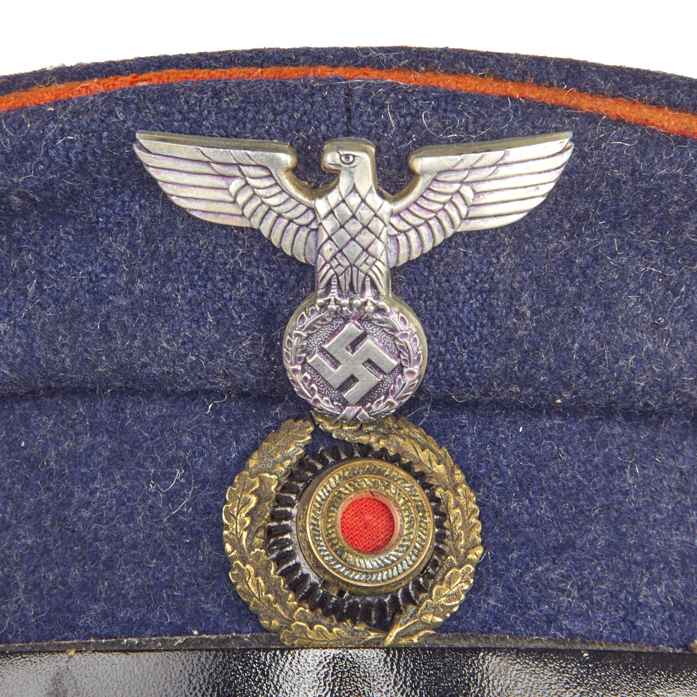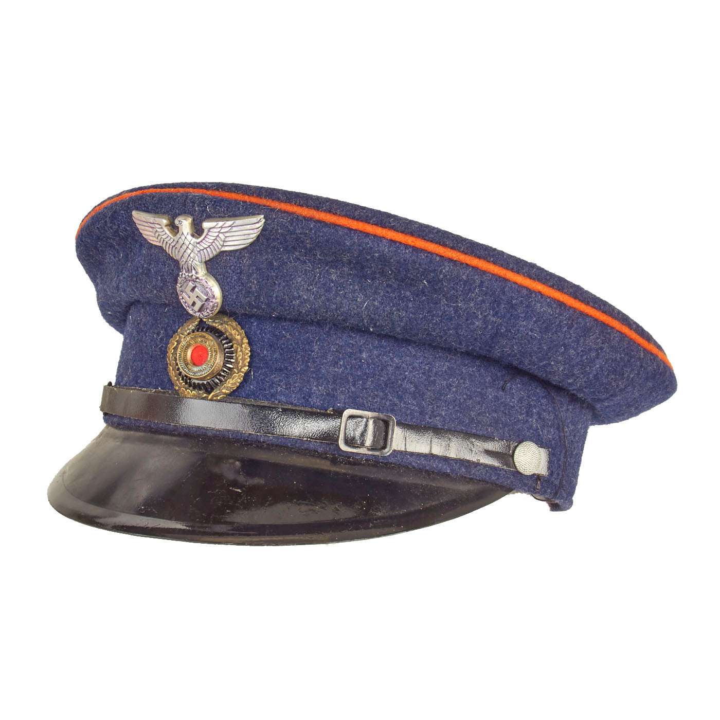 This visor is attributed to a Postschaffner, or “Post Conductor” as it translates to. The blue wool visor is in lovely condition and features the standard orange piping around the top, stamped NSDAP eagle clutching a mobile swas in its talons and a lovely cockade beneath that. Both pebbled buttons on the side for the chin strap are present as well as the decorative chin strap. The black visor has minor crazing present with most of the glossy finish still present. The interior lining is a lovely dark gray with a complete sweatband. There is no stampings or other marking present. We measured the visor and it is approximately 58cm.