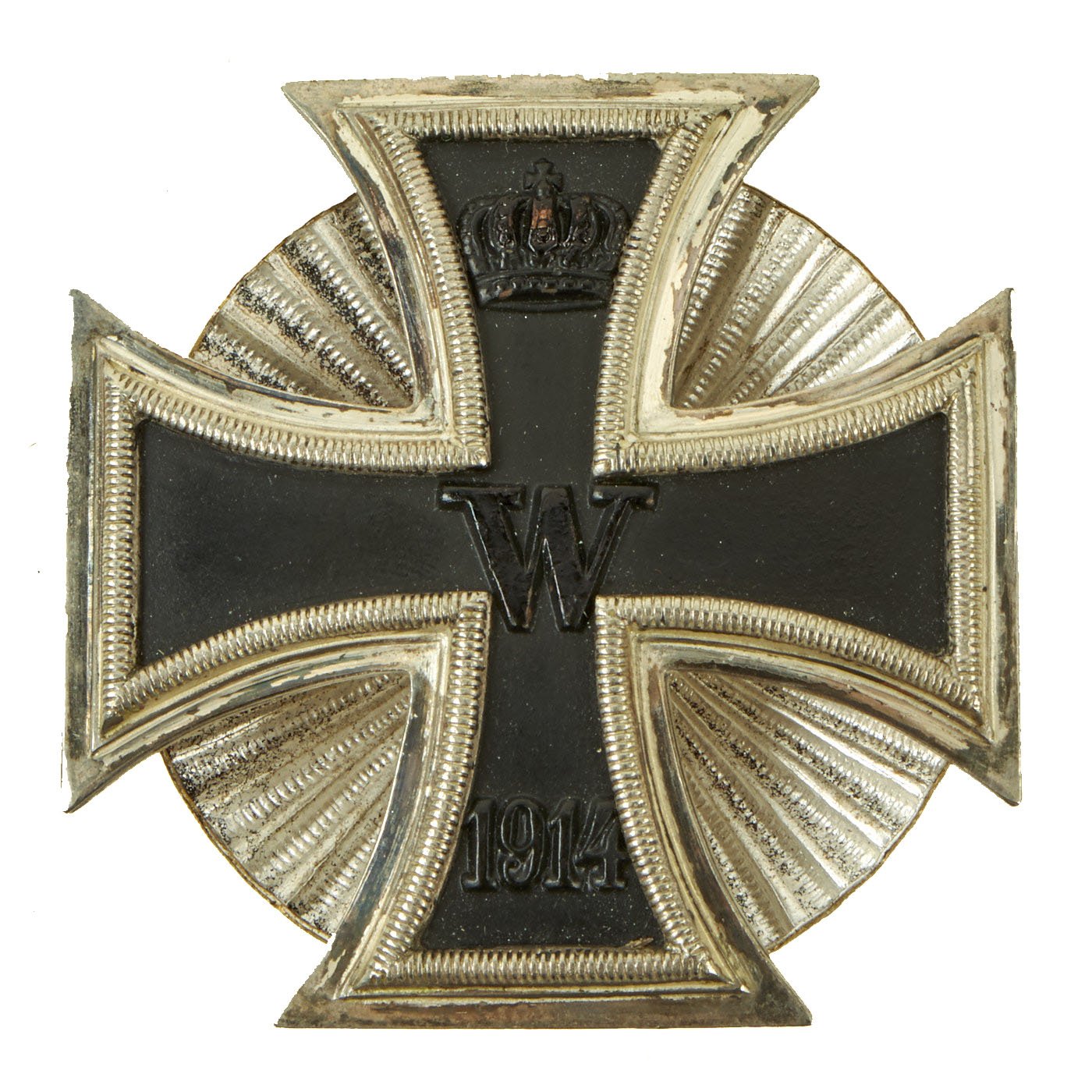 The basic design of the WW1 crosses is a central cross patee struck from iron and mounted in a silver frame which has a raised crenulated decorative border. The obverse of the cross bears the date 1914 under a crowned W monogram. Second class crosses would have a ring at the top where a ring was attached, and had more markings on the back. The first class award, however, was meant to attach directly to the front of the uniform.