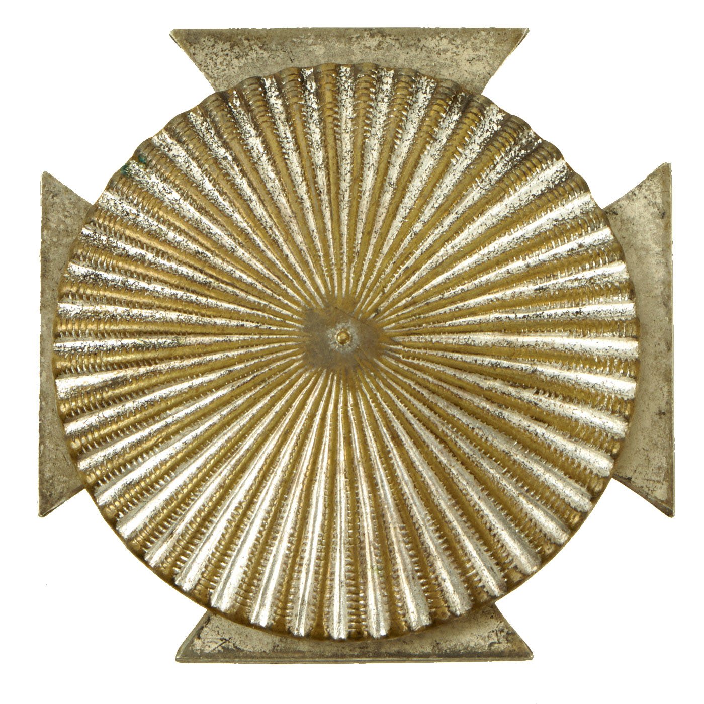 The medal is in very good condition, and the silver plate is retained almost completely, still quite bright with little sign of tarnish. The black paint on the background is retained well, with just a bit of checking and crazing. The paint on the raised areas is retained well, though the crown is missing a bit.