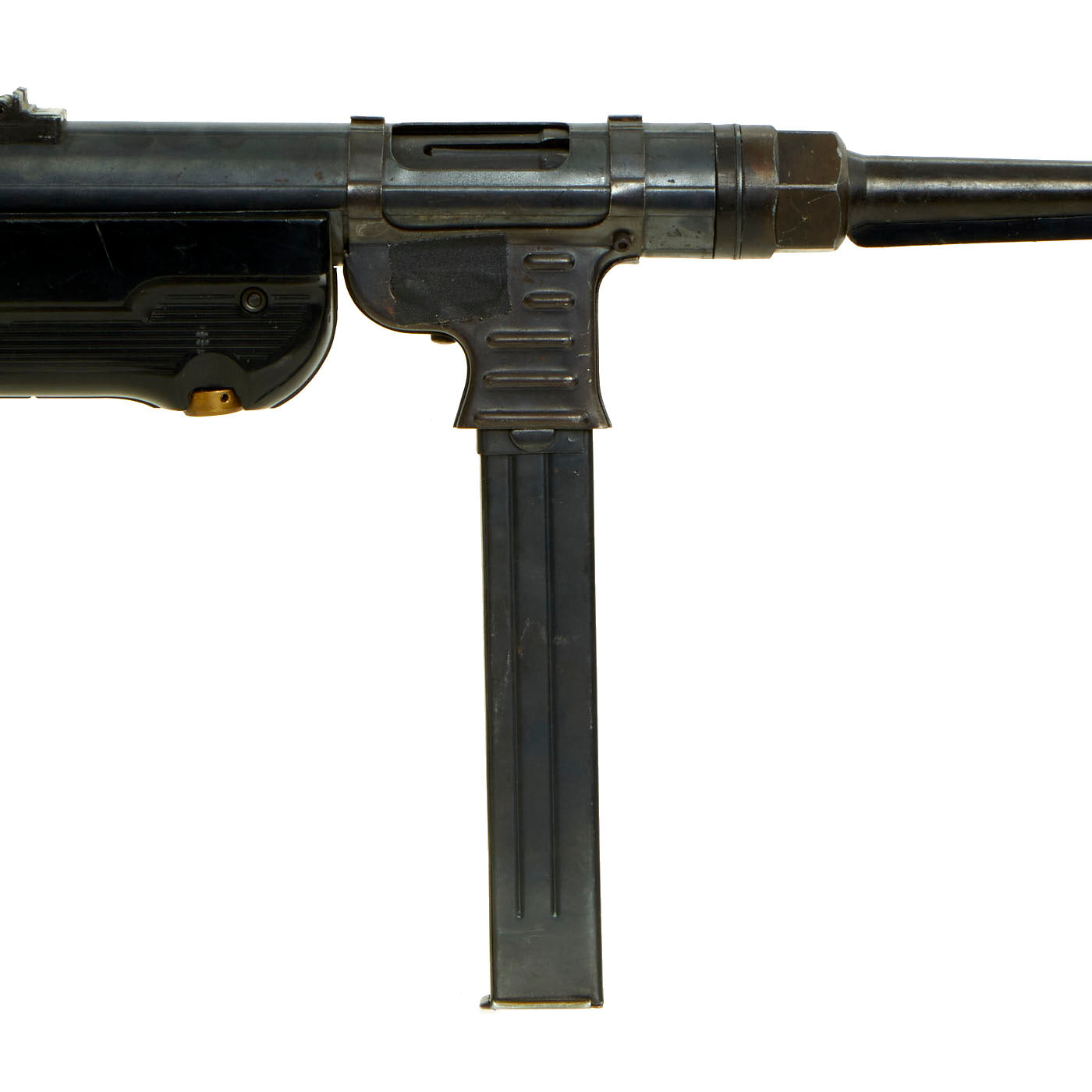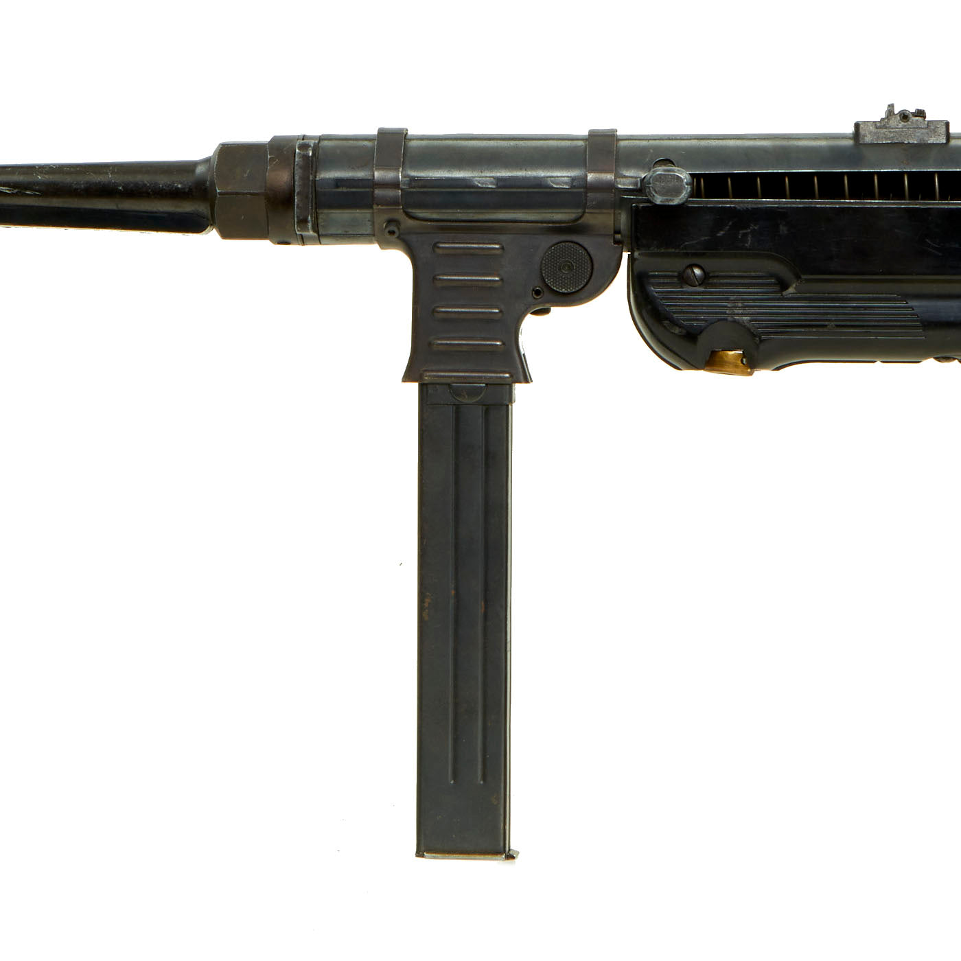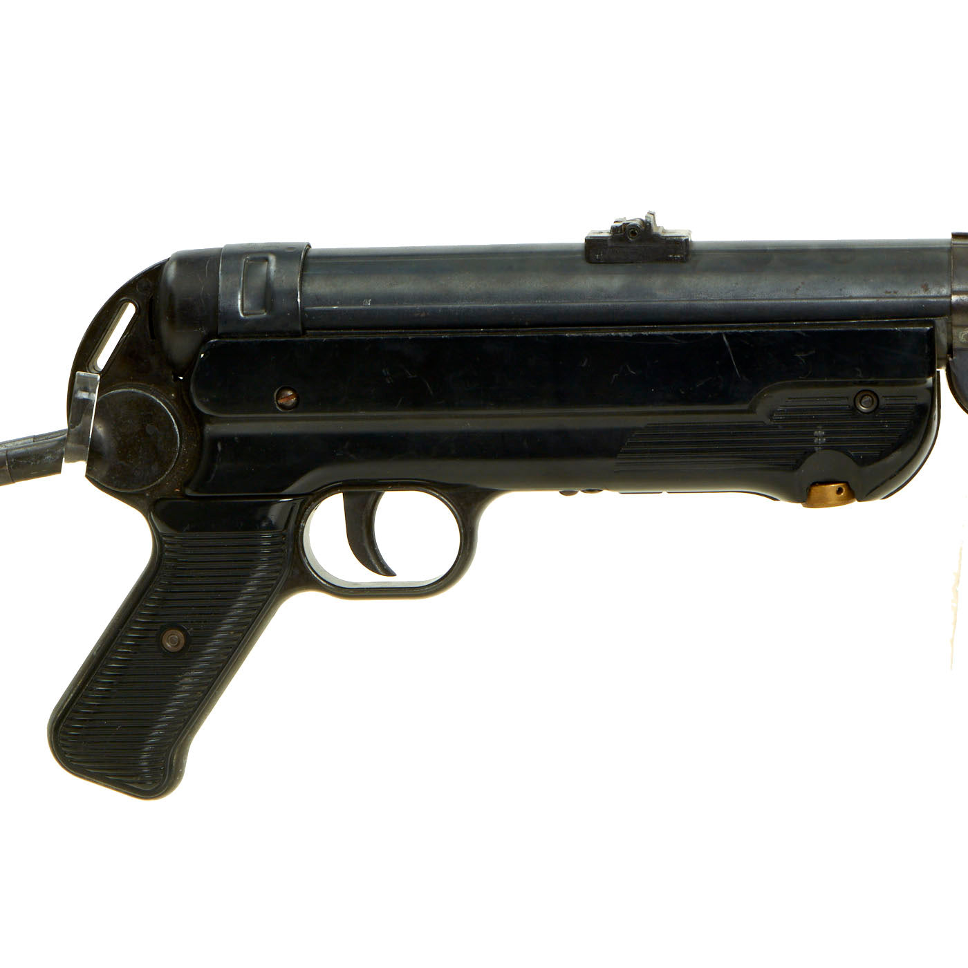 Vintage Replica Item: Only One Available. This is a fantastic extremely high quality German WWII Maschinenpistole 40 / MP 40 "Plug Fire" replica gun, made by the well-known Model Gun Corporation (MGC) of Japan. These work with replica "cartridges”, which have small caps "plugged" into the front of them, which are then detonated by the replica bolt. These were ejected like real spent cartridges, and could be reloaded with additional caps. Sadly the plugs and caps have all been lost, probably long ago somewhere in a backyard. This example does not have a serial number on the barrel indicating that it is an earlier import. The back of the receiver is marked MP40 / MGC 68 which we believe represents the year of manufacture as 1968.