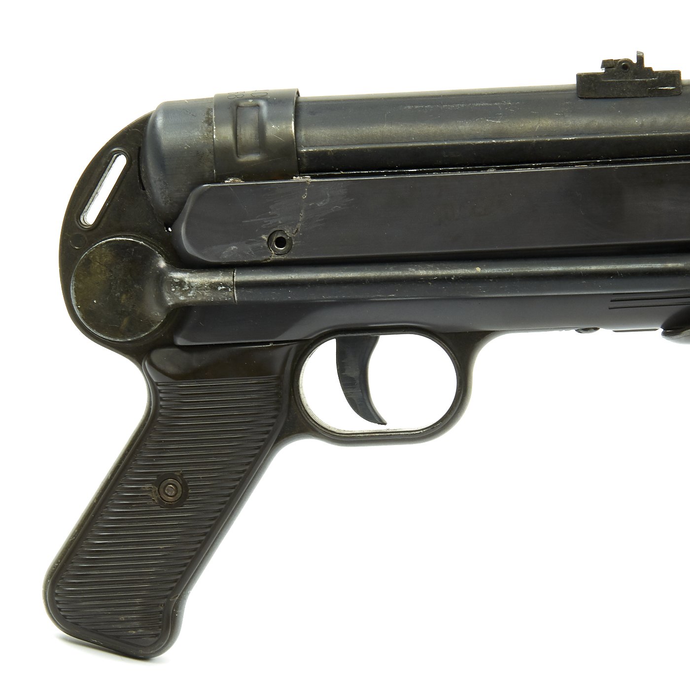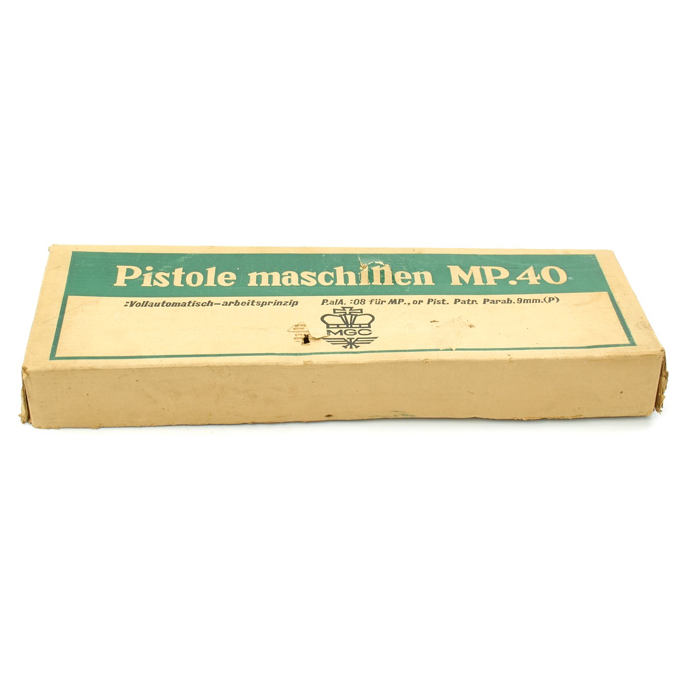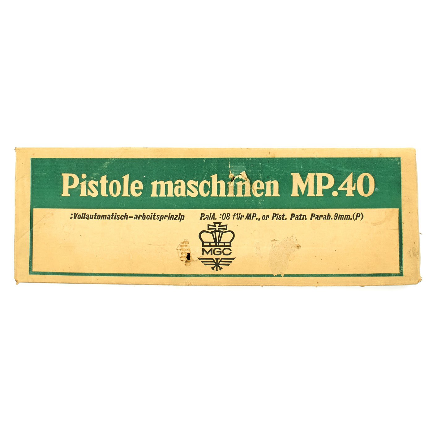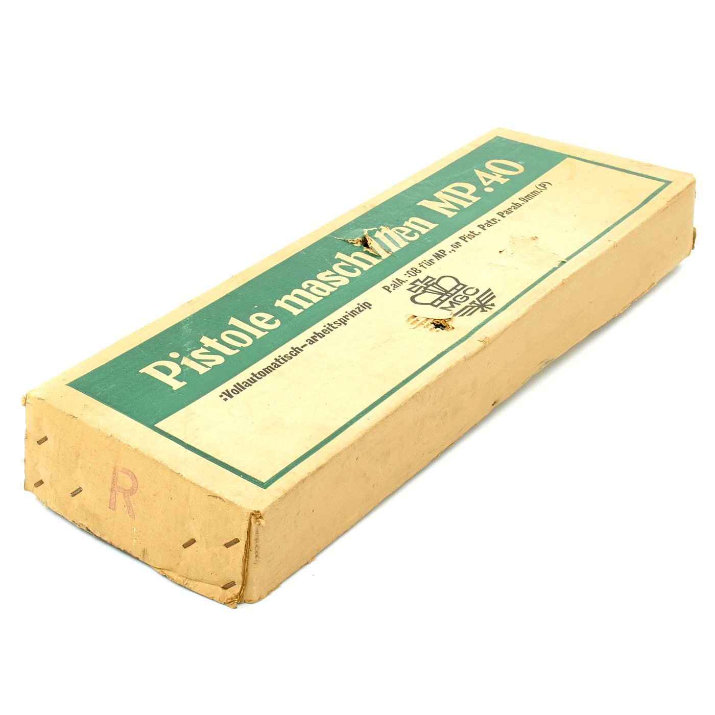 Original Replica Item: Only One Available. This is a great German WWII Maschinenpistole 40 / MP 40 "Plug Fire" replica gun, made by the well-known Model Gun Corporation of Japan. These work with replica "cartridges", which have small caps "plugged" into the front of them, which then is detonated by the replica bolt. These would then be ejected like a real spent cartridge, and could be reloaded with additional caps.