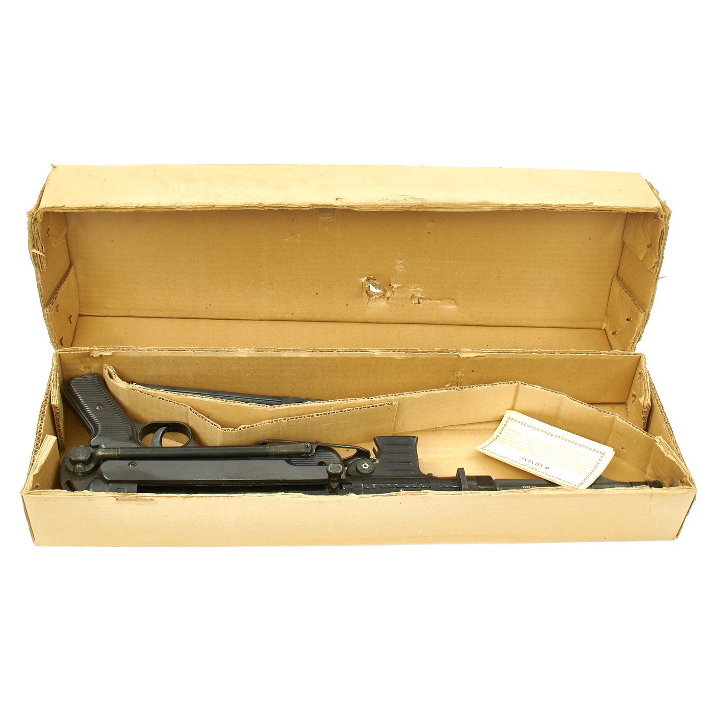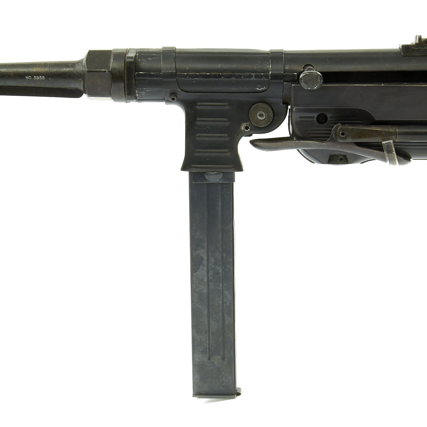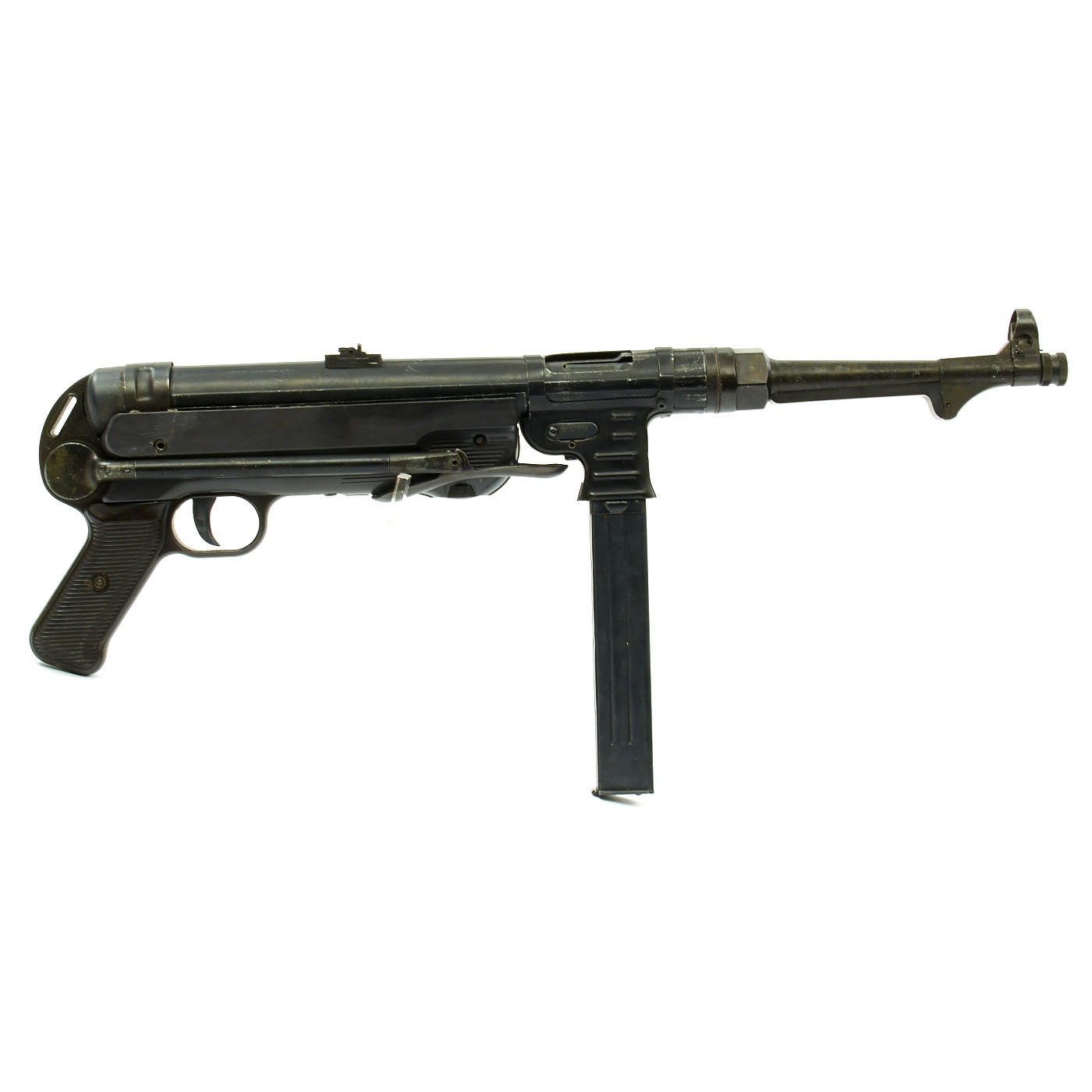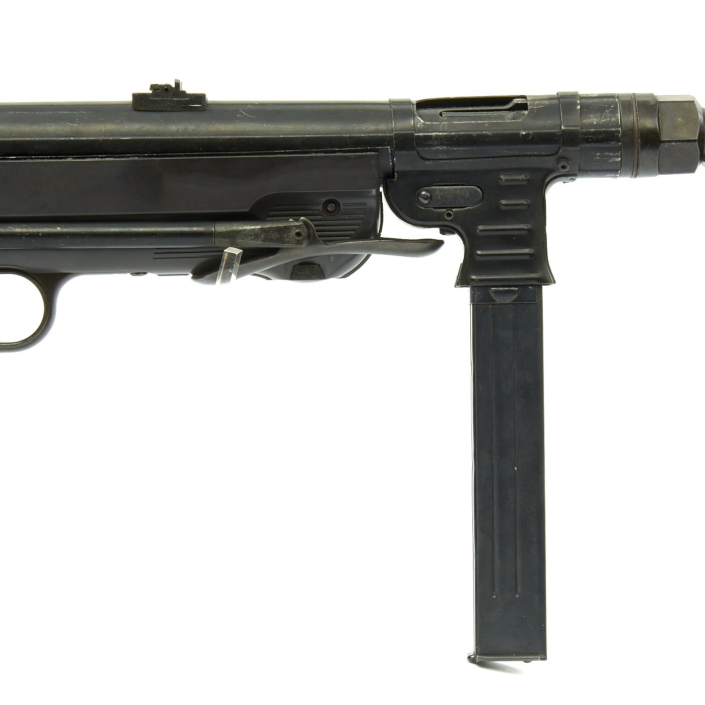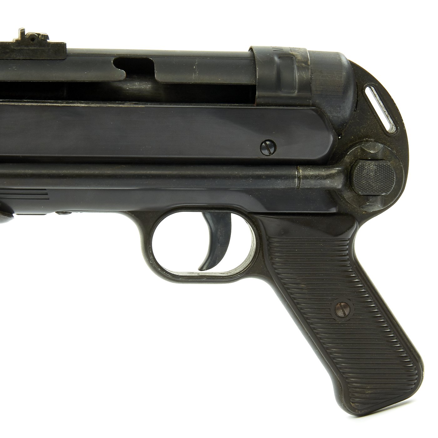 Original Replica Item: Only One Available. This is a great German WWII Maschinenpistole 40 / MP 40 "Plug Fire" replica gun, made by the well-known Model Gun Corporation of Japan. These work with replica "cartridges", which have small caps "plugged" into the front of them, which then is detonated by the replica bolt. These would then be ejected like a real spent cartridge, and could be reloaded with additional caps.