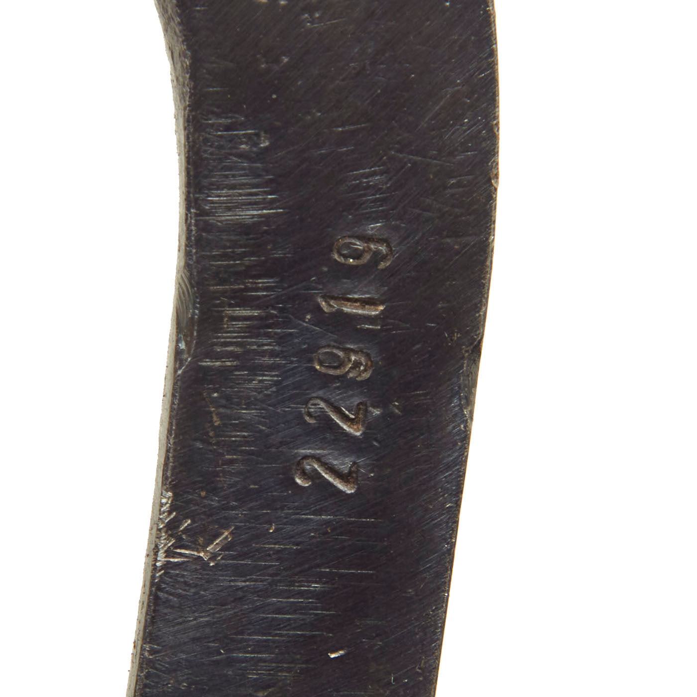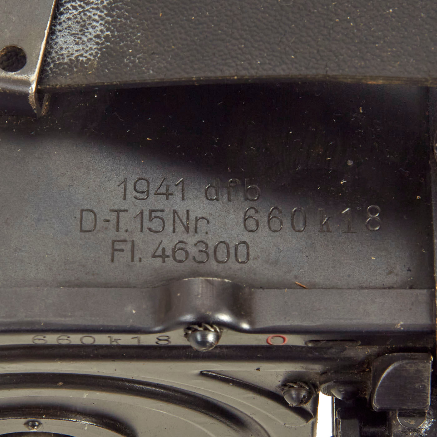 The rare D-T. 15 saddle drum magazine is itself marked with serial Nr. 660k18, as well as the Luftwaffe stock number Fl 46300. It is also dated and maker marked 1941 dfb, for Gustloff-Werke, Waffenfabrik, in Suhl, Germany. This factory had previously been Simson & Co., before the Jewish Simson family found their company headquarters occupied by the SA in 1933. It features a desirable Preßstoff (Pressed Material) Ersatz Leather carry handle. These cannot be deactivated, so they must be shipped to a location where they are permitted.