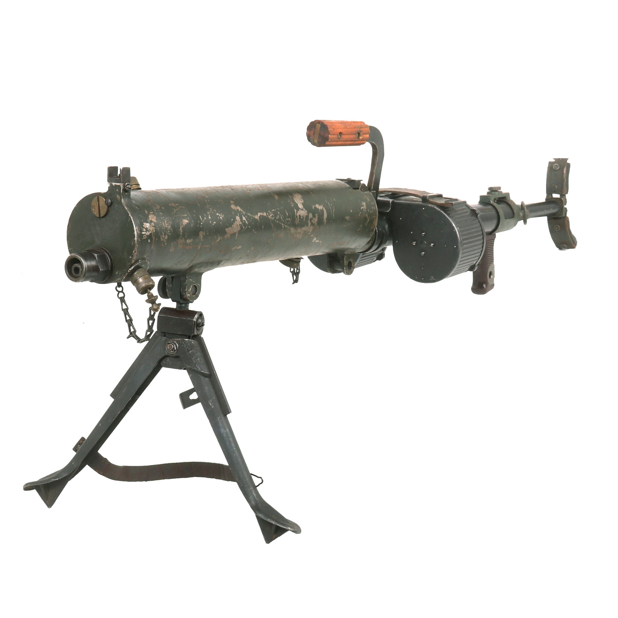 Many were later converted to a Water Cooled configuration in Romania, such as this example. This involved replacing the ventilated barrel jacket with a water jacket, and sleeving the ends of the barrel to get a good seal. The water jacket has a bipod attached to the bottom, and a butt stock was attached to the end to make it easier to aim.