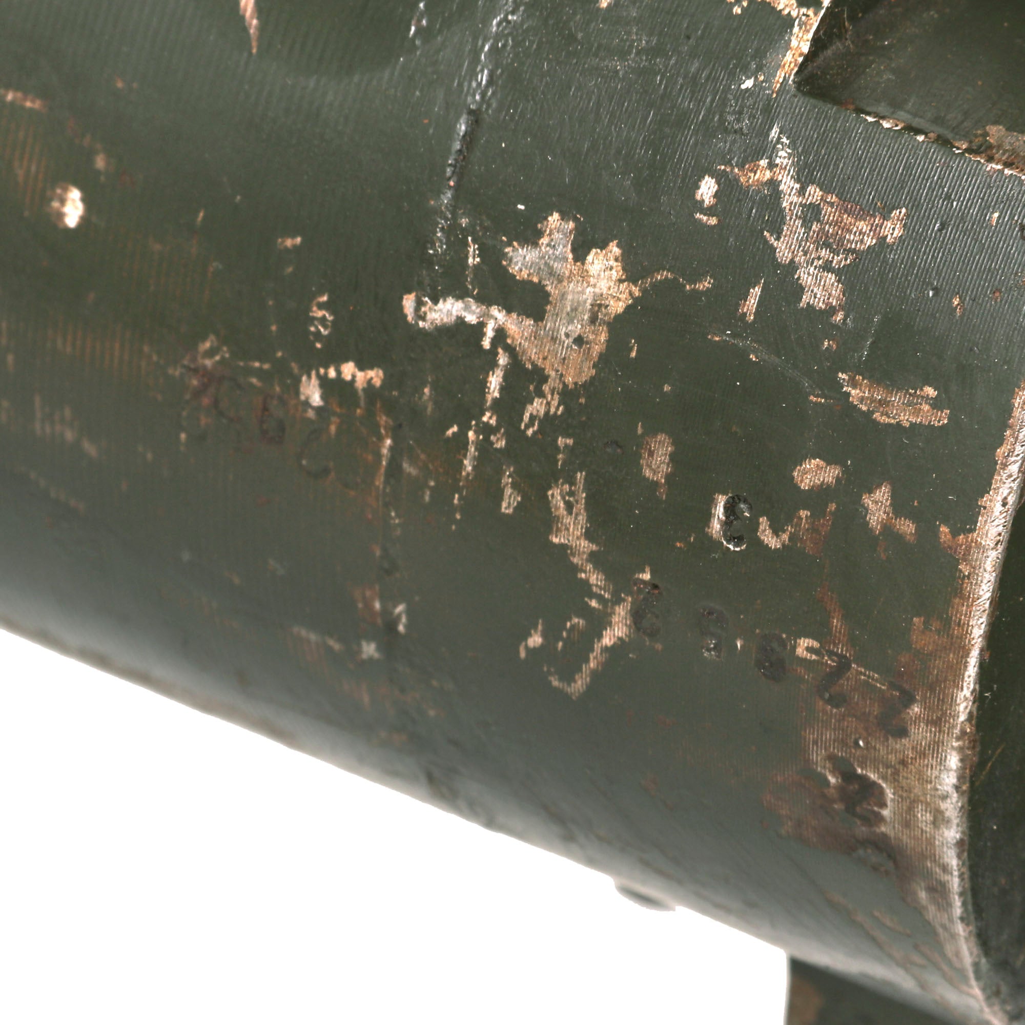 This is a fine rare German made Romanian Contract ST 61 MG 15 non-firing water-cooled display gun, marked with the RHEINMETALL BORSIG logo, over serial No 1773. Additionally the right side of the receiver is very faintly dated 1942 next to a small Rheinmtall Borsig logo and Weimar style Waffenamt Eagle. The entire forward portion of the receiver has been replaced with a solid steel cylinder per BATF specifications, which has the top machined away so the magazine can fit, and the magazine housing was then slid over the solid steel portion. The magazine can installed and removed easily, just make sure that the retaining lock is flipped to the right.