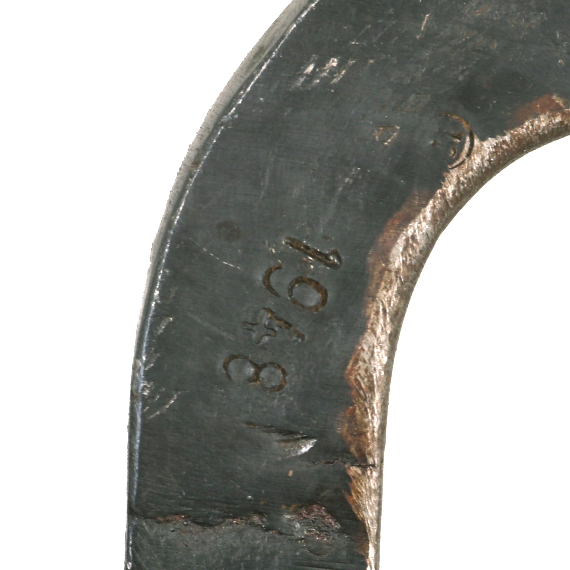 The rare D-T15 saddle drum magazine is a very early example with a LEATHER carry strap, marked with serial number B 4803 but no Luftwaffe stock number or even a model number. It is maker marked HASAG 39, for 1939 production by HASAG-Eisen- & Metallwerke GmbH, previously known as Hugo Schneider AG, Abteilung Lampenfabrik, Leipzig. These cannot be deactivated, so they must be shipped to a location where they are permitted.