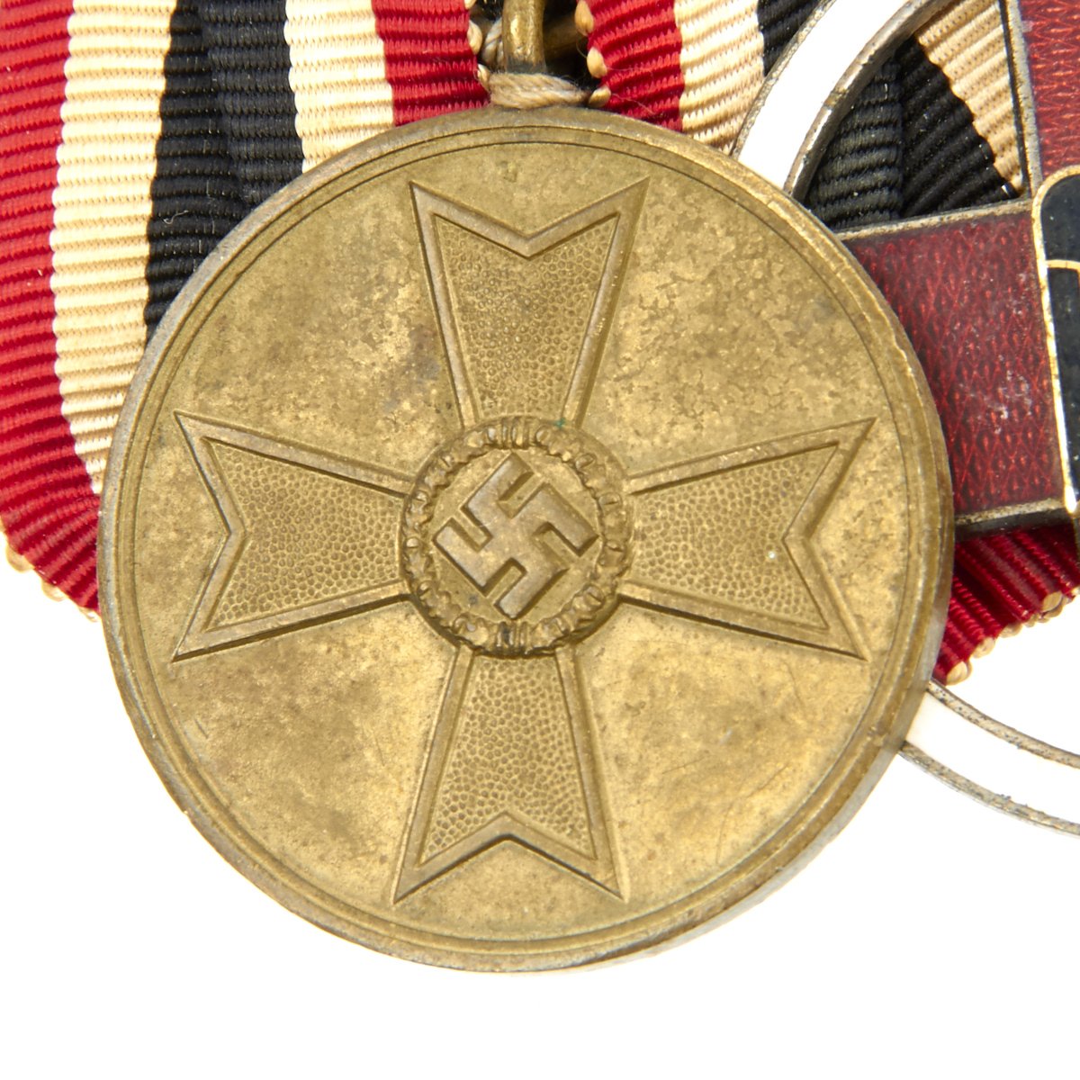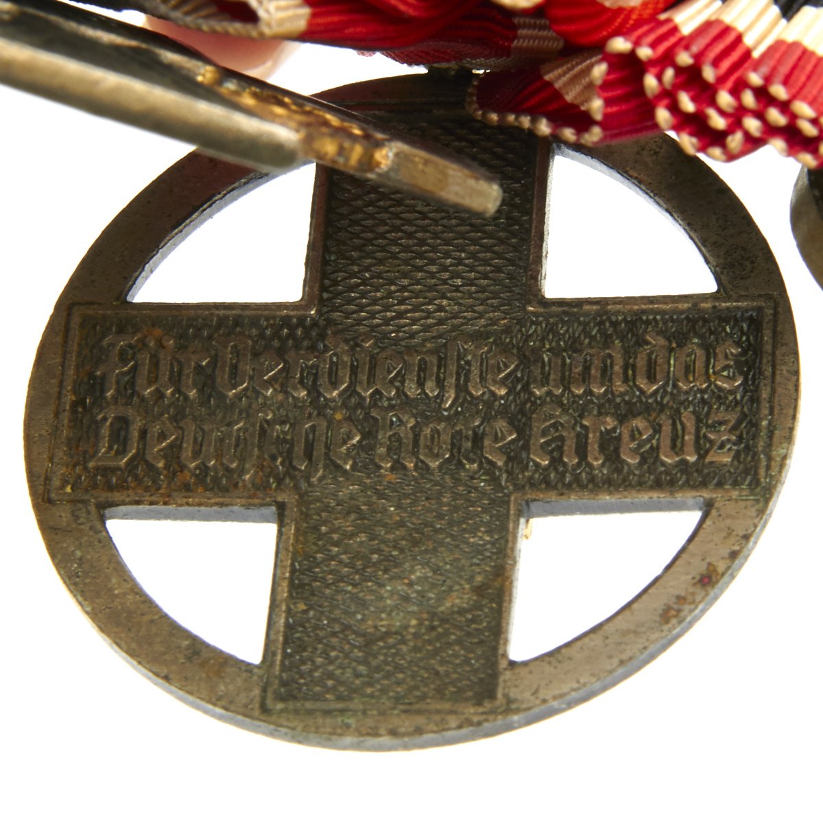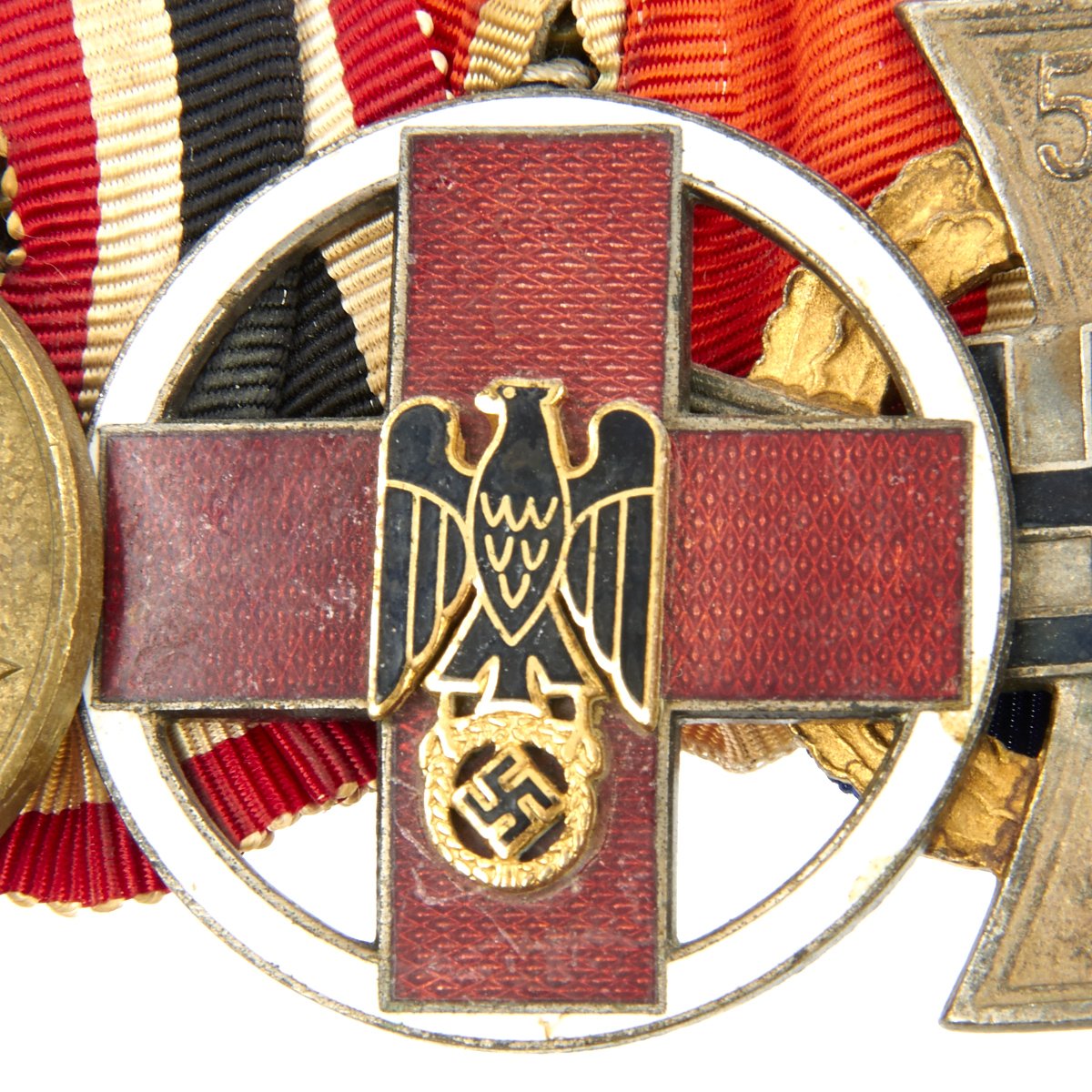German WWII 1939 War Merit Medal - The medal was designed in 1939 by Richard Klein and was officially adopted/established in 1940. The purpose of the Medal was to expand the award possibilities in regard to War Merit and to include actions that couldn't justify the award of the War Merit Cross or of the Iron Cross. It was awarded to both military personnel and to civilians, especially to women working in the Armament Factories. This is an early example in bronze (late examples were made in zinc).German WWII DRK Honor Decoration of the German Red Cross - (Deutsches Rotes Kreuz Ehrenzeichen). Constructed of silvered bronze with multi-colored enamels, on loop for suspension, the obverse with a red enameled Geneva Cross overlaid by a black enameled German national eagle clutching a wreathed mobile swas, on top of a white enameled circle, the reverse with an inscription of FÜR VERDIENSTE UM DAS DEUTSCHE ROTE KREUZ (“FOR SERVICE IN THE GERMAN RED CROSS”).