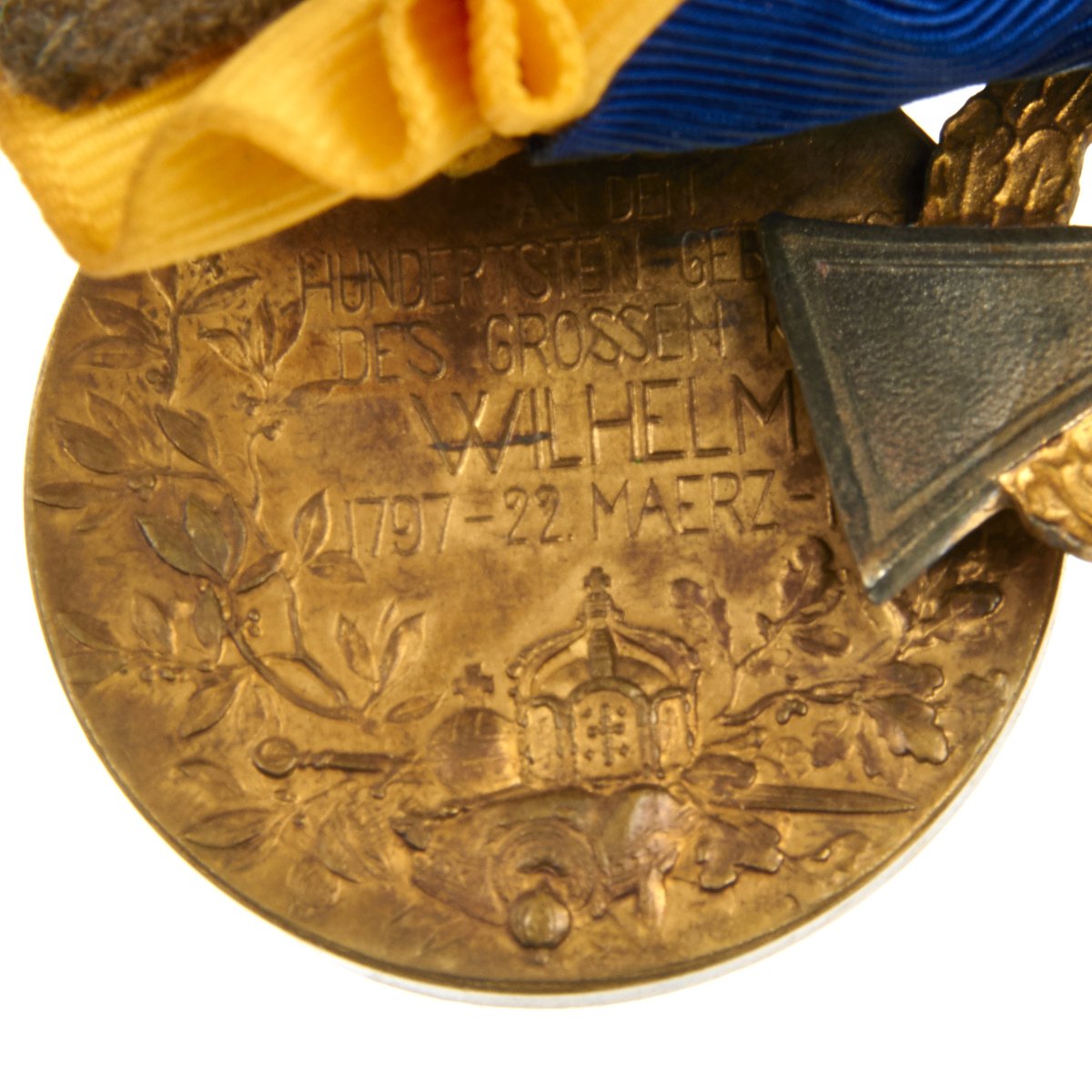 The reverse depicts symbols of royal authority including the German State Crown, an orb, sword, and scepter placed upon a pillow surrounded by oak leaves, in the lower half of the medal. To the left is an upward climbing laurel branch. In the upper half is the inscription in six lines ZUM ANDENKEN AN DEN HUNDERTSTEN GEBURTSTAG DES GROSSEN KAISERS WILHELM I. 1797 22.MAERZ 1897 (IN MEMORY OF THE HUNDREDTH BIRTHDAY THE GREAT EMPEROR WILHELM I. 1797–MARCH 22–1897).