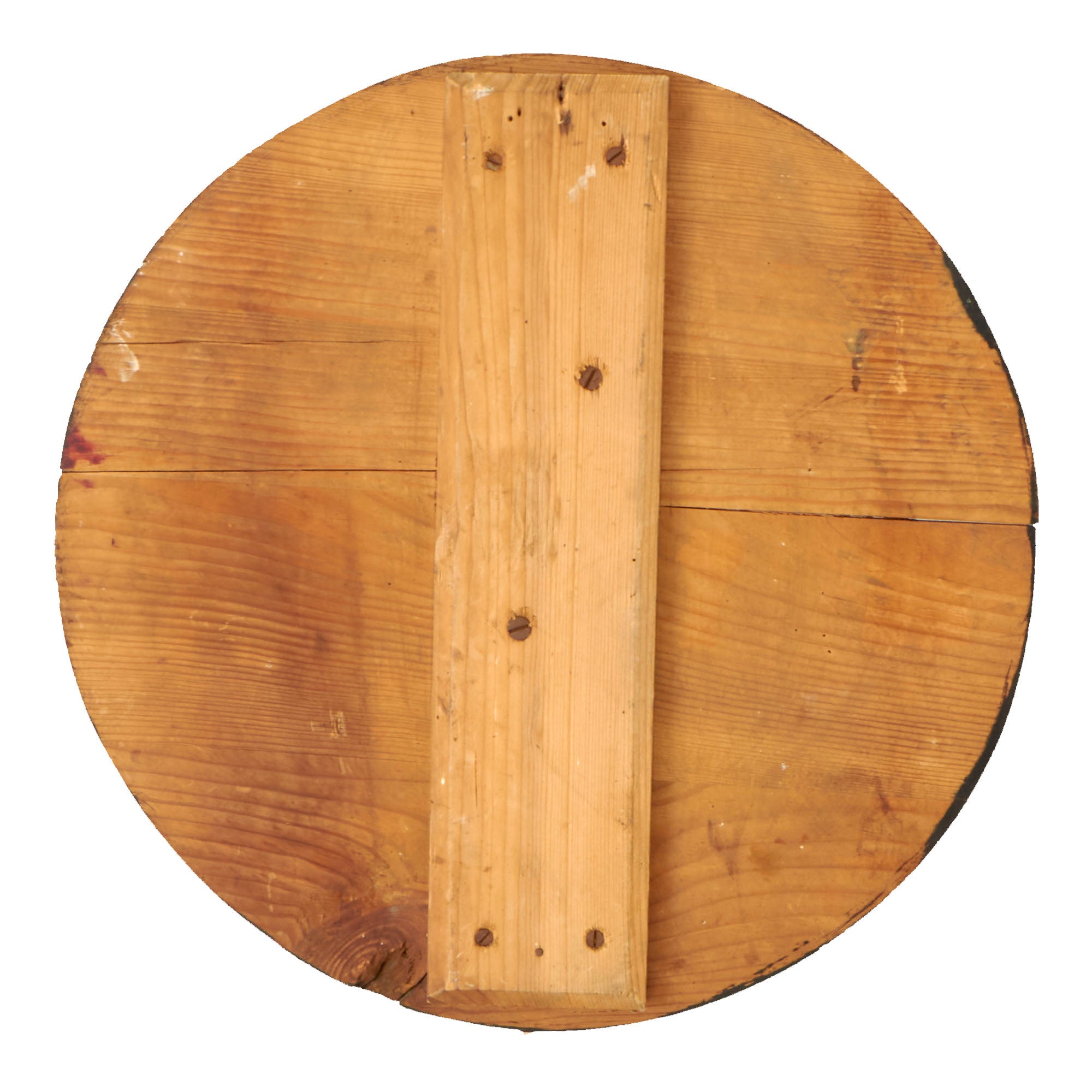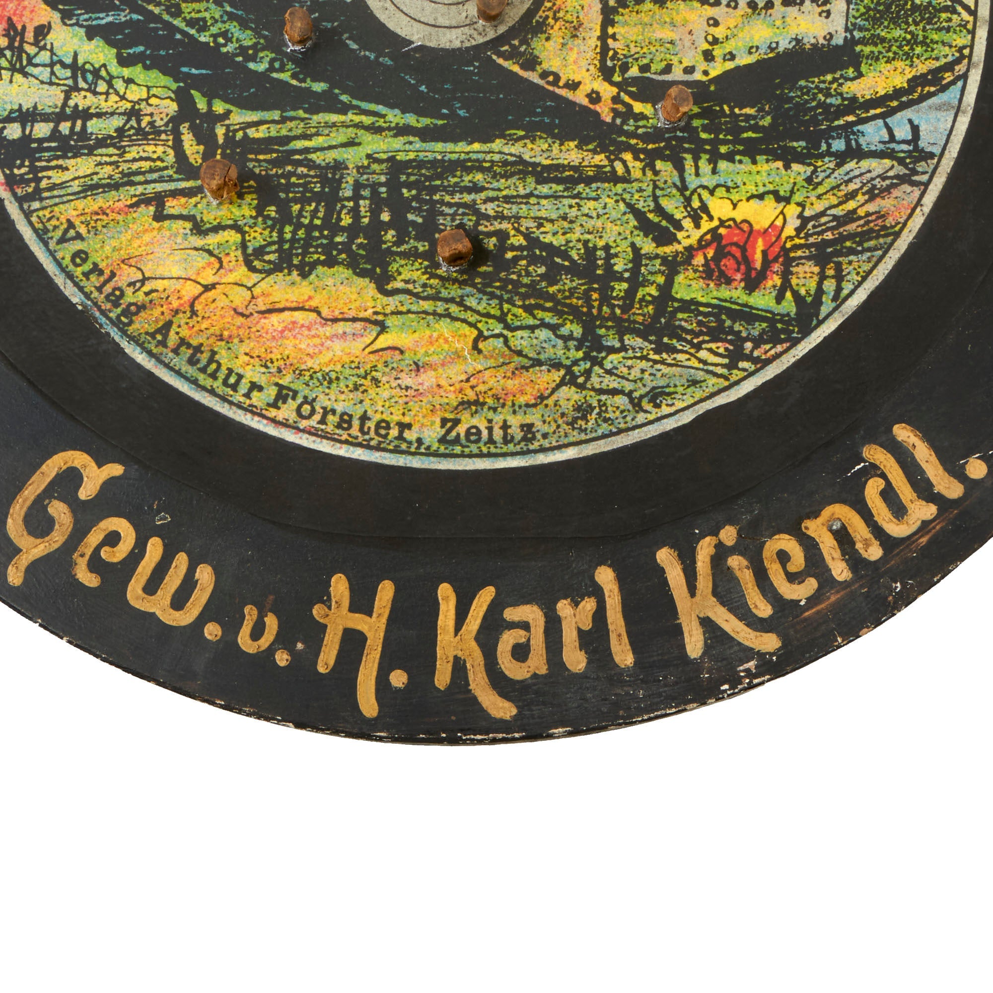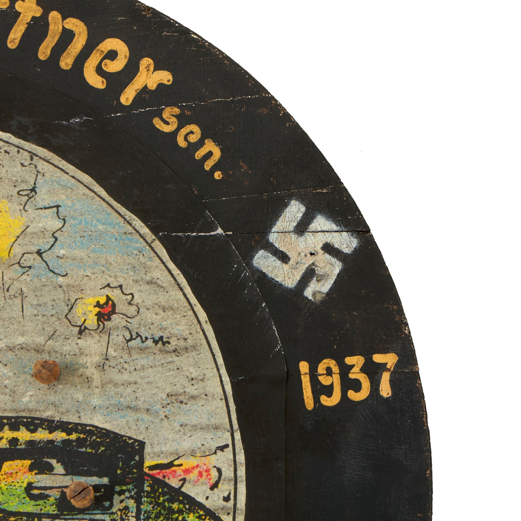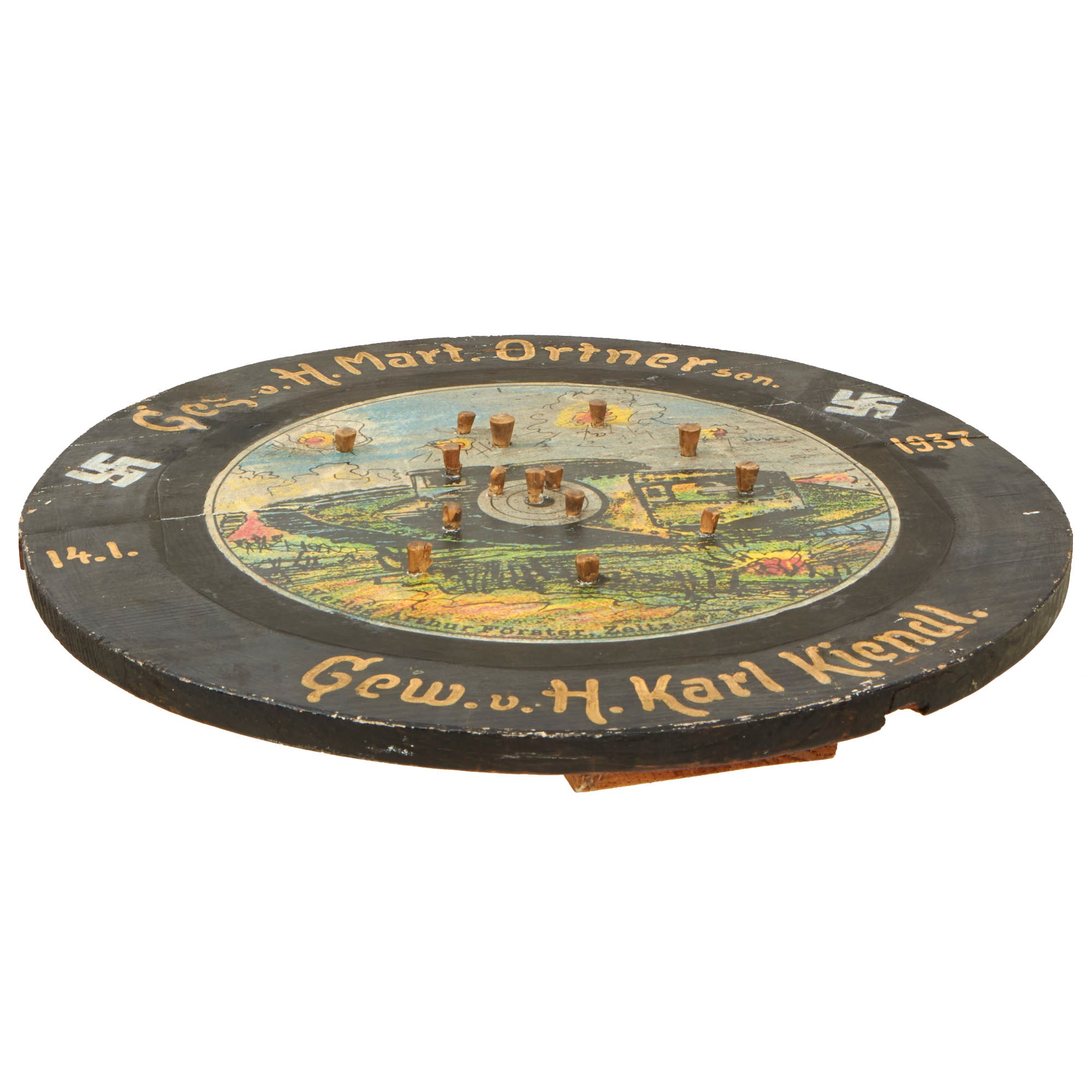 As best we can tell, it looks like H. Mart. Ortner Senior used a rifle owned by H. Karl Kiendl on 14 January 1937 for training, and the target is the result. All of the holes in the target then had the backing bored drilled, and wooden "bullets" inserted into them, giving it a great look. There are painted swas (hook cross) emblems on either side as well.
