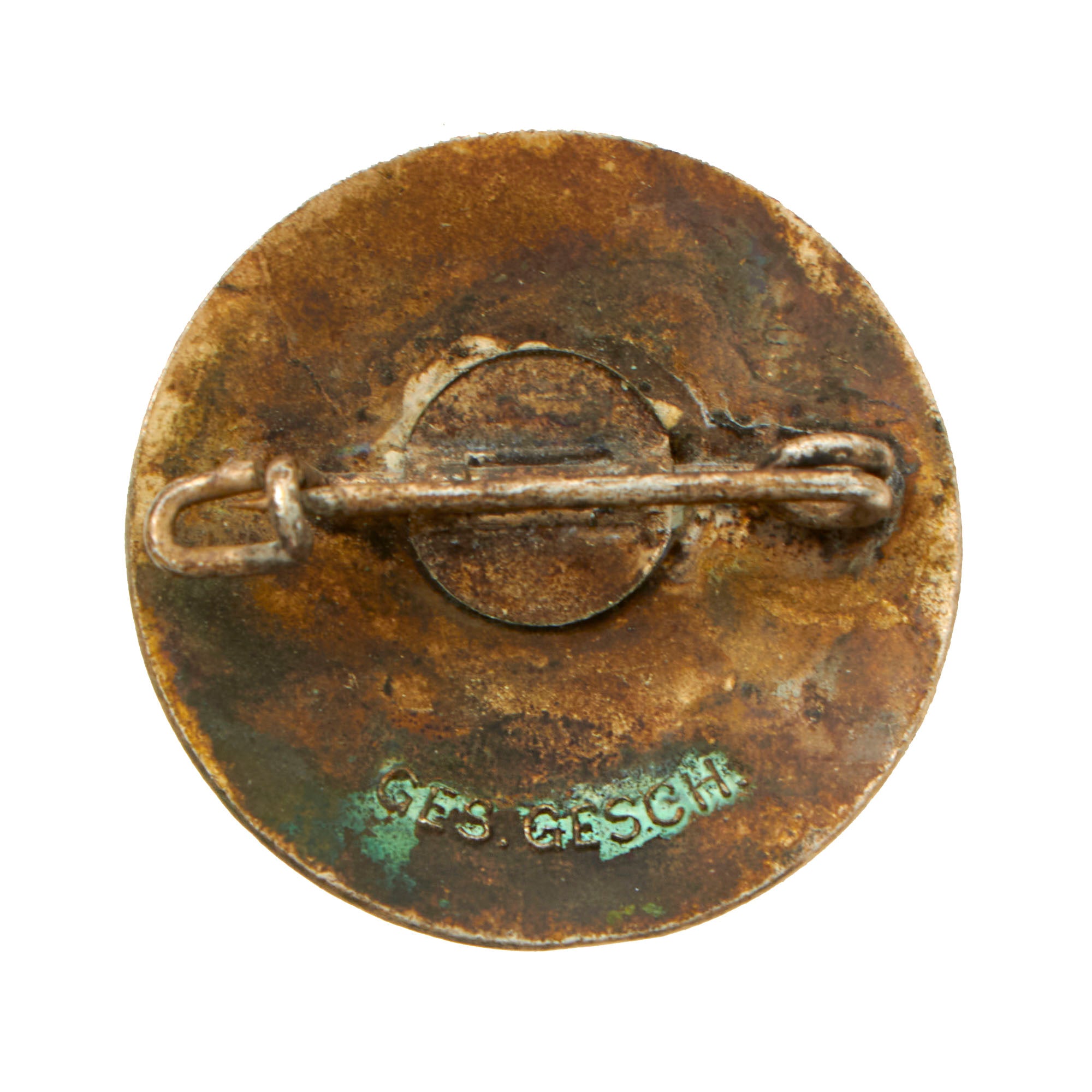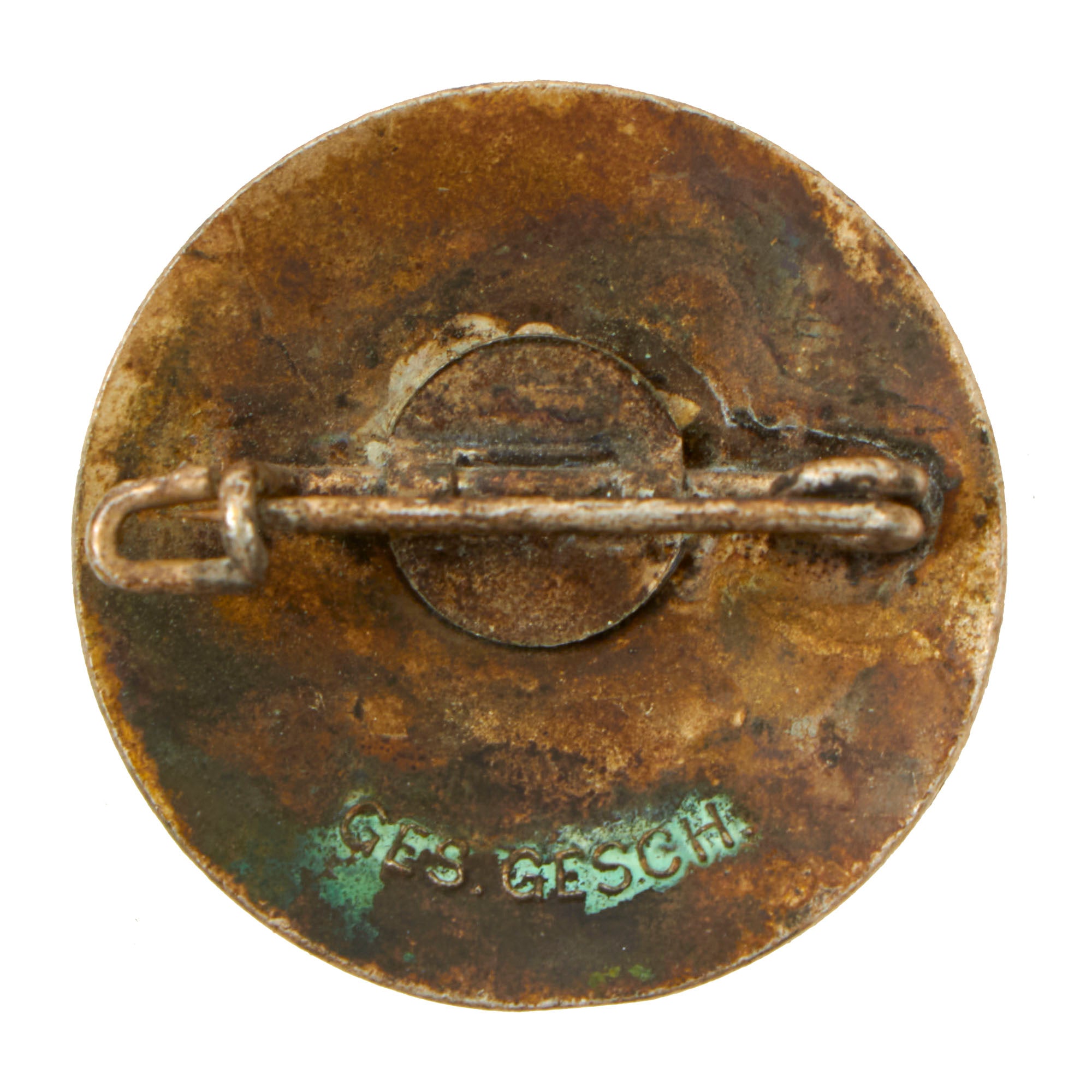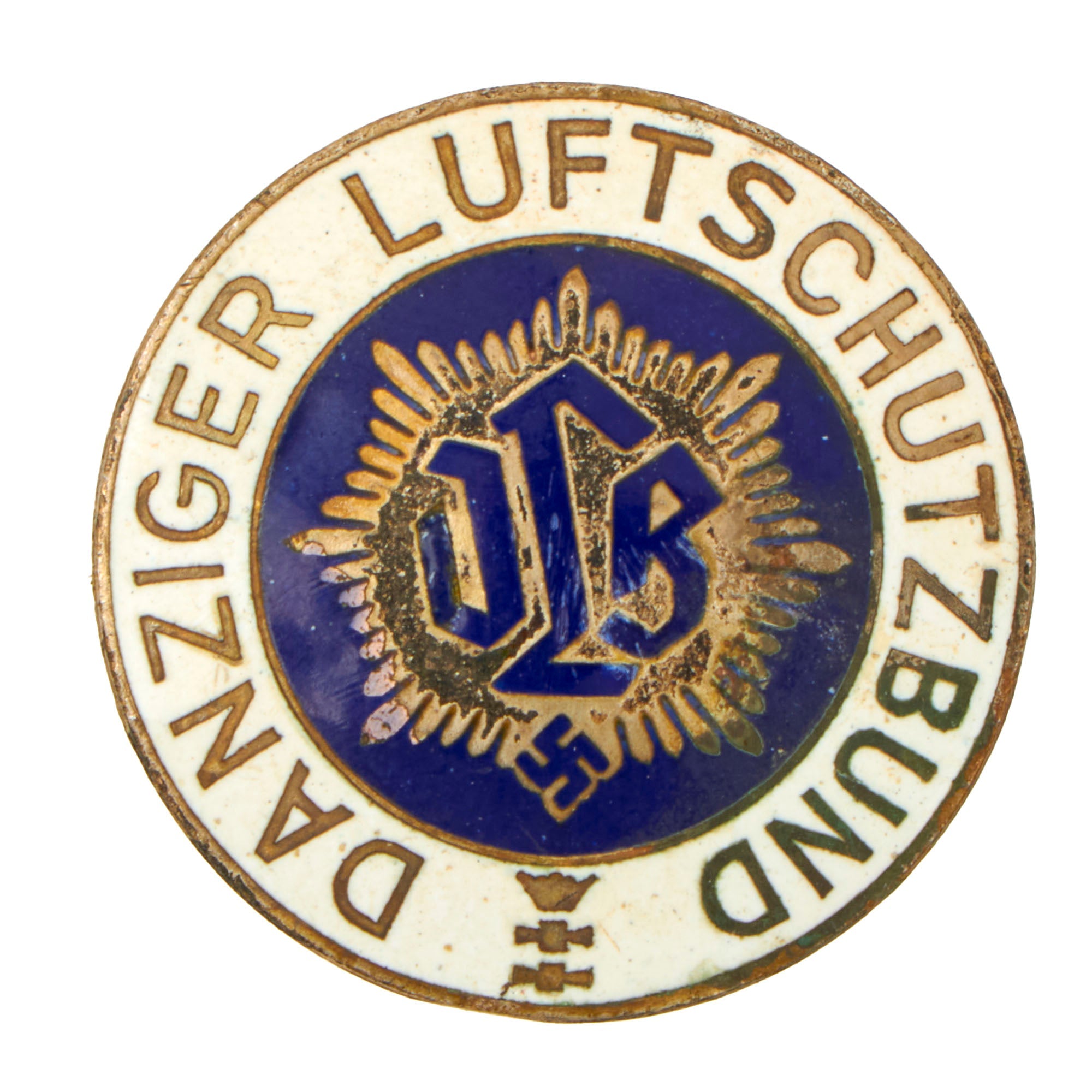 This is a great WWII DANZIGER LUFTSCHUTZBUND (Danzig Air Raid Protection Association) enamel membership badge pin, marked on the reverse with GES. GESCH.. The abbreviation is short for Gesetzlich Geschützt (By-law Protected), indicating it was a protected design, though there is no maker mark present. It has the DLB starburst emblem in the middle, which is identical to the RLB emblem except for the D replacing the R.