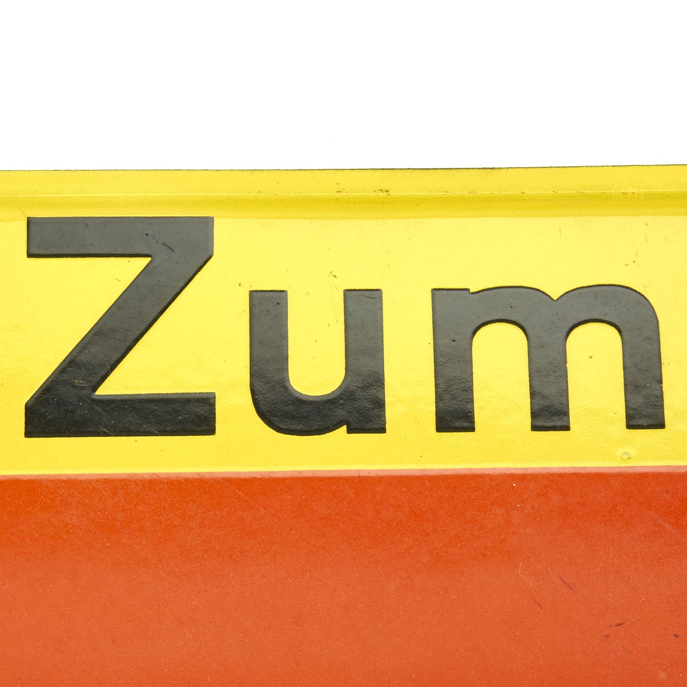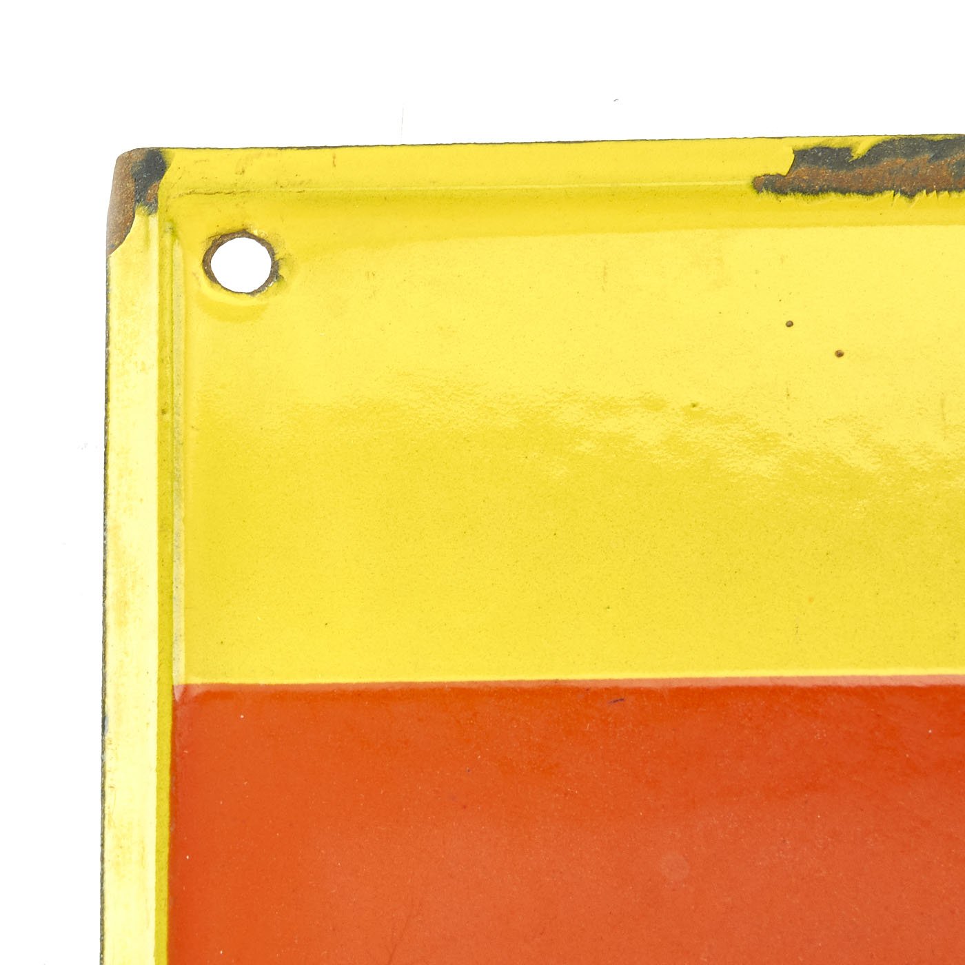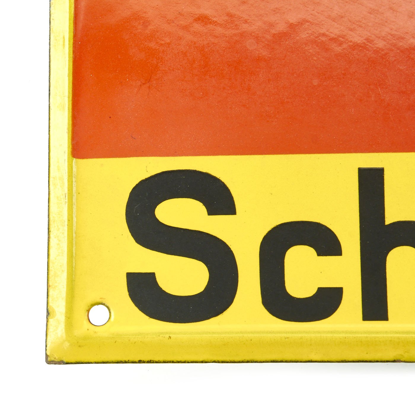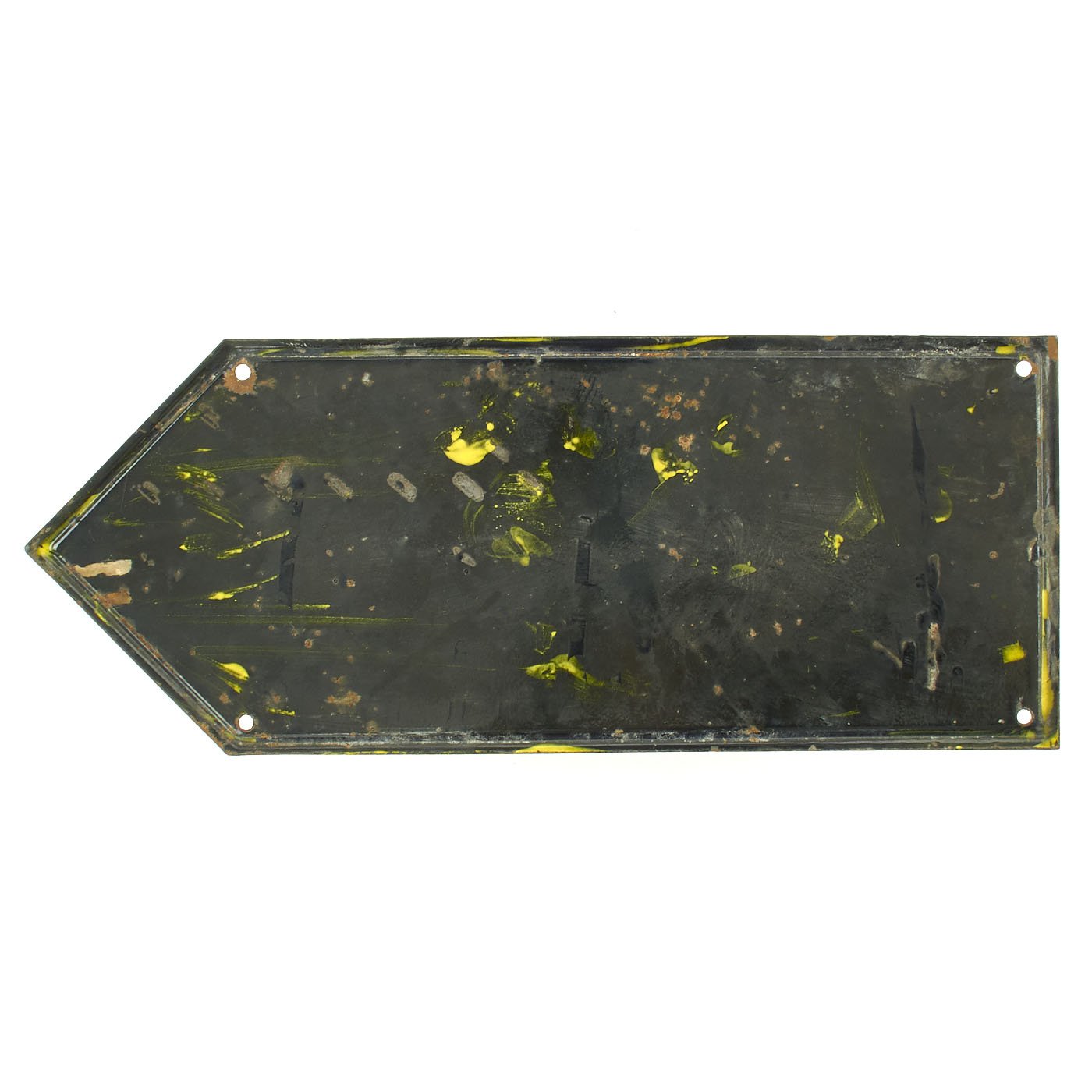 The sign itself measures 19 1/2" x 7 3/4", and is coated with bright yellow enamel on the front, with a large red enamel arrow pointing to the right. Above and below the arrow it is marked Zum Schutzraum, or "To The Shelter". The rear of the sign is all black enamel.