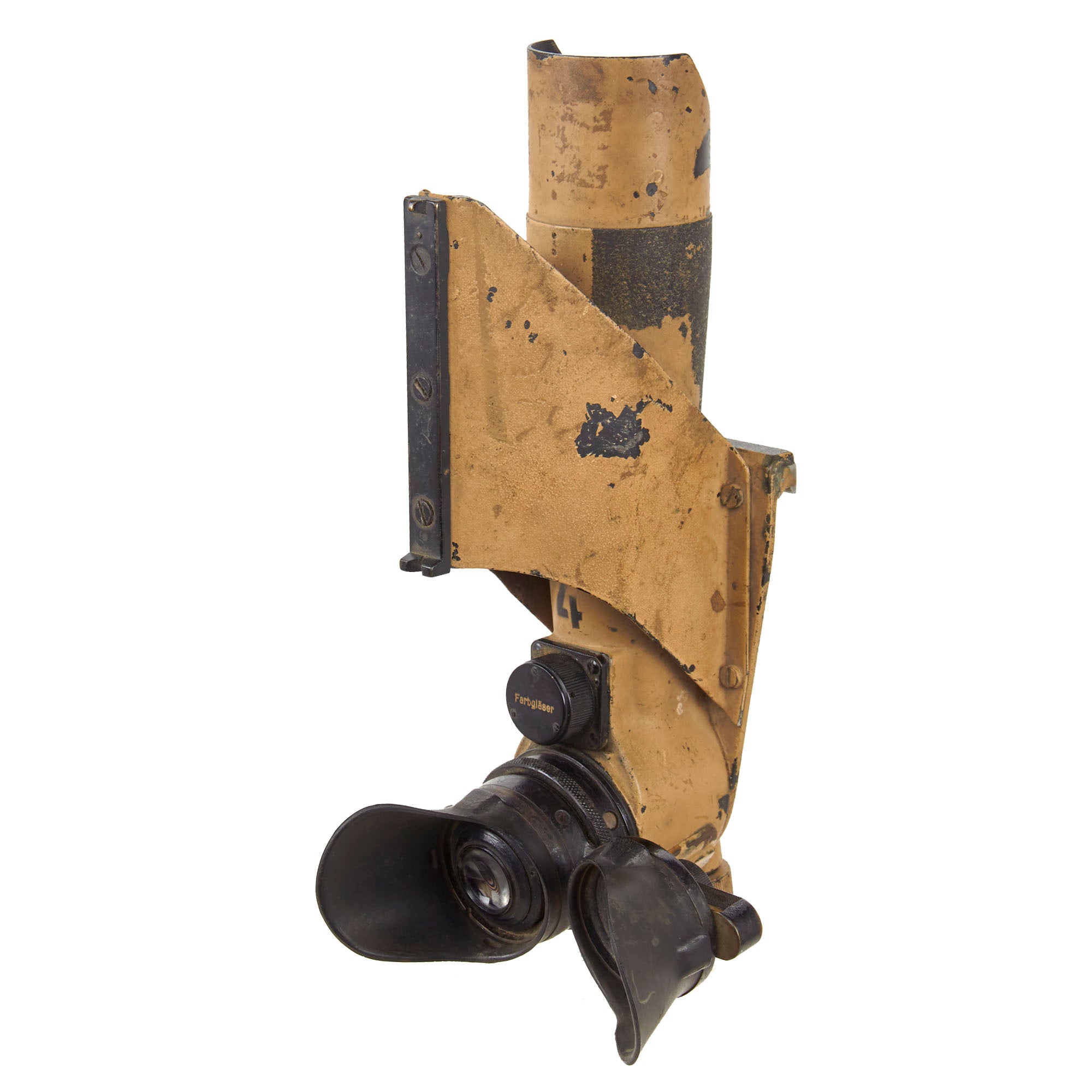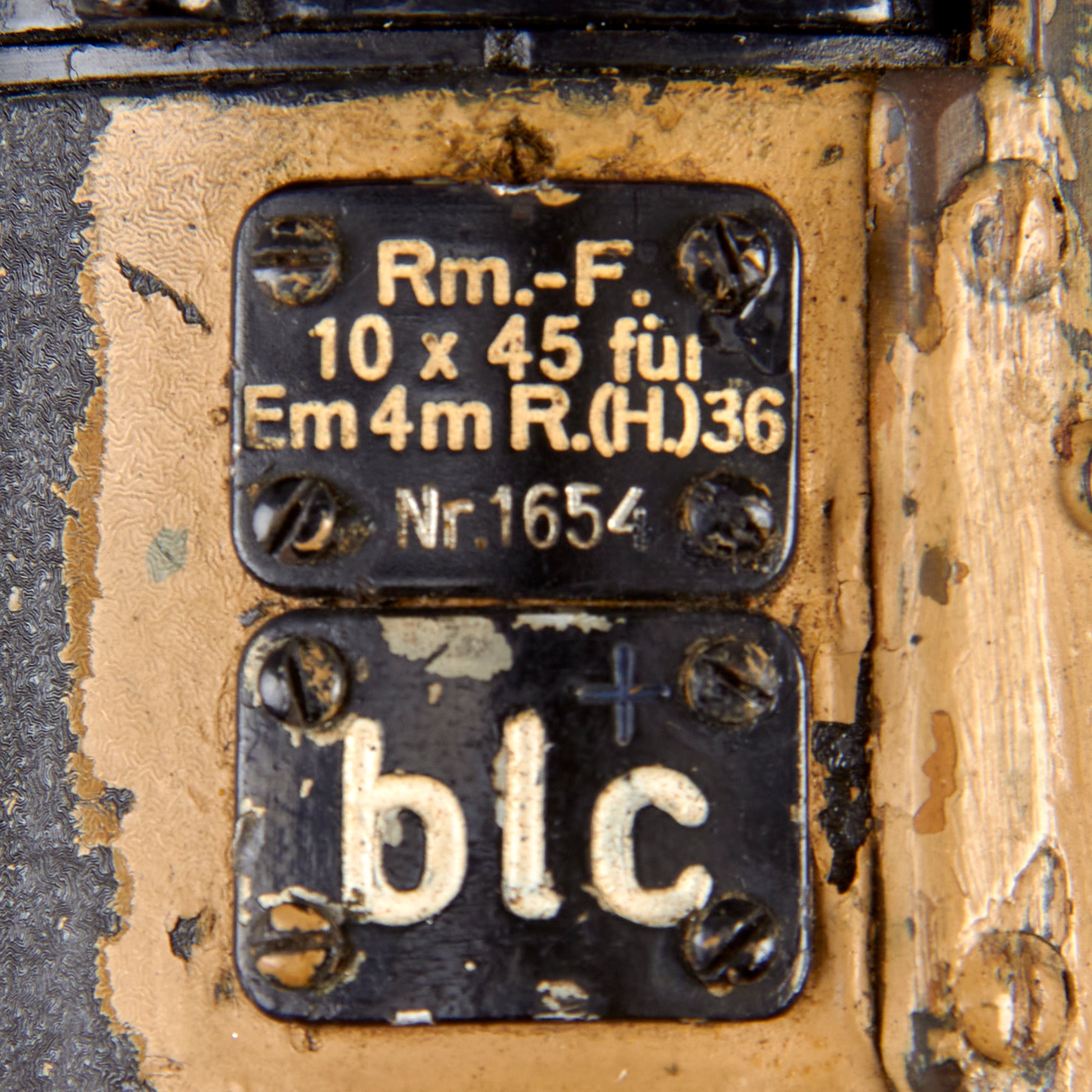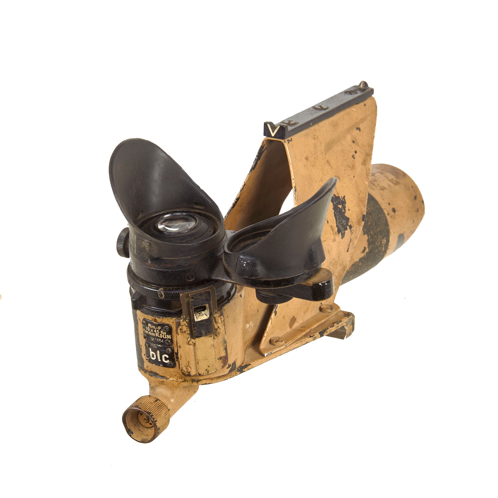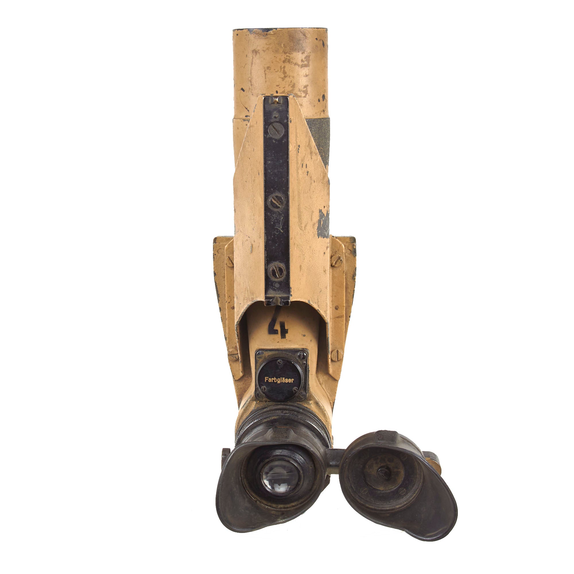 Original Items: Only One Set Available. This is a lovely example of a German WWII Richtungsweiser-Fernrohr (Directional Telescope or Rm-F.) 10×45, a tracking / spotting telescope used with the large Kommandogerät 36 (Kdo. Gr. 36) 8.8cm Flak Artillery Fire Director. This large apparatus was used to direct the fire of the Flak battery, and each of these were fitted with an Entfernungsmesser 4 meter Raumbild (Höhe) 36 or Em 4m R.(H.) 36 rangefinder. These were fitted with several surfaces where the tracking telescope could be attached. It is painted dunkelgelb tan at present, so it is very possible that it saw service in the North African or Italian campaigns.
