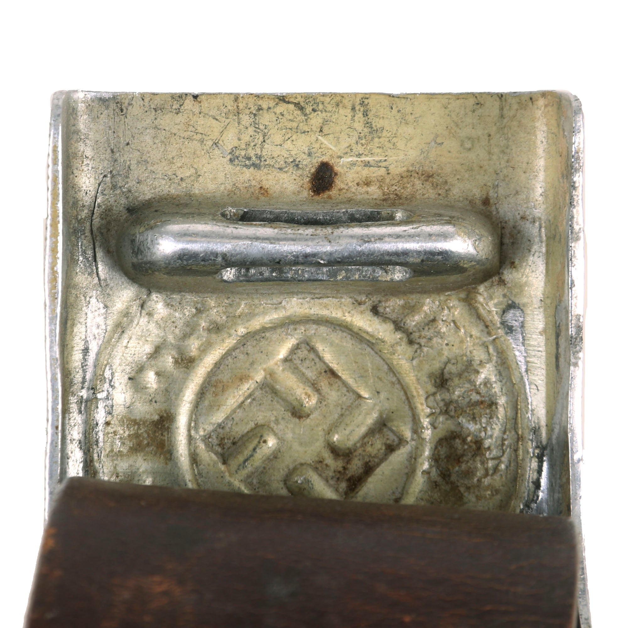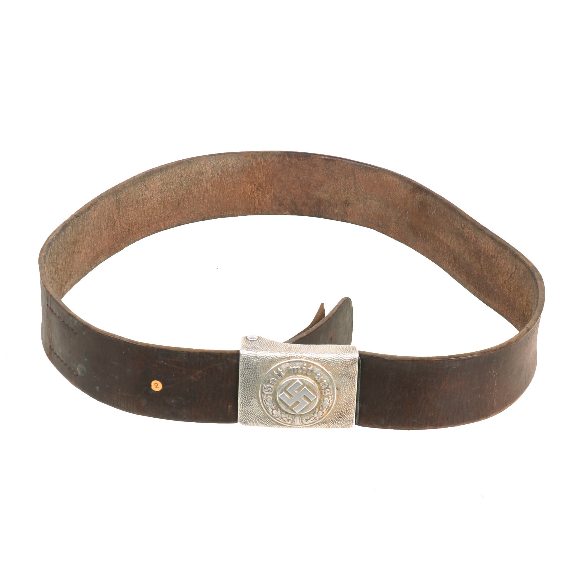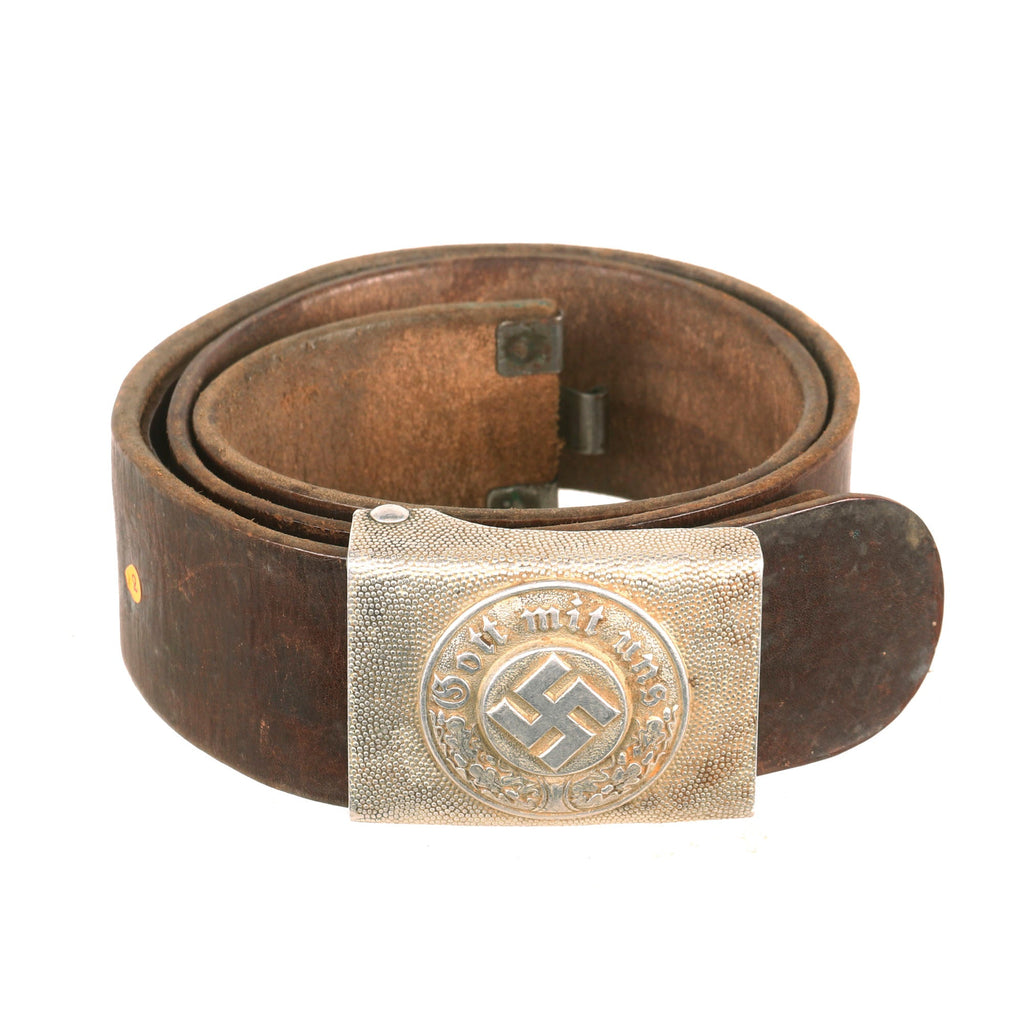 Original Item: Only One Available. This is a very nice WWII German Polizei (Police) NCO's Pebbled Aluminum Belt Buckle (Koppelschloß) with the correct leather belt. It is embossed with a central swas (hook cross), with a wreath around it bearing the motto Gott mit uns (God with us). Nice single piece injection molded aluminum construction box buckle with a pebbled background. The buckle is in very good condition, with all the pebbling in good condition, and most of the details in the wreath still present. There is no maker’s mark that we can see on the buckle.