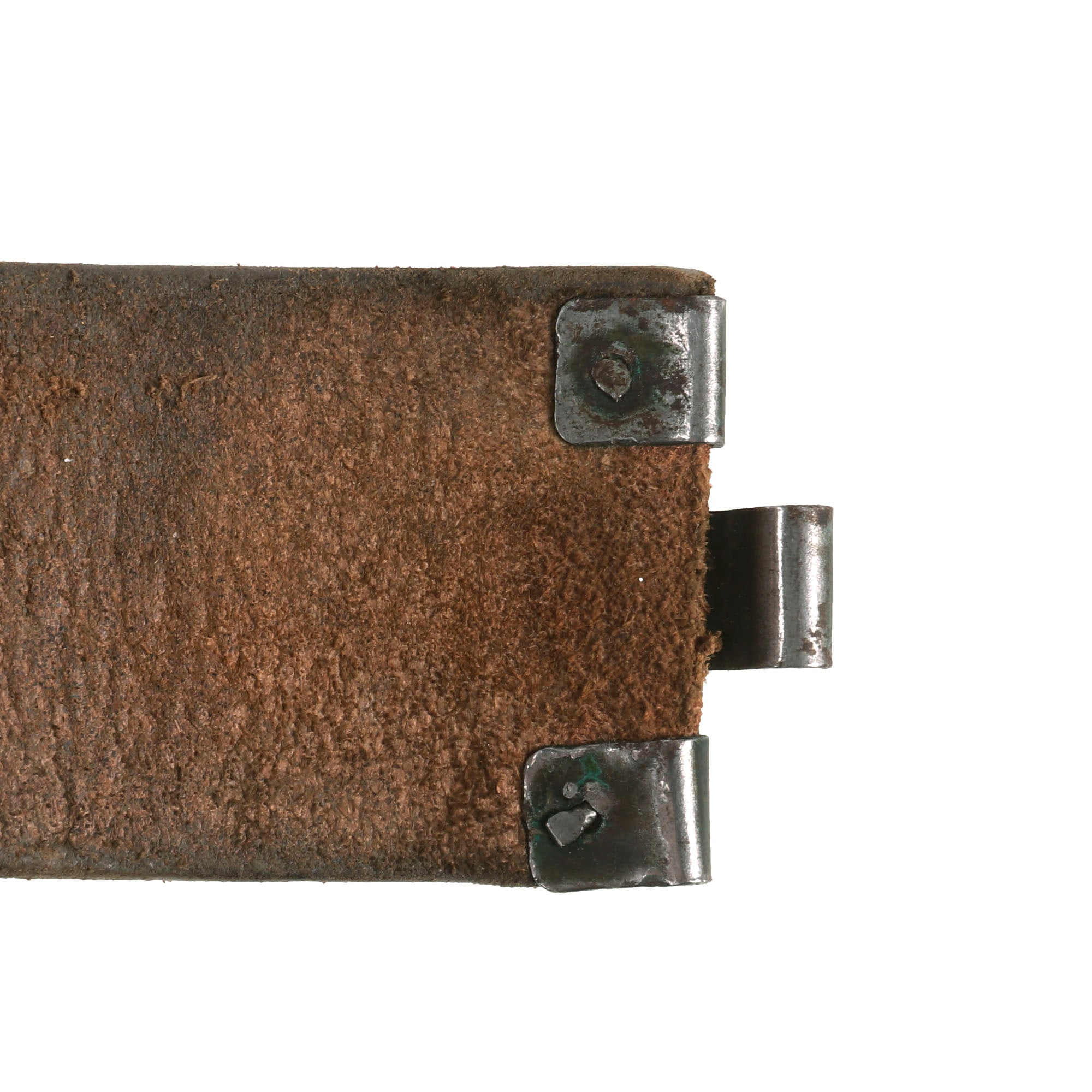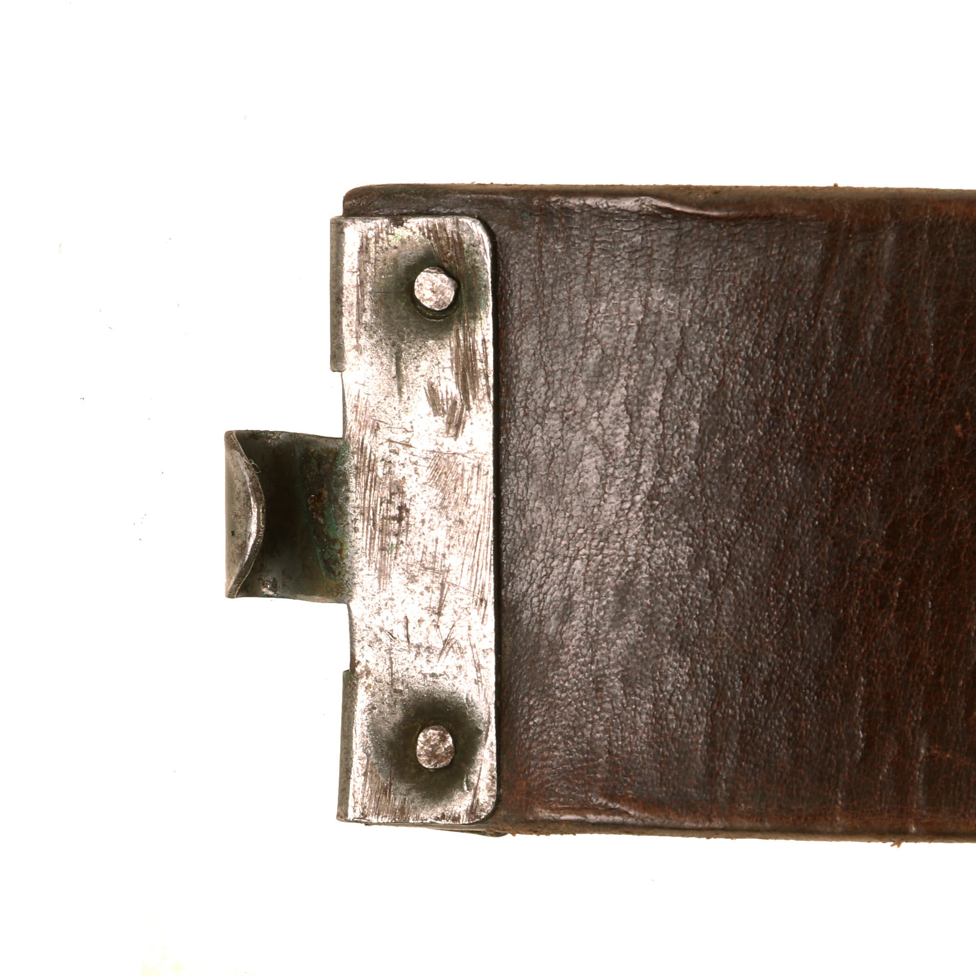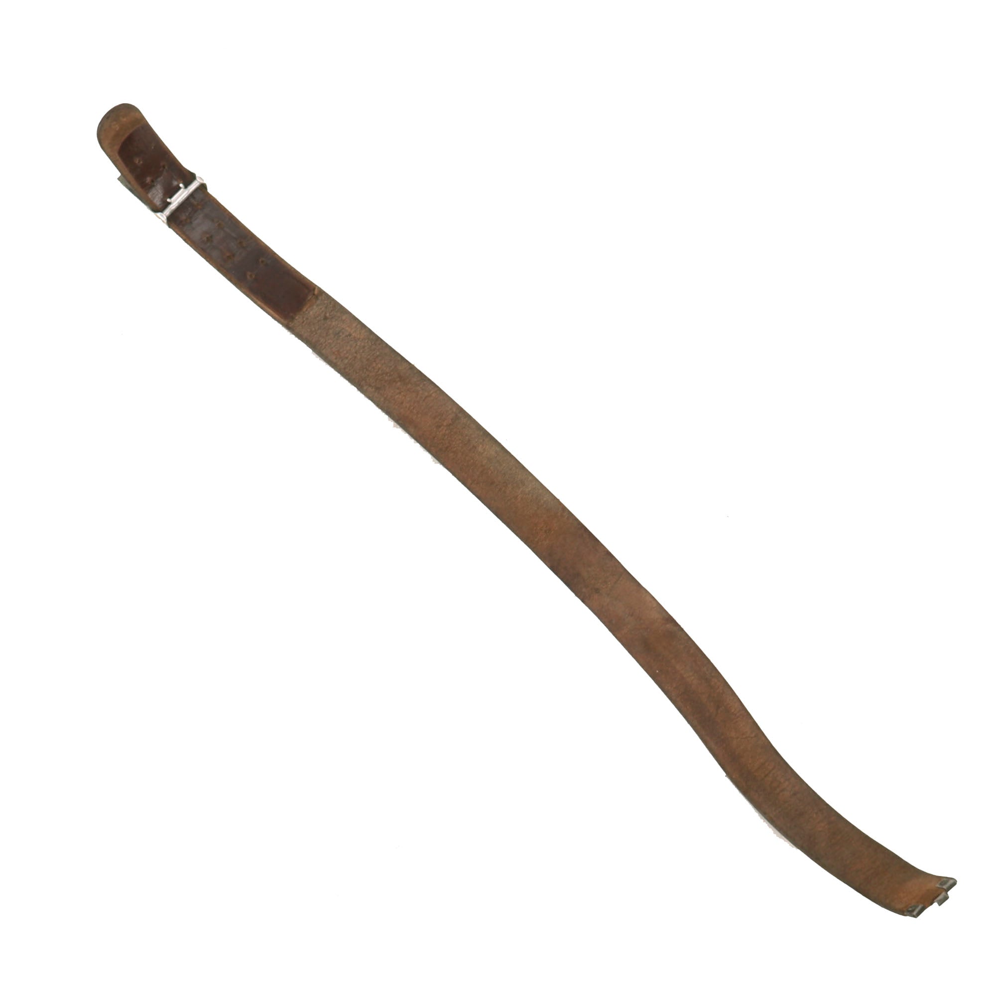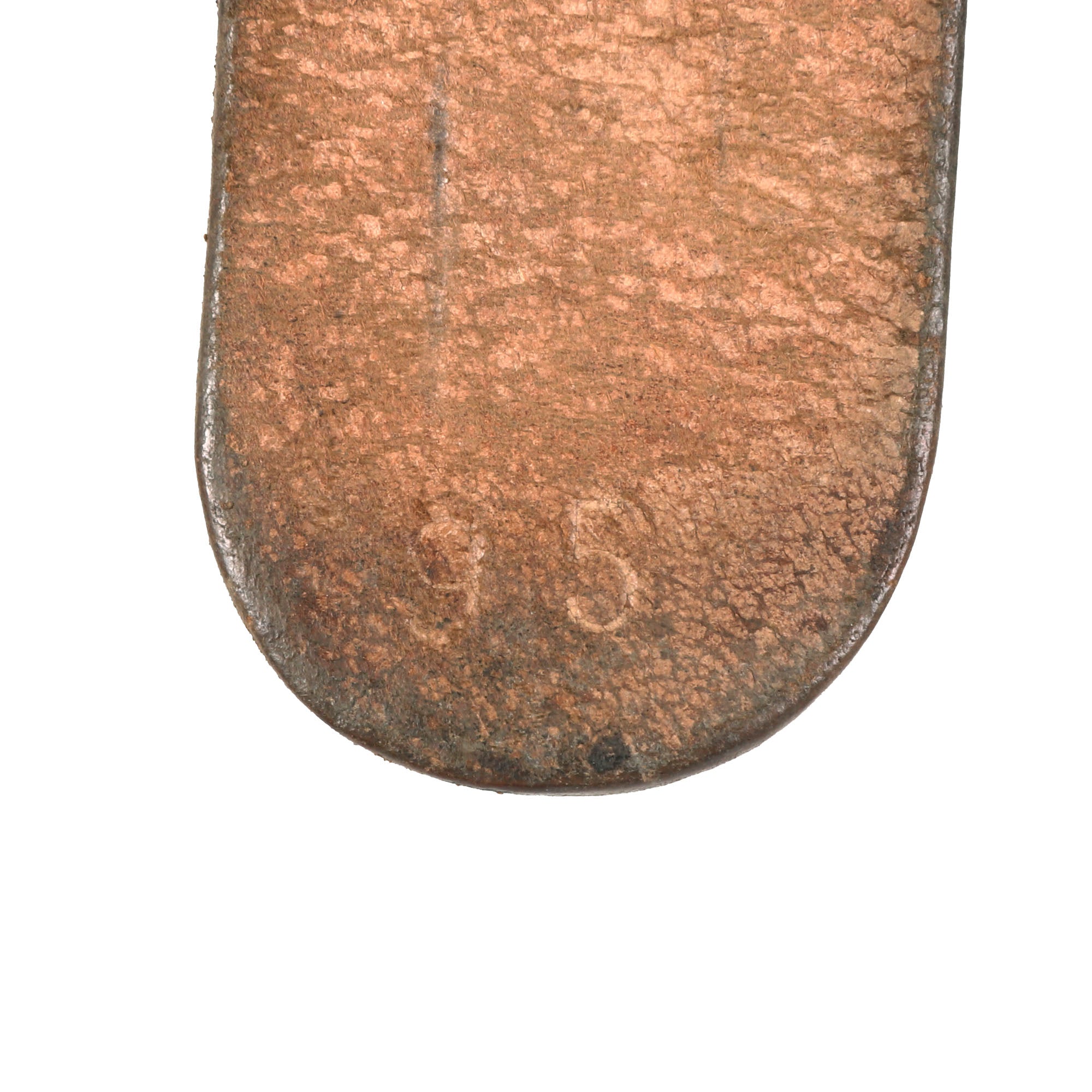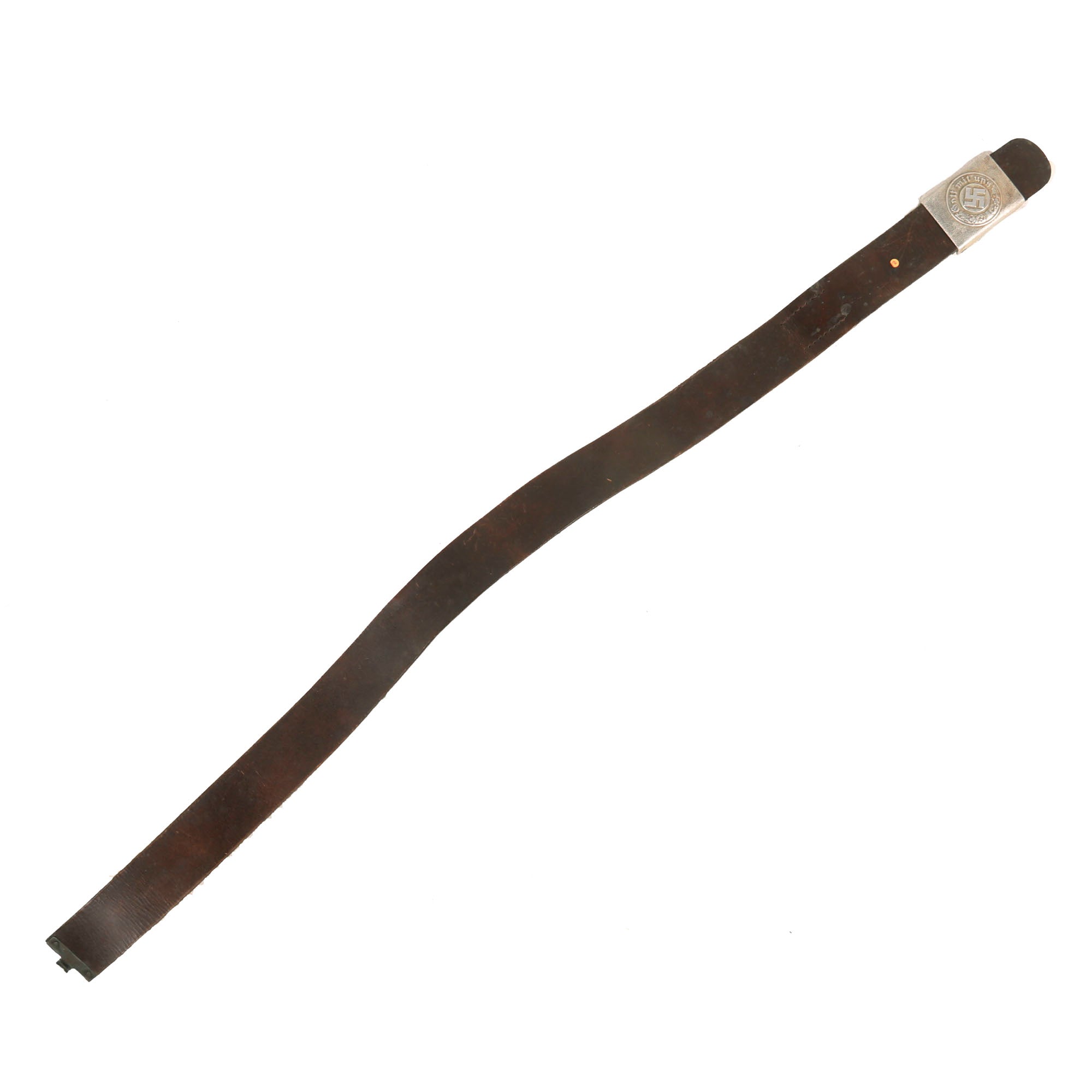 The belt itself measures about 38” when fully extended, and does show wear from long service, with the brown finish well retained. The leather is solid, with no tears or major cracks, but definitely shows deterioration from age. It is marked 95 on the buckle end, for 95cm (37.4 inches), and still retains the leather tab with a double row of 7 holes for size adjustment. The belt has no visible maker’s mark remaining. The brown leather finish indicates that the belt was for the Gendarmerie (Rural Police) or Polizeibeamten (Police Officials) personnel.