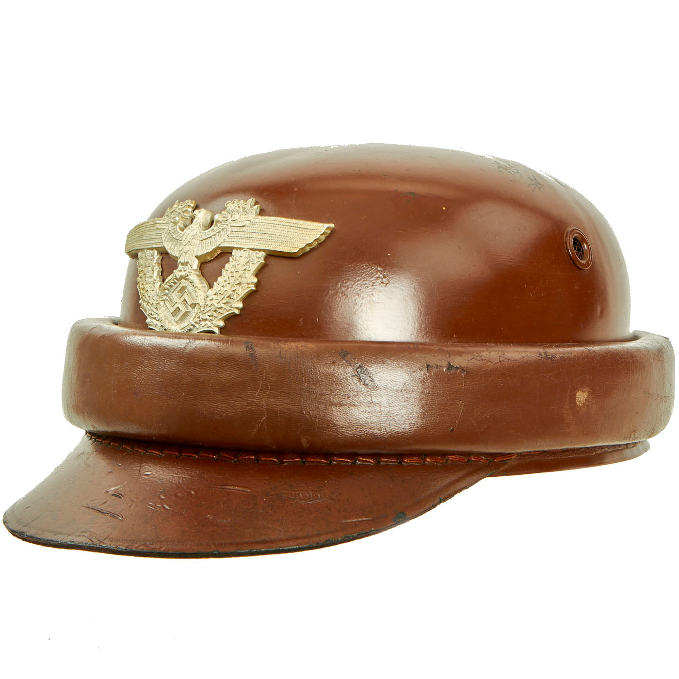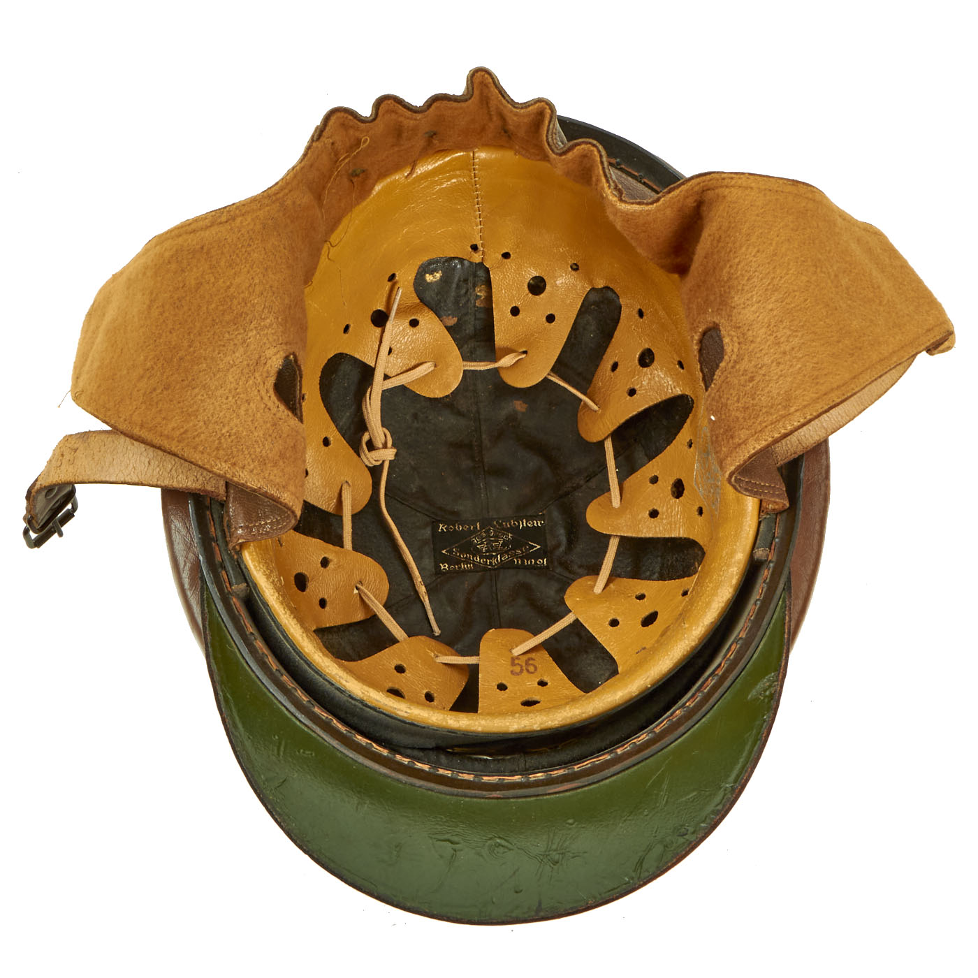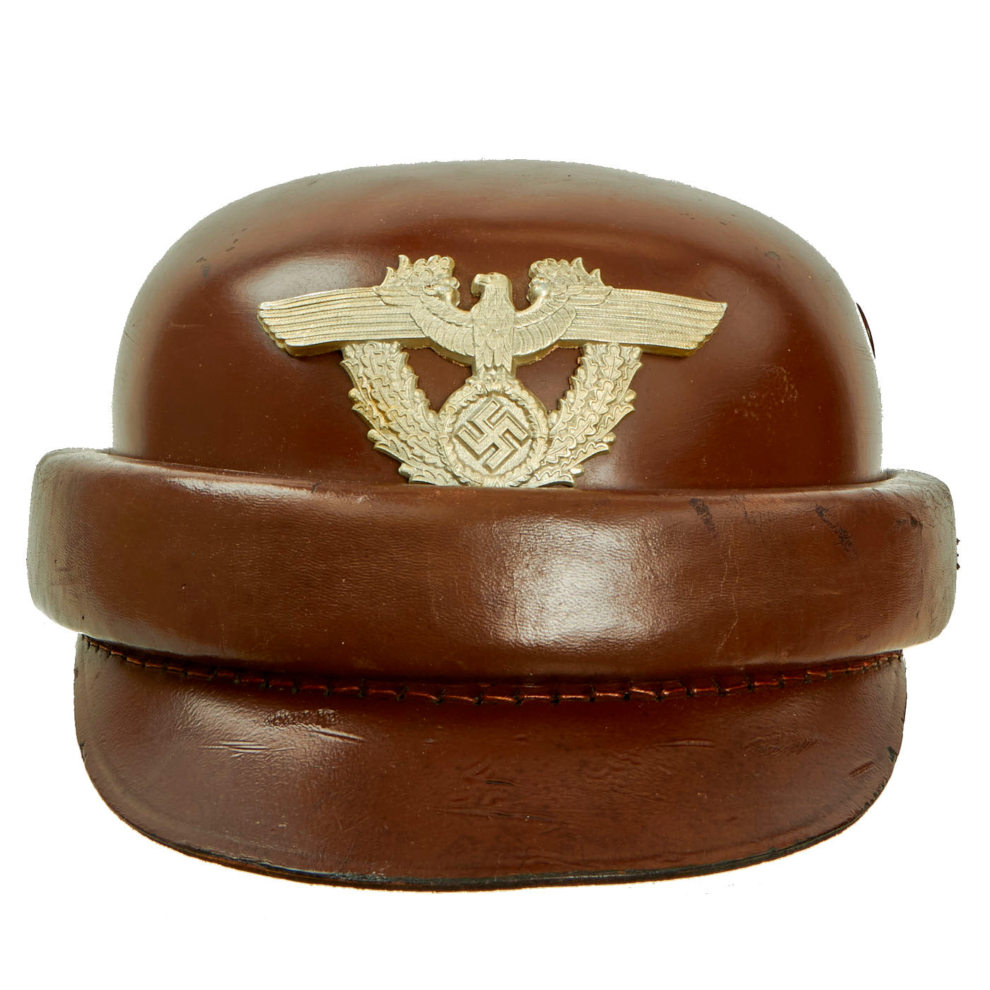 Front center of the helmet features a German WWII Police stylized national eagle, which looks to be silvered aluminum. The eagle is still held in its correct position, and has all of the silvering intact. Helmet has a short brown leather visor stitched to front and stitched on, extended, brown, grained, leather, protective side and rear panels. Side panels each have a vertical half-moon shaped, ear cut-out with stitched on closure flaps with functional snaps. Flaps were designed to protect the ears while still allowing for hearing. Rear neck flap intact. Side panels also have extended straps to bottoms which act as the chinstrap. Interior of the helmet has a tan leather nine finger liner. Liner is fully intact with all fingers and original tie string, and is marked with size 56.