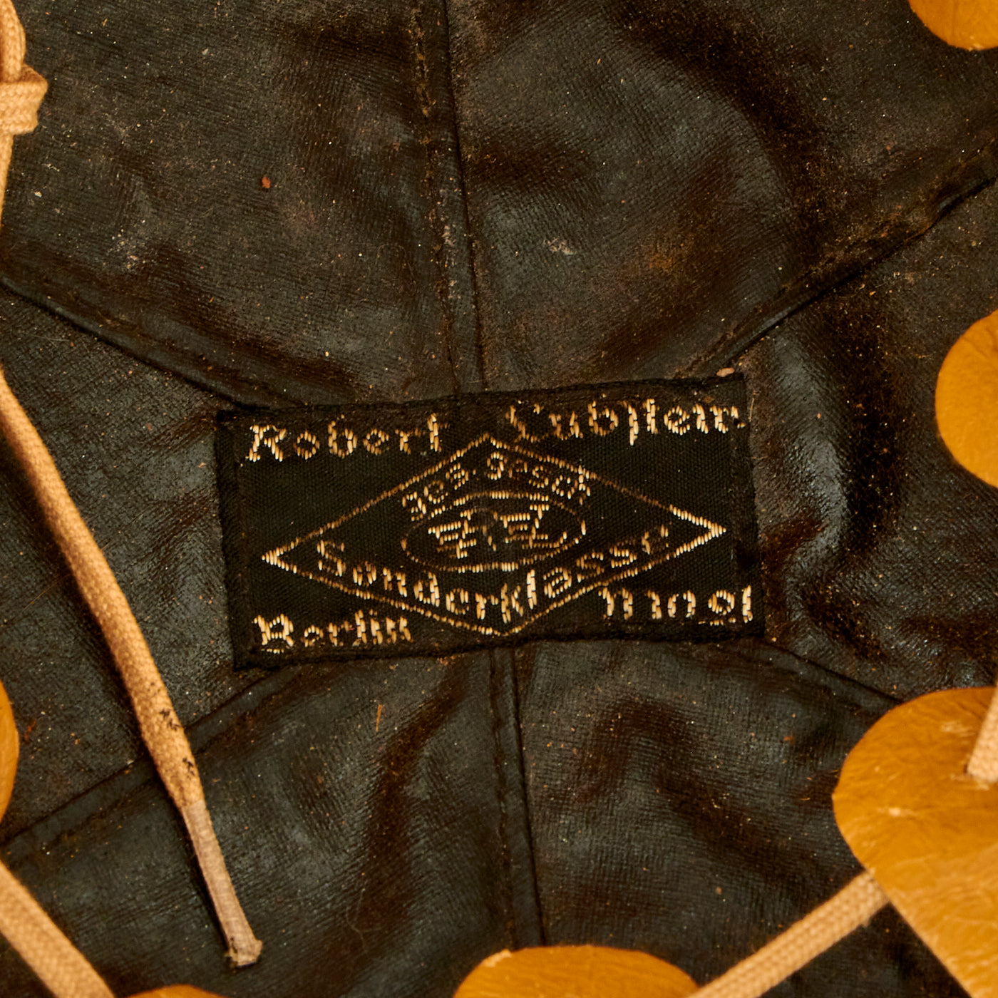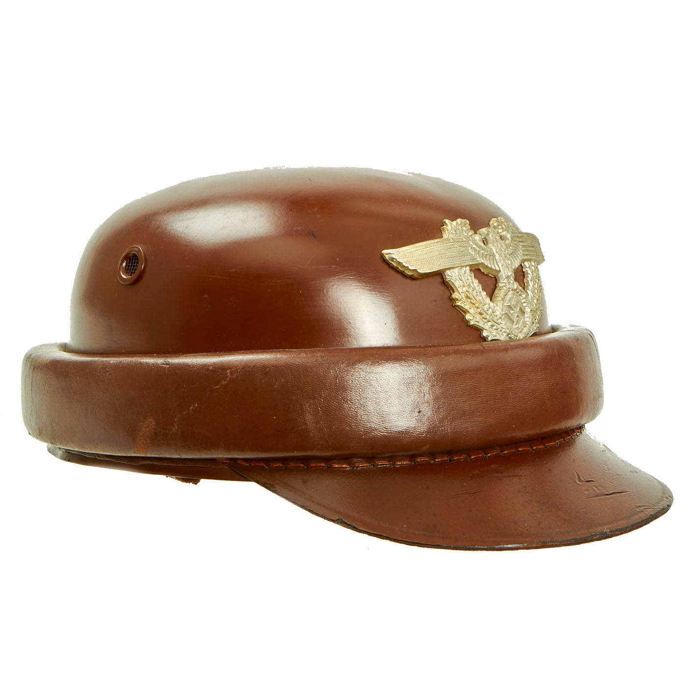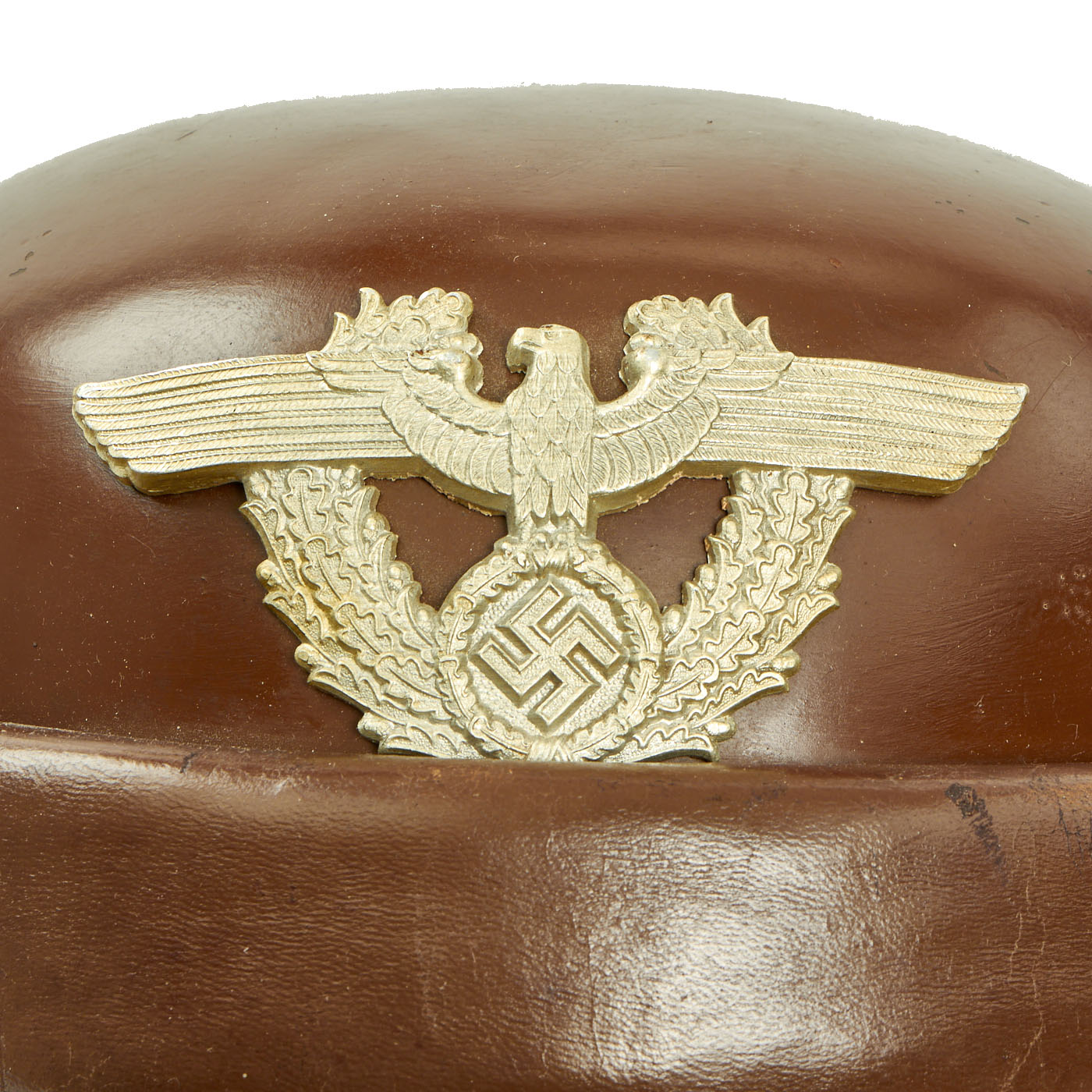Front center of the helmet features a German WWII Police stylized national eagle, which looks to be silvered aluminum. The eagle is still held in its correct position, and has all of the silvering intact. Helmet has a short brown leather visor stitched to front and stitched on, extended, brown, grained, leather, protective side and rear panels. Side panels each have a vertical half-moon shaped, ear cut-out with stitched on closure flaps with functional snaps. Flaps were designed to protect the ears while still allowing for hearing. Rear neck flap intact. Side panels also have extended straps to bottoms which act as the chinstrap. Interior of the helmet has a tan leather nine finger liner. Liner is fully intact with all fingers and original tie string, and is marked with size 56.