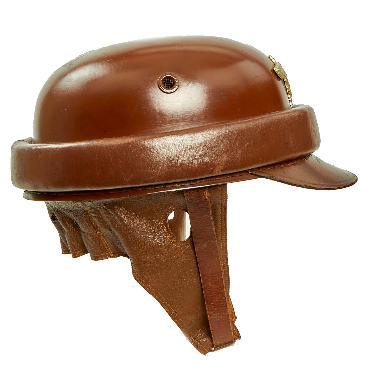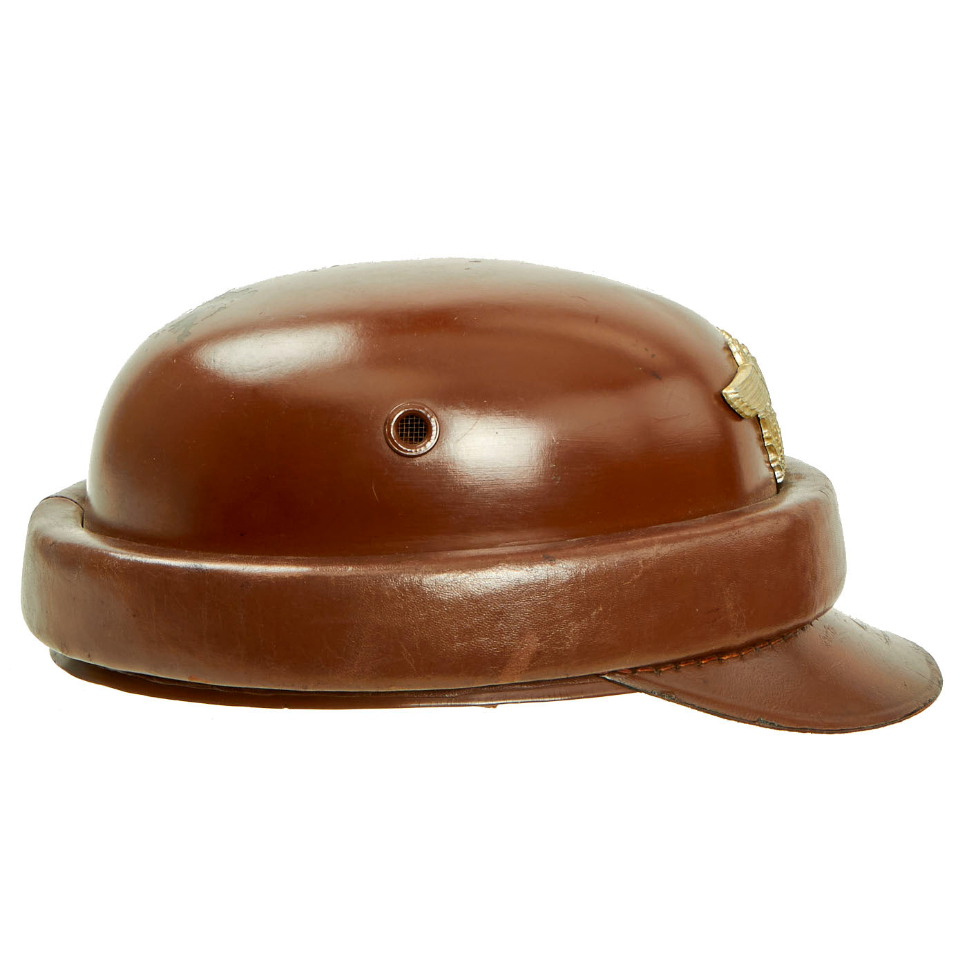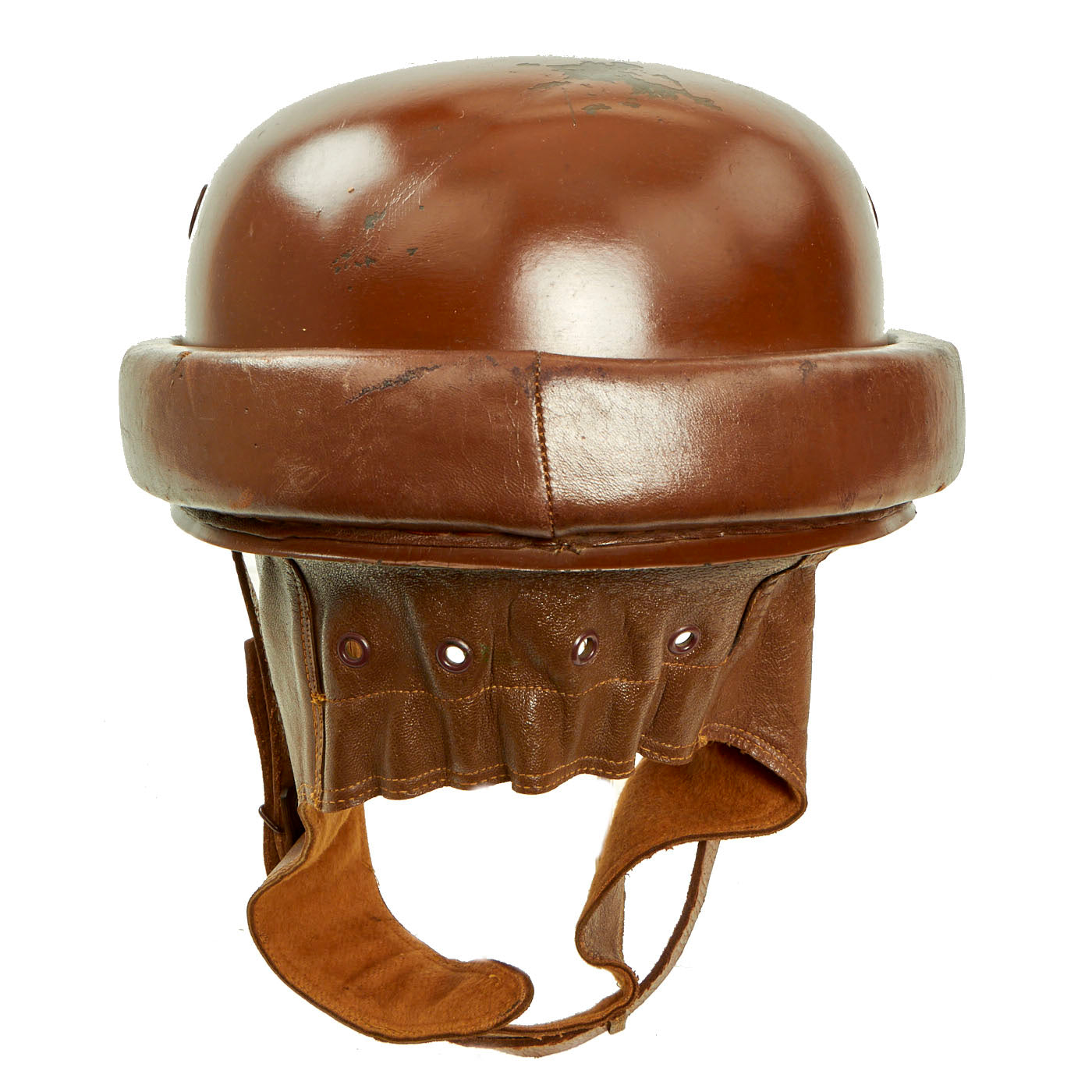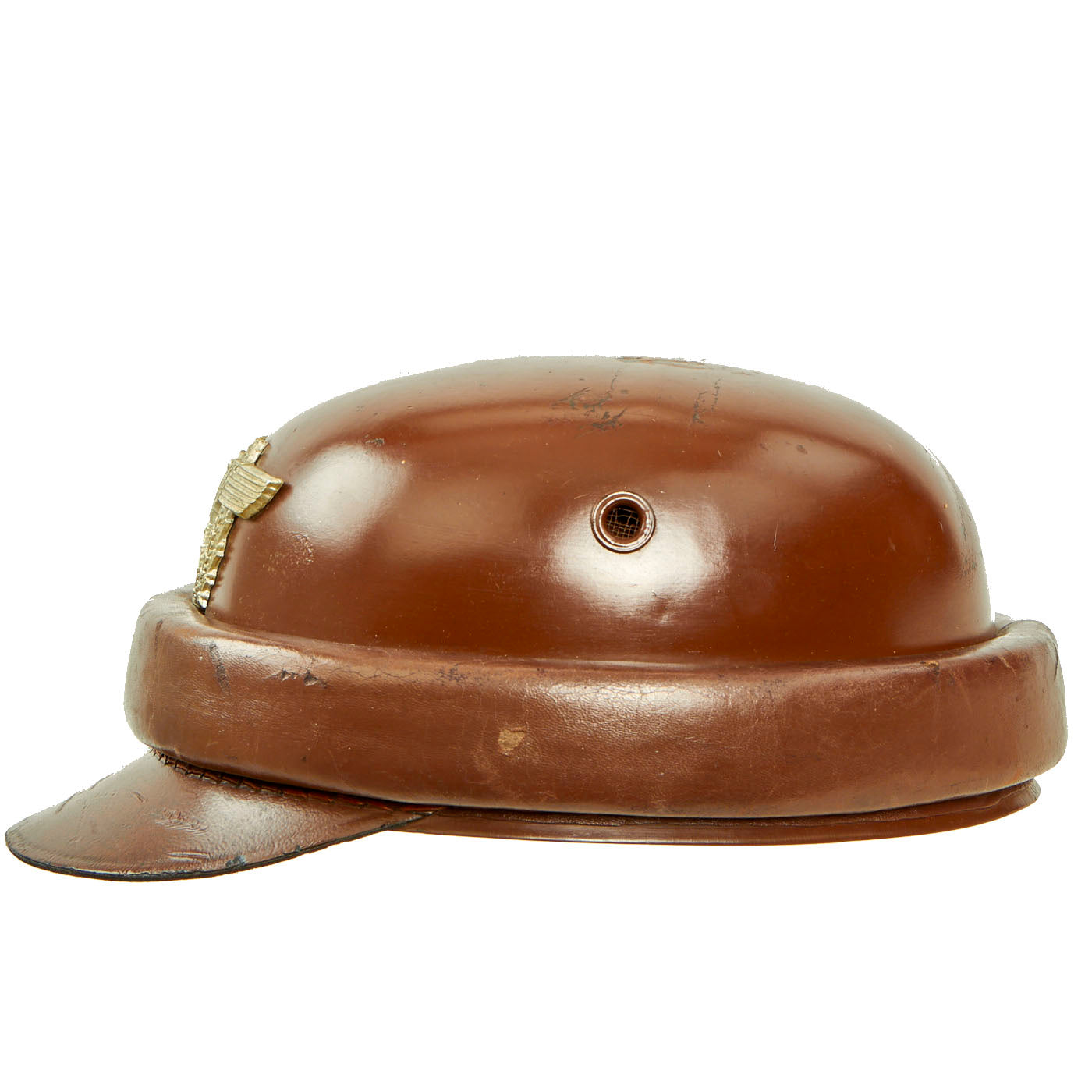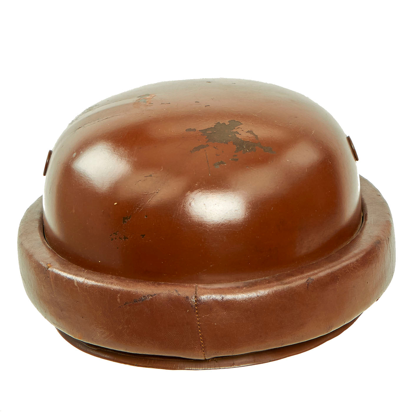 Original Item: Only One Available. This is a very nice, genuine WWII Rural Police Motorcycle Crash Helmet in brown. It is a molded, smooth, brown leather helmet with raised padded protective bars running horizontally around the helmet's bottom edge, and another one running from front to back over the crown top. Helmet has ventilation grommets with a screen to each side of the crown. These are identical to the "Metropolitan issue", except that they are brown, and not black.