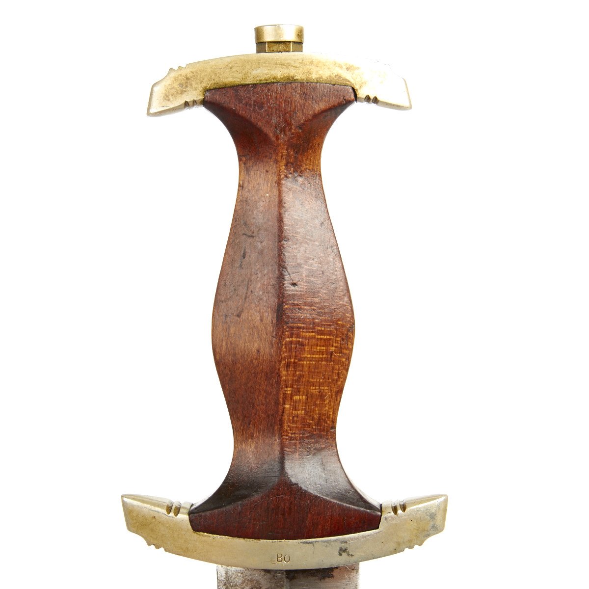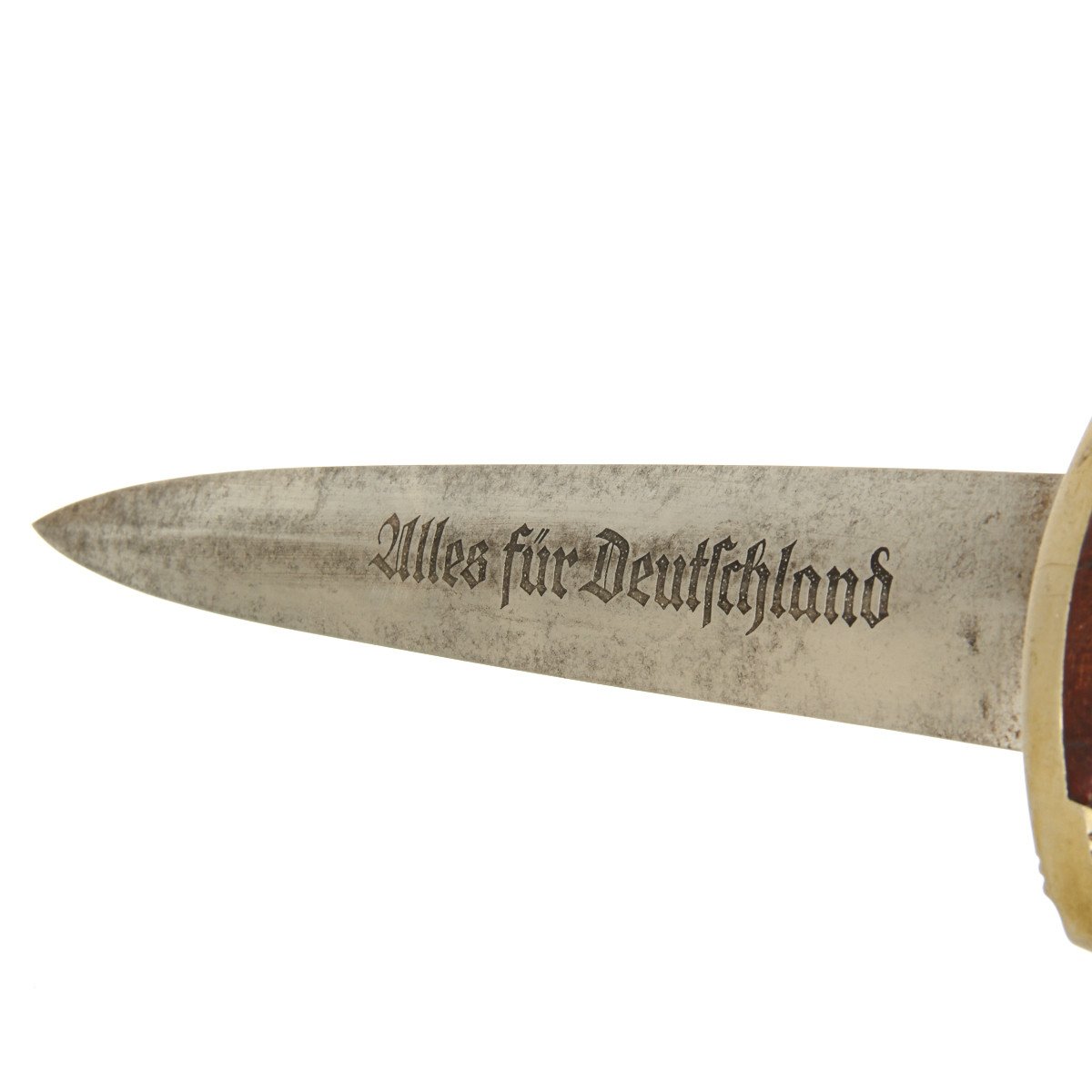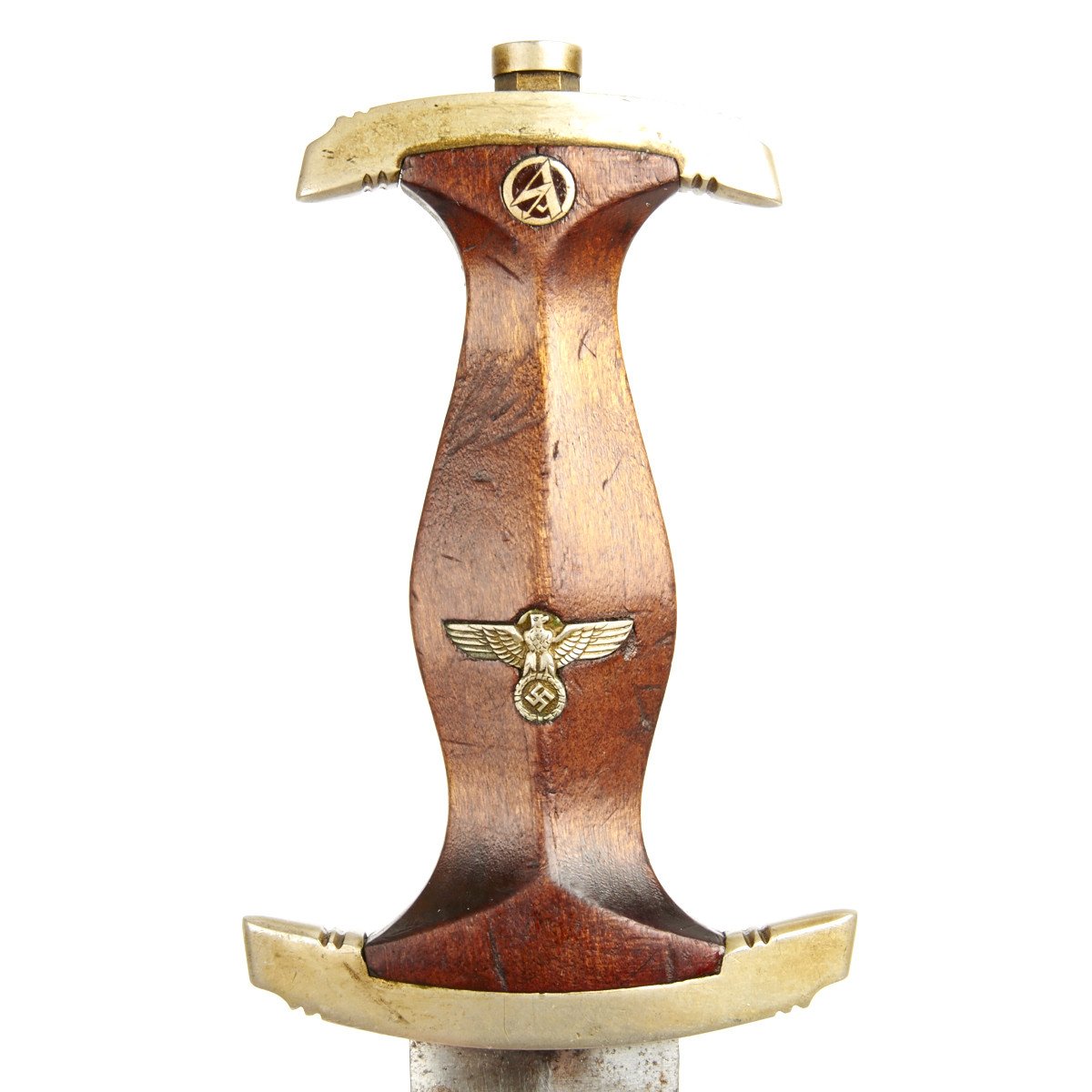 The blade was etched with the SA motto, Alles für Deutschland. Examples produced prior to 1935 were stamped with the German sector of the SA group on reverse lower crossguard. Later examples underwent standardization through the RZM ministry. These pieces were produced of cheaper plated zinc-base fittings and scabbards were simply painted brown.