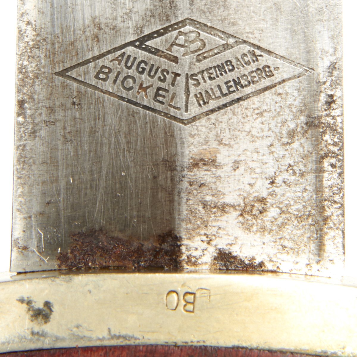 The ricasso features the quadrilateral trademark of this firm, looking very much like a pair of isosceles triangles fused together along the bottom. The upper portion of the diamond has the firm's intertwined initials, AB. Below this is a reflex angle that separates the initials from the firm's name and location August Bickel / Steinbach Hallenberg which are also set at angles to each other. The blade shoulder perfectly meet the lower crossguard contours.