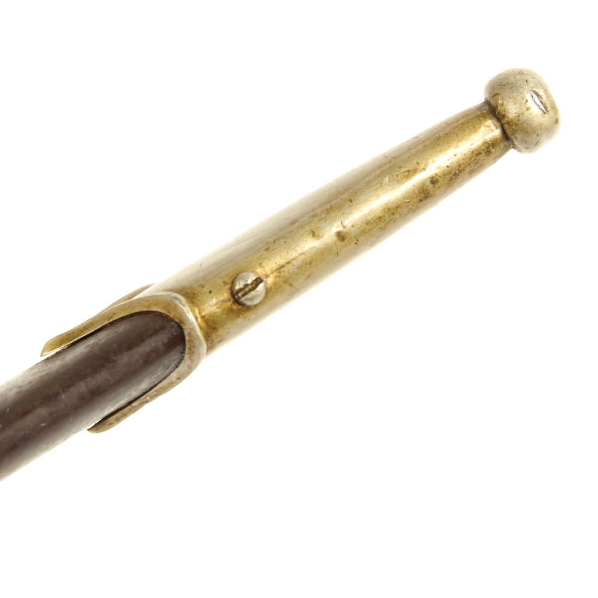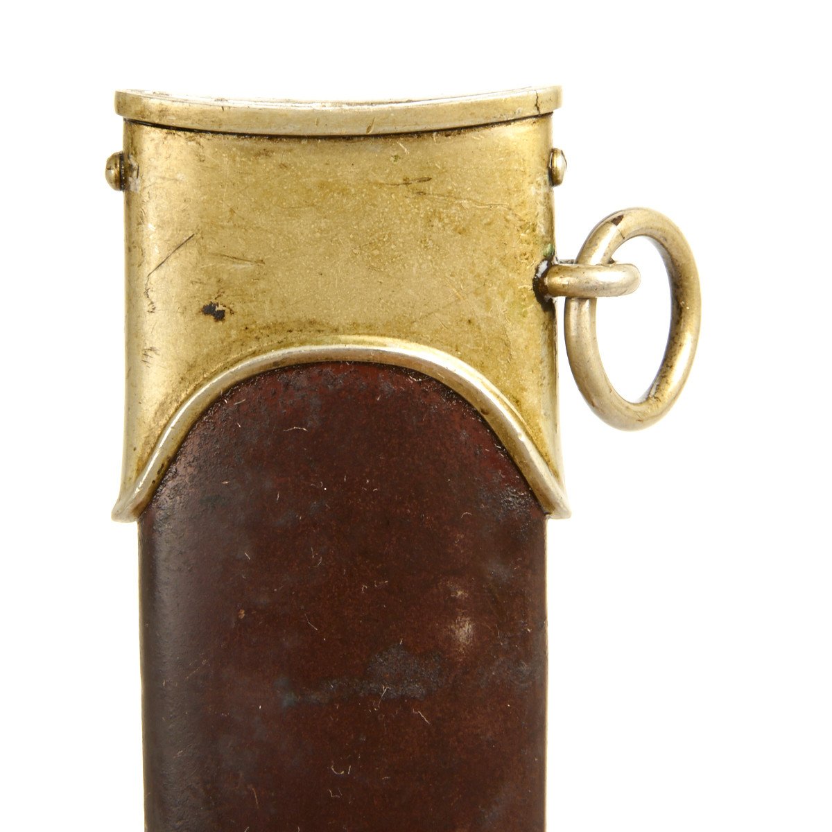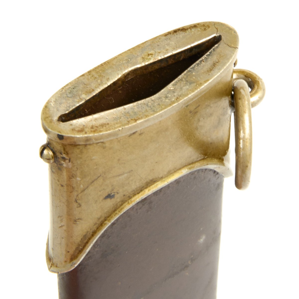 The scabbard shell is straight on the obverse facing, while the reverse has a very minor dent. The anodizing is still mostly intact but is beginning to thin. The matching nickel scabbard mounts are in good condition through to the lower ball. They are retained by four nickel screws which are all unturned.