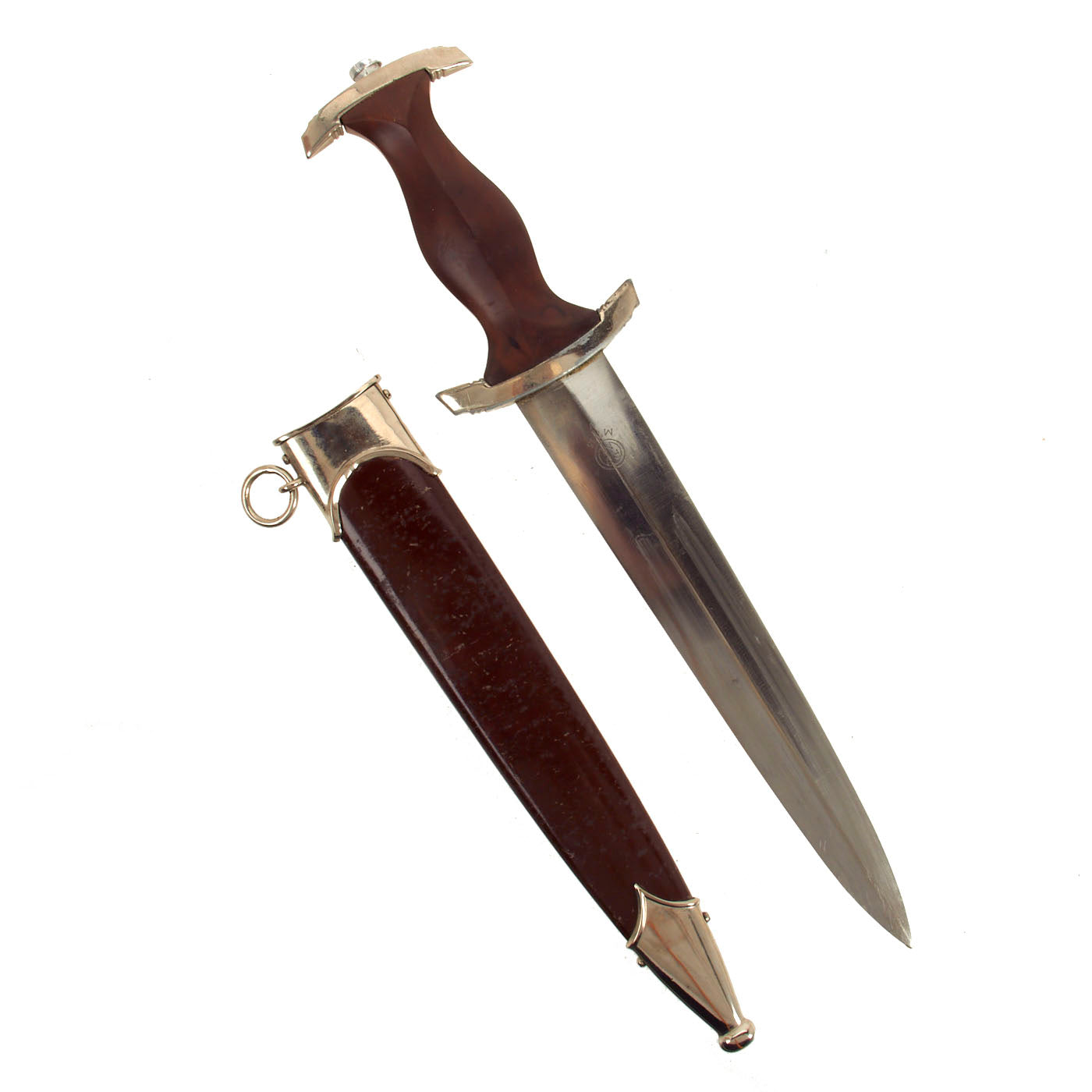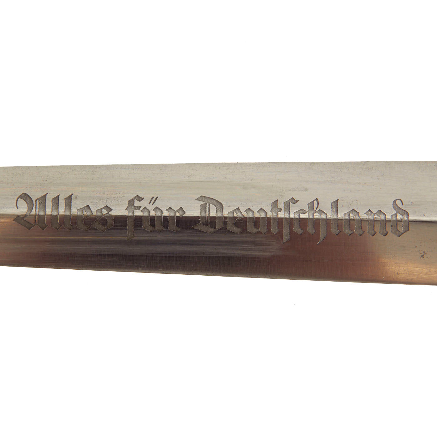 The blade was etched with the SA motto, Alles für Deutschland. Examples produced prior to 1935 were stamped with the German sector of the SA group on reverse lower crossguard. Later examples underwent standardization through the RZM ministry. These pieces were produced of cheaper plated zinc-base fittings and scabbards were simply painted brown.