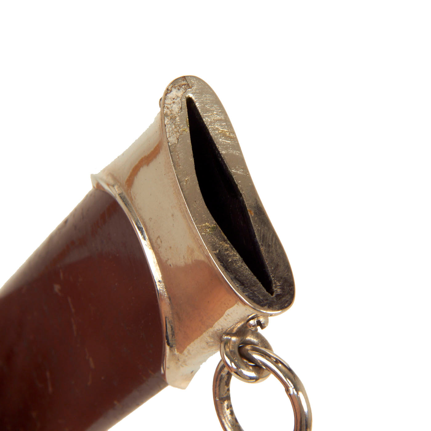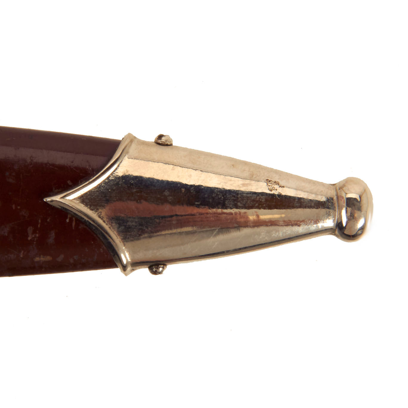 The scabbard shell is straight throughout and has very good original brown enamel paint. It has just a bit of scuffing and the usual crazing and checking in the finish, with only small areas of finish damage. The scabbard shell is equipped with fine matching plated steel mounts, which show only light wear and oxidation, though the bottom "ball" has a few small dents They nicely match the crossguards and are complete with all four dome head screws.