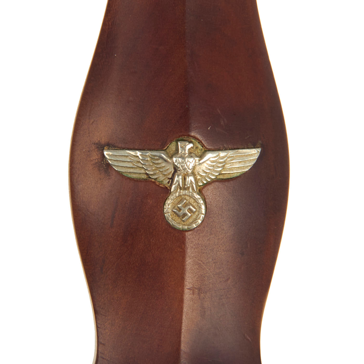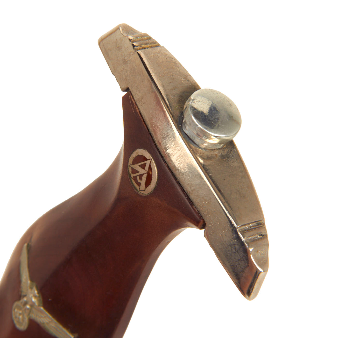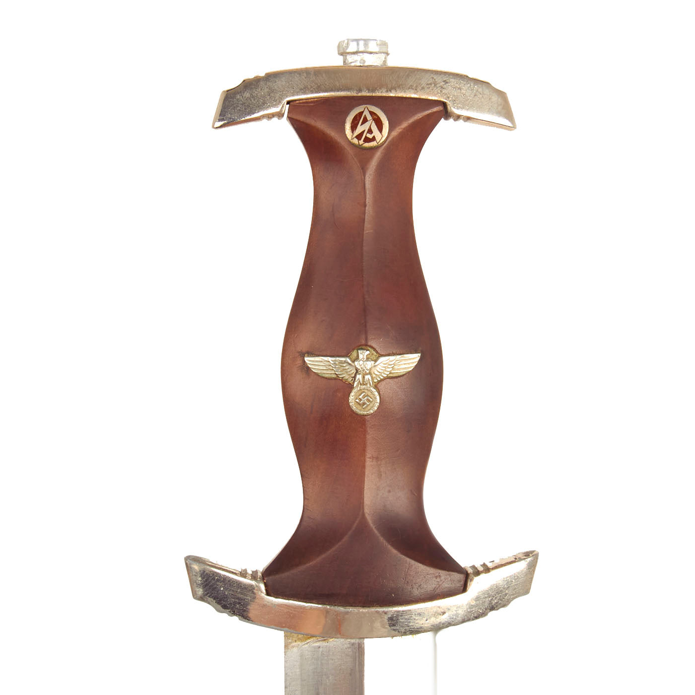 The grip is in excellent condition, having a fine brown colored mahogany tone in the surfaces and having medium center ridge construction. This grip is in very good condition with nice grain, and fits the crossguards well. Aside from some small pressure dents, the grip is close to unissued, with no cracking or chips. The SA symbol button is nicely, with intact enamel, and the plating intact with a bit of oxidation at the bottom. The details are still there to the inlaid eagle, including the beak, breast feathering, wing feathering, talons, wreath and mobile swas (hook cross). It looks to be the later war style aluminum eagle.