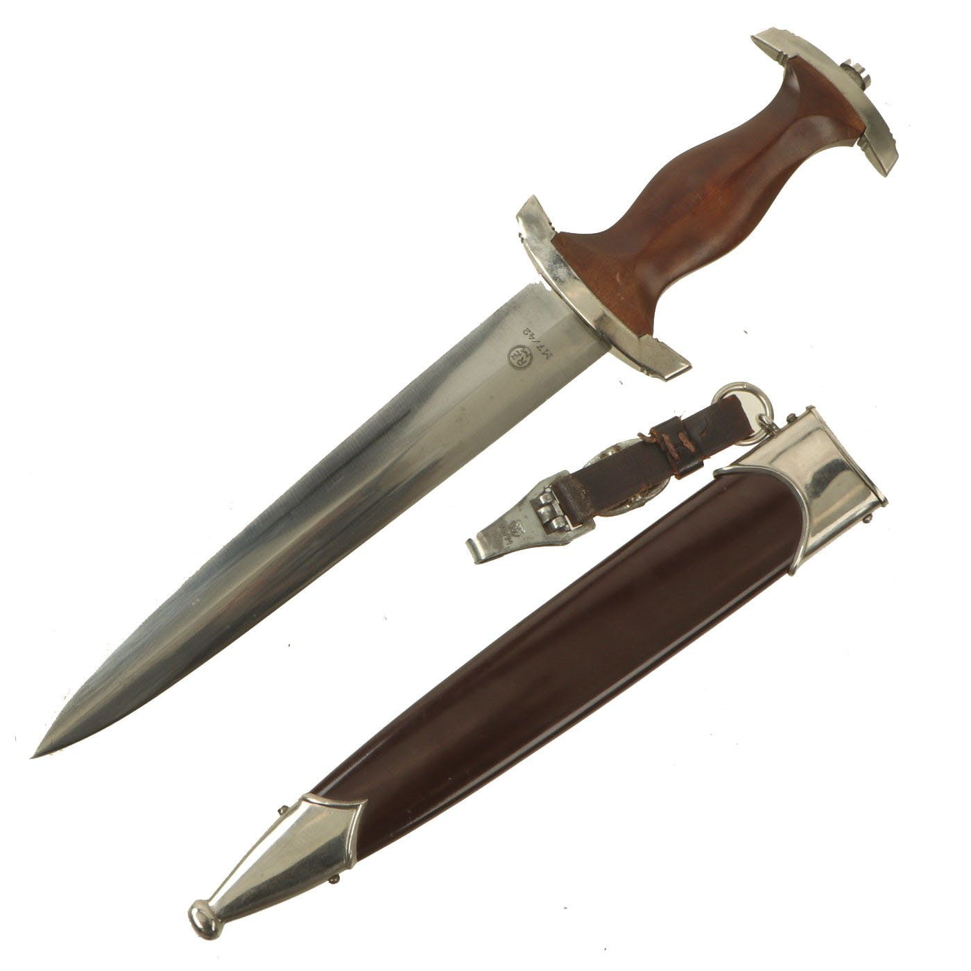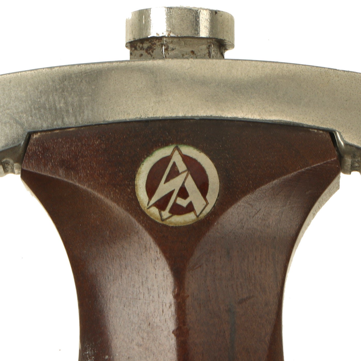 Original Item: Only One Available. This excellent condition mid war period produced SA Dagger has nickel-plated fittings throughout. The crossguards and tang nut are nickel plated zinc alloy, and have almost all of their plating intact, something we rarely see. Even the areas against the wood have not oxidized, which is quite rare. Only the steel tang nut has plating loss and oxidation.