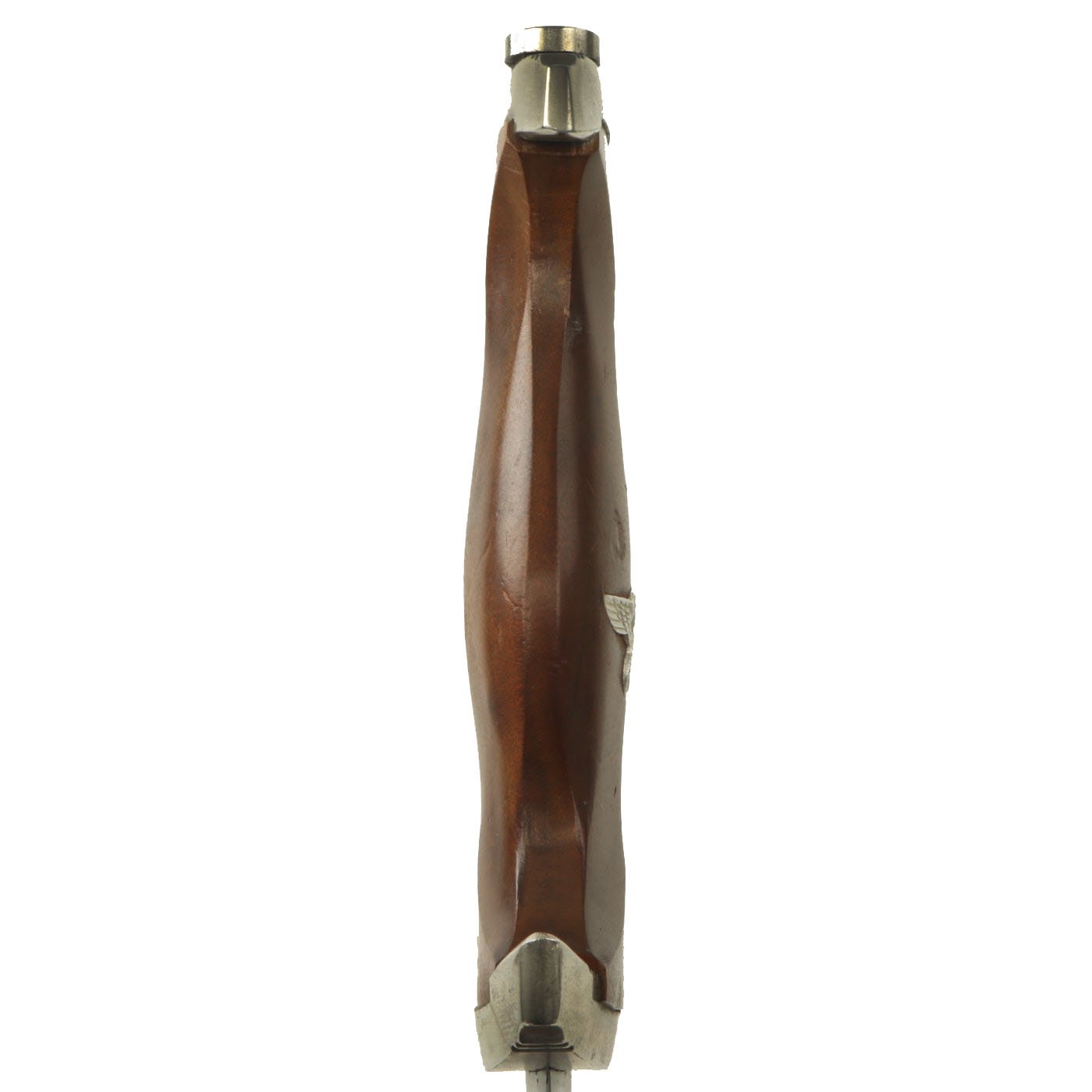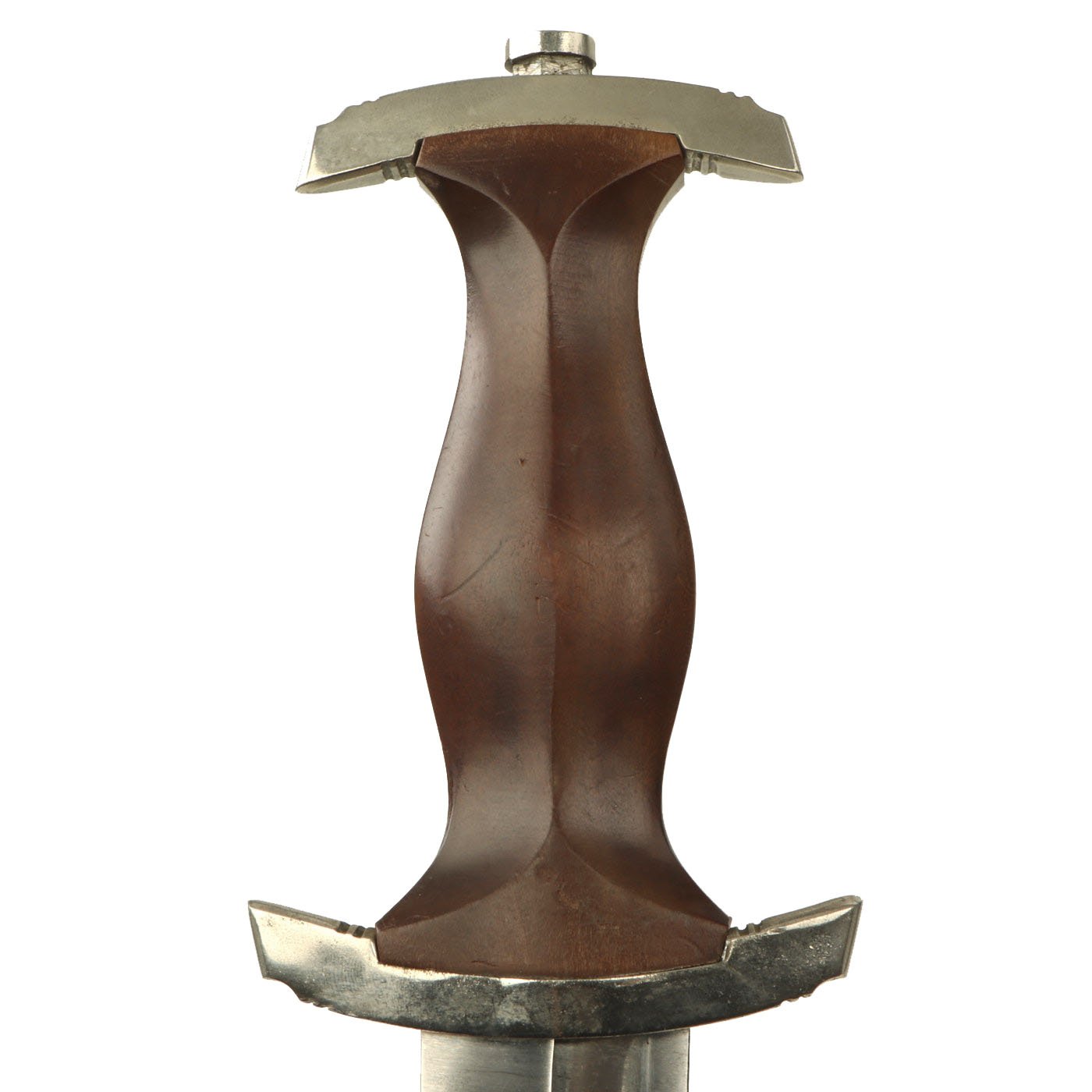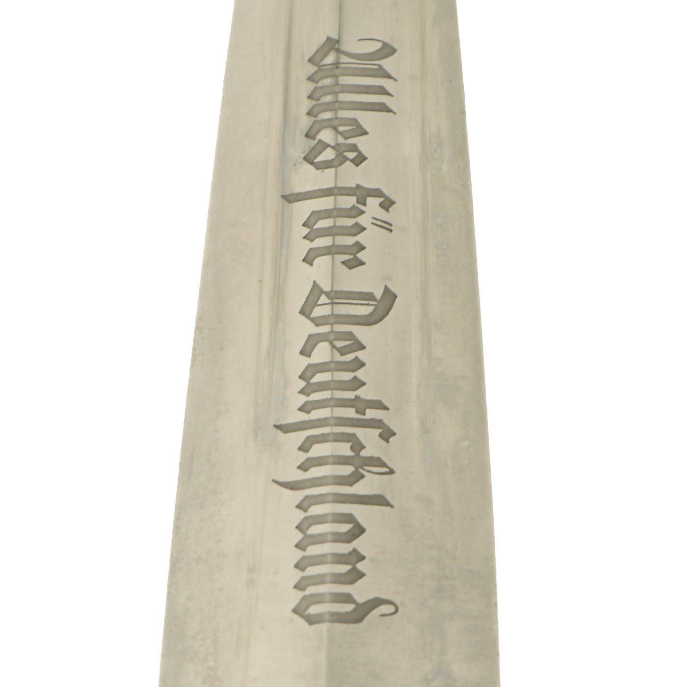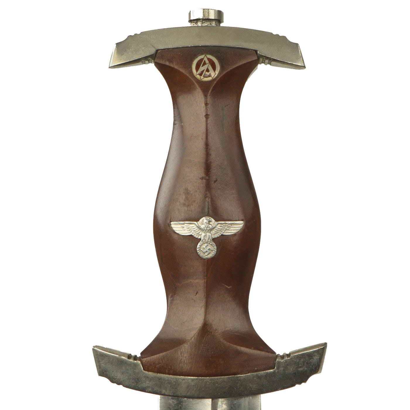 The blade was etched with the SA motto, Alles für Deutschland. Examples produced prior to 1935 were stamped with the German sector of the SA group on reverse lower crossguard. Later examples underwent standardization through the RZM ministry. These pieces were produced of cheaper plated zinc-base fittings and scabbards were simply painted brown.
