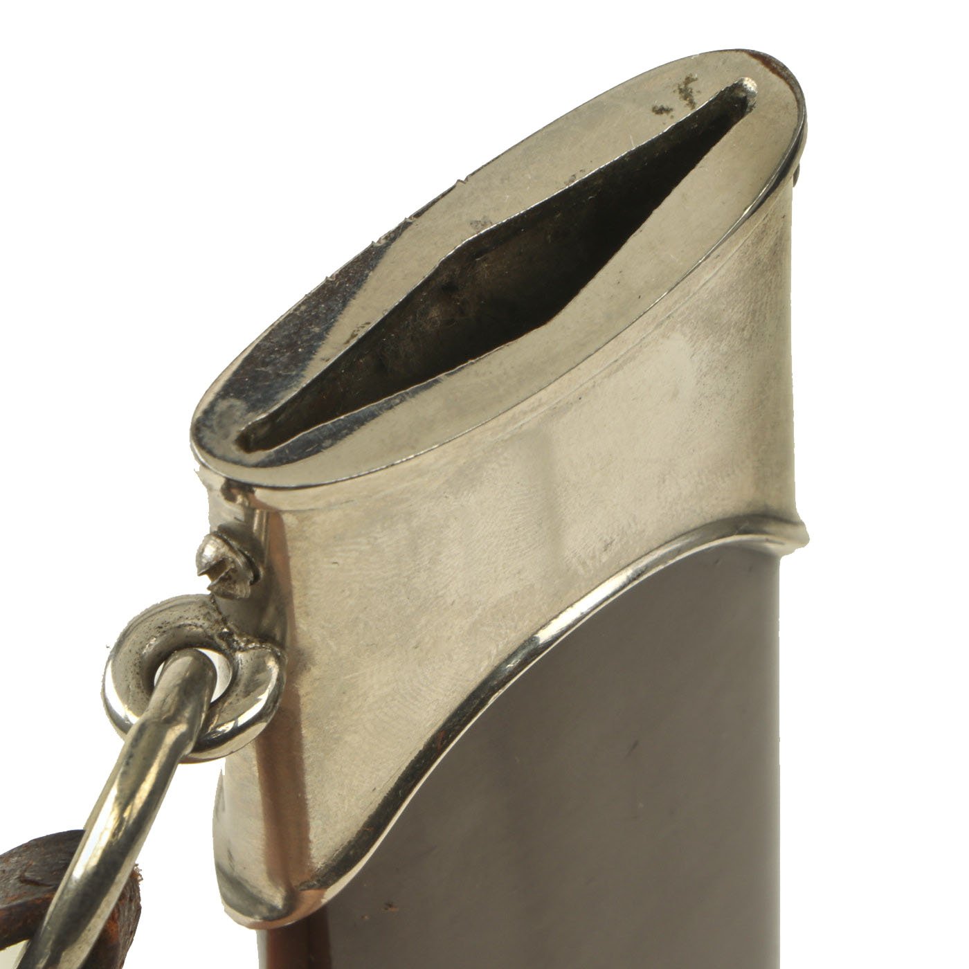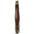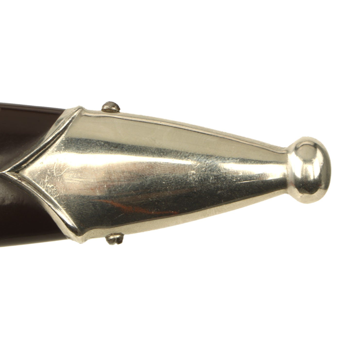 The scabbard shell is straight throughout and has very good original brown enamel paint. It has just a bit of scuffing and crazing in the finish, with no areas of finish loss. The scabbard shell is equipped with fine matching nickel-plated steel mounts. These mounts are in very good condition overall, with only light plating wear. They nicely match the crossguards and are complete with all four dome head screws. There is a leather hanger loop with a spring clip attached to the scabbard. The leather is somewhat dry and cracked, and the steel spring clip has plating wear through.
