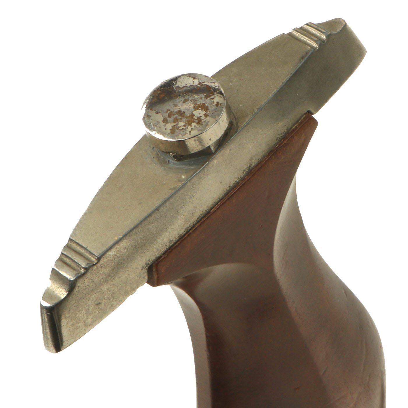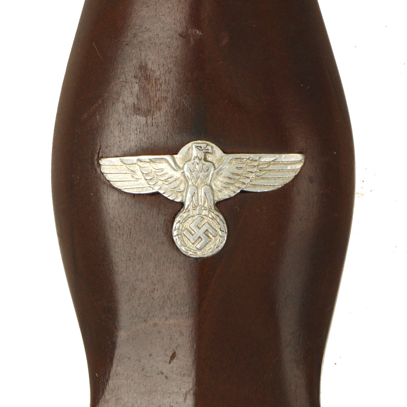 The grip is a fine product having a fine reddish colored mahogany tone in the surfaces and having medium center ridge construction. This grip is in very good condition with great grain, and fits the crossguards well. There is no chipping or cracking, just some pressure scratches and dents. The SA symbol button is nicely set having fully intact enameling, and the plating intact with just a bit of oxidation as shown. The details are still there to the inlaid aluminum eagle, including the beak, breast feathering, wing feathering, talons, wreath and mobile swas (hook cross).