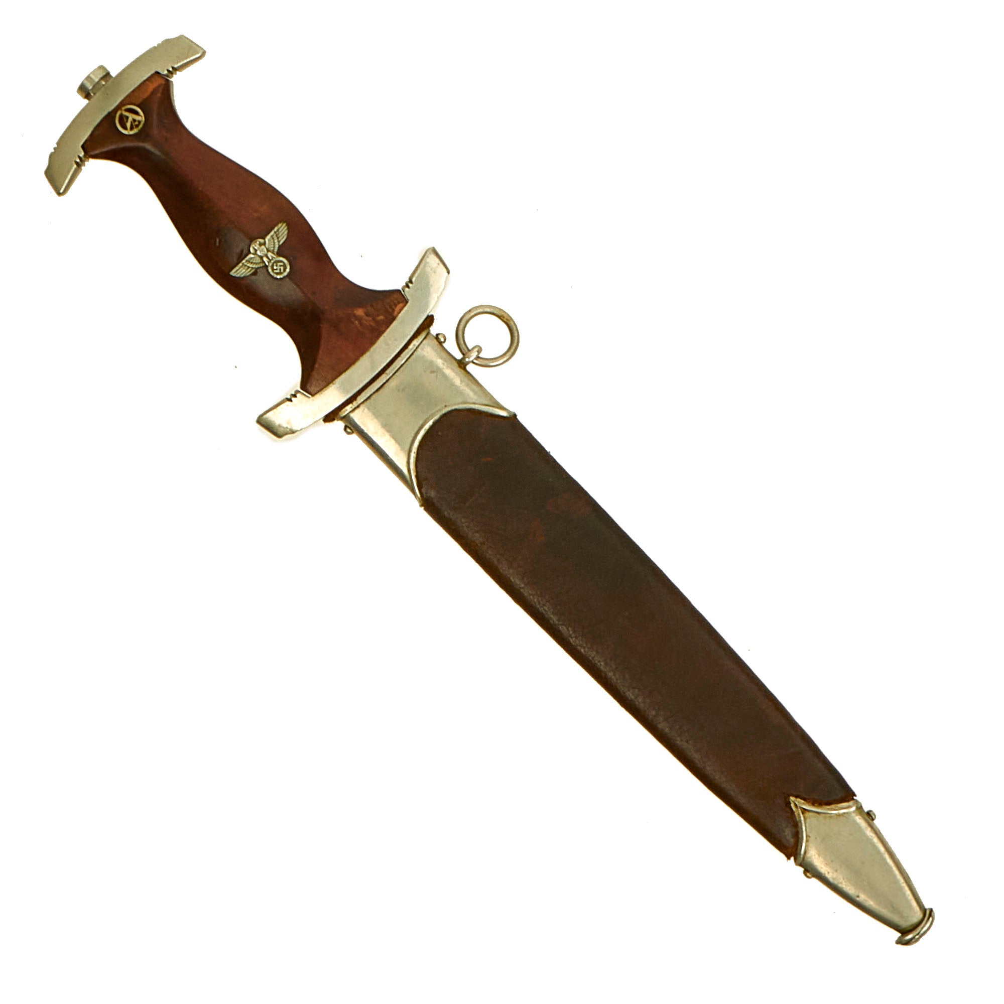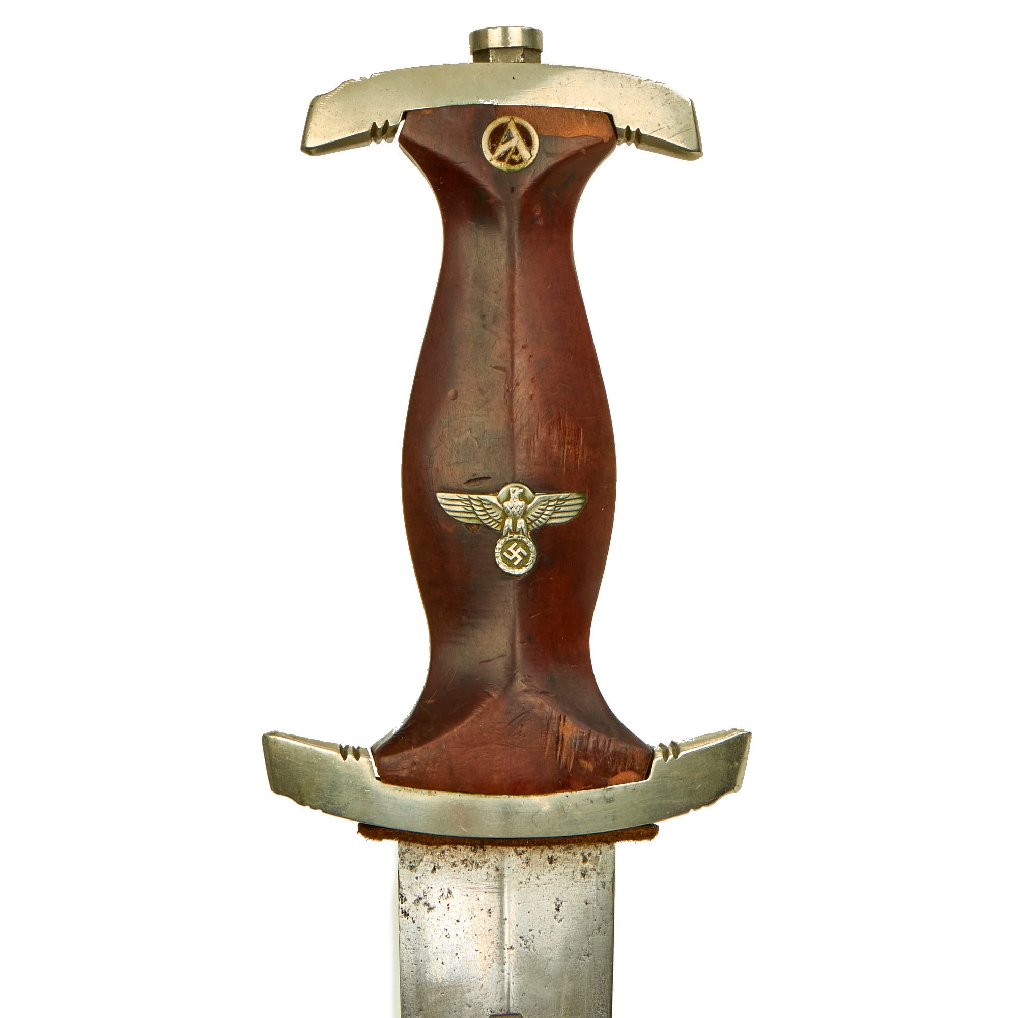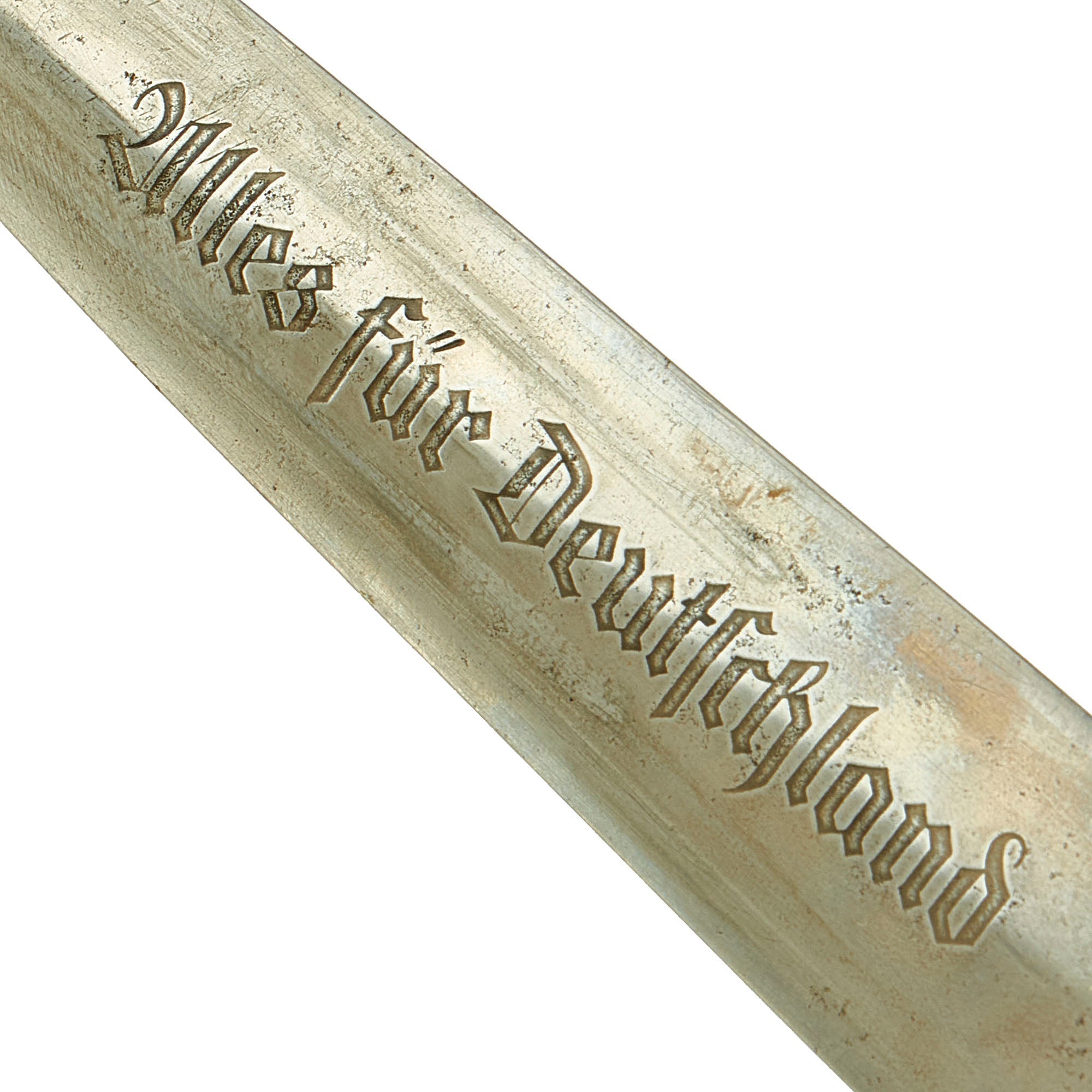 The blade was etched with the SA motto, Alles für Deutschland. Examples produced prior to 1935 were stamped with the German sector of the SA group on reverse lower crossguard. Later examples underwent standardization through the RZM ministry. These pieces were produced of cheaper plated zinc-base fittings and scabbards were simply painted brown.