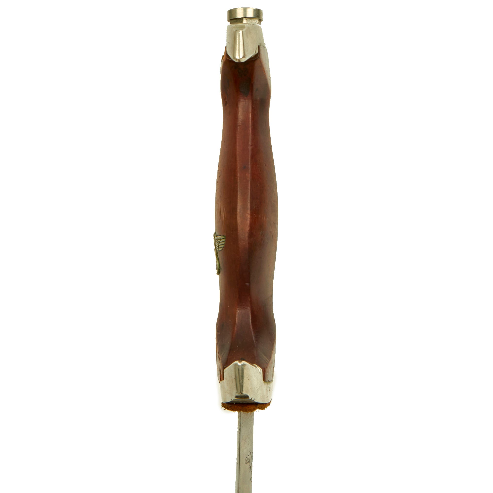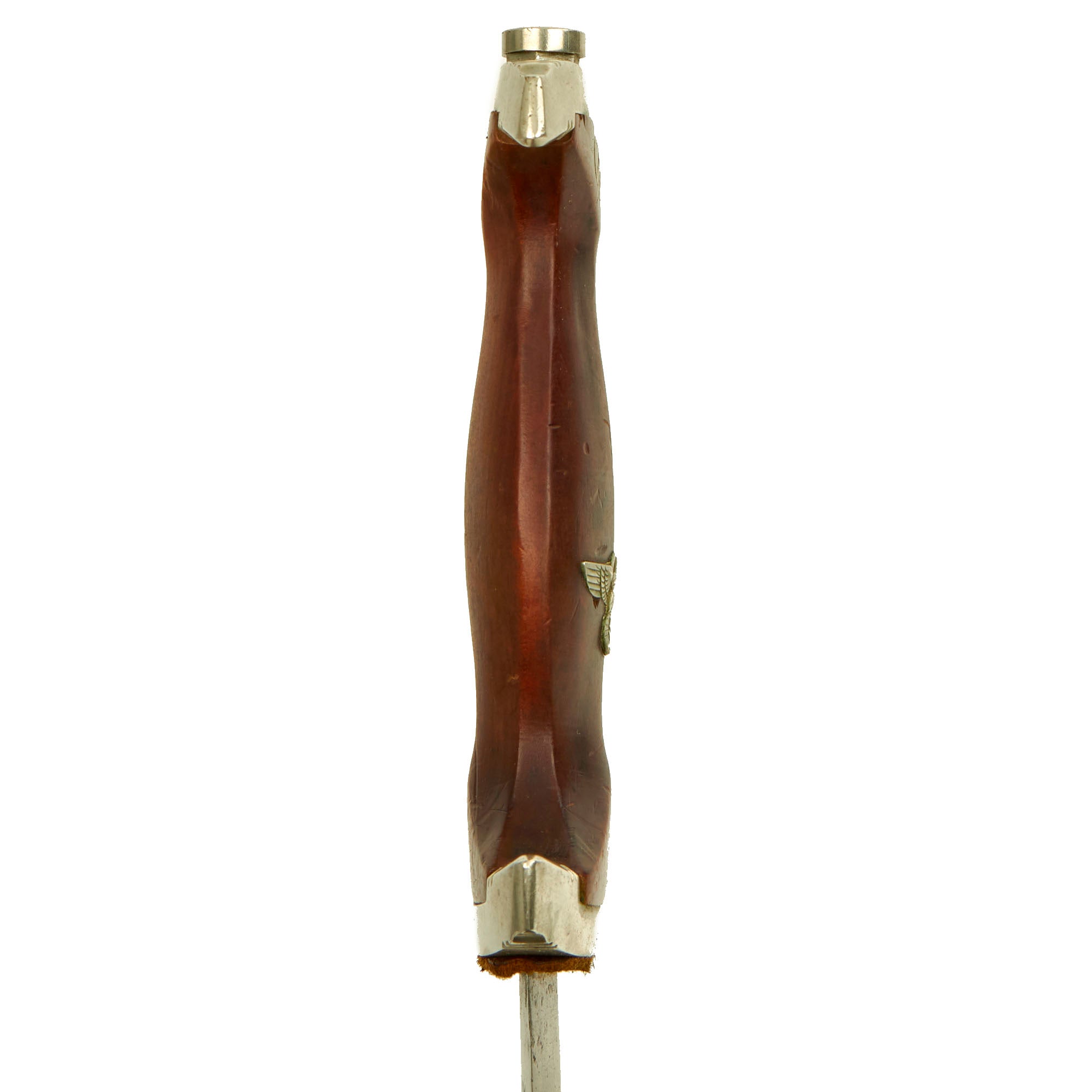 The grip is a fine product having a lovely red mahogany brown brown color, with a medium center ridge construction. There is some light wear and pressure denting, and there is also some wood chipped away near the round SA Symbol, running from the center all the way to the edge. There is also a small chip near the cross guard. The stain used on the grip can cause the wood to become brittle, and the pressure from the guards can cause the wood to split. The grip fits the crossguards nicely, with no wobble we can feel. The symbol button is nicely set, and still has most of the translucent enamel intact, with some areas a bit worn. There is a bit of verdigris surrounding the emblem. The grip eagle is a fine example being the style with beak that points straight. Most of the details are still there to the eagle to include the beak, breast feathering, wing feathering, talons, wreath and mobile swas. There is a bit of wear as well as more verdigris oxidation, showing that is the correct solid nickel silver for an early pattern eagle.