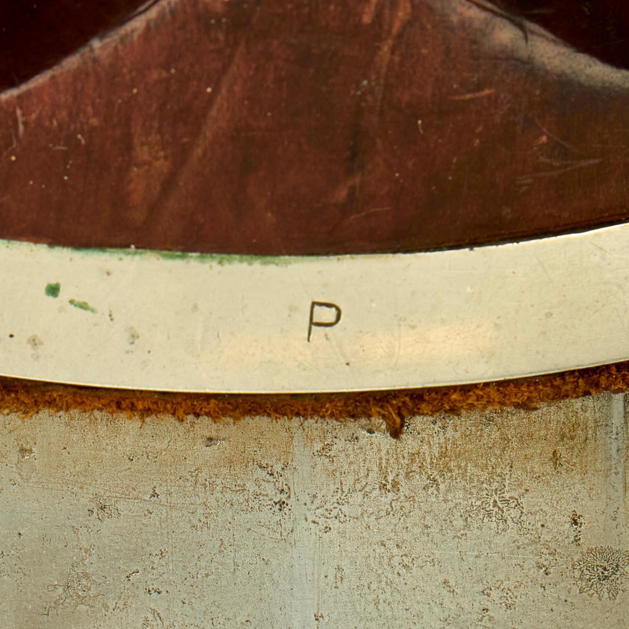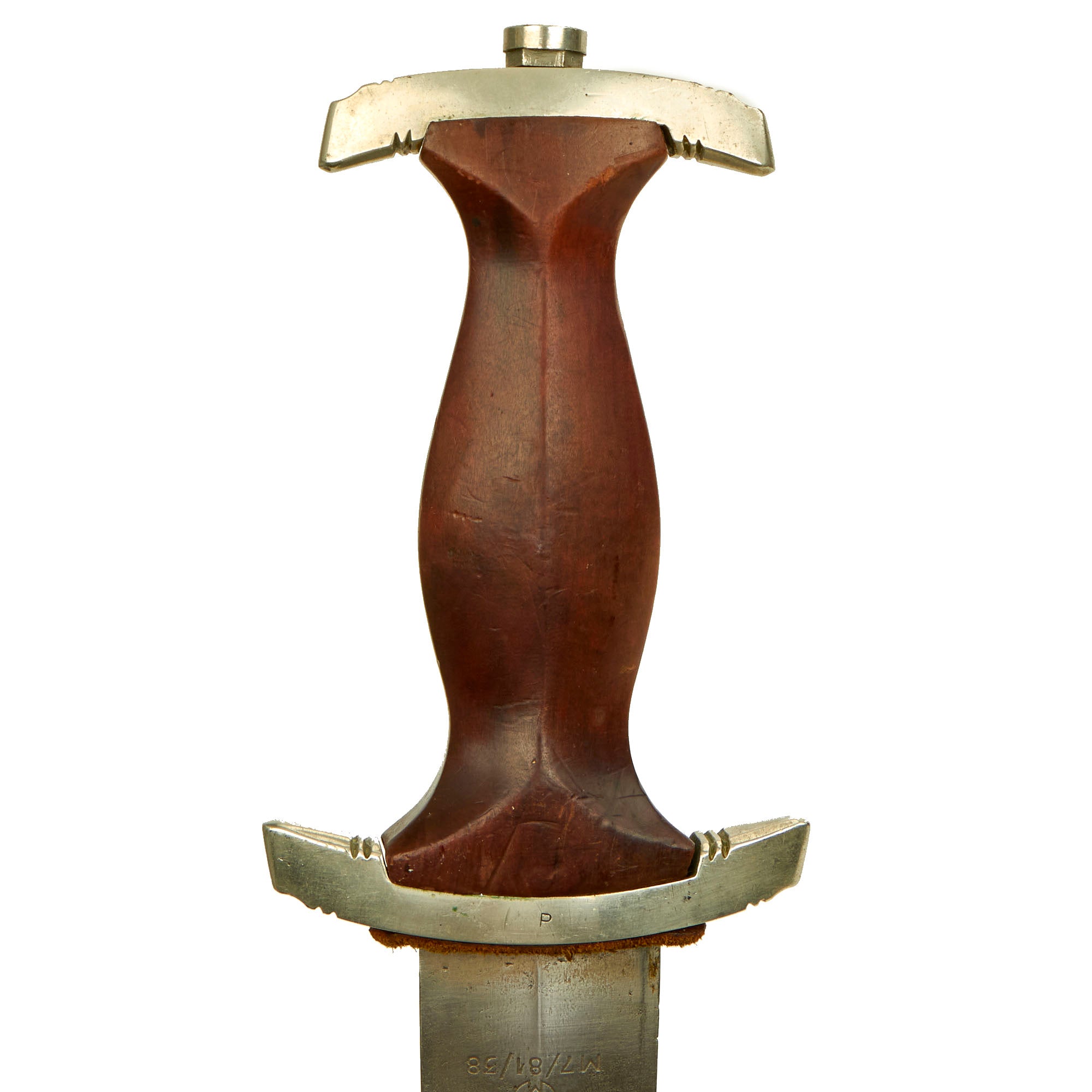 The dagger has solid nickel silver fittings throughout, which are of the earliest pattern construction. The cross guards and tang nut are in very good condition throughout with all fittings having a nice lightly aged patina. The lower reverse guard is Gruppe/Gau marked P, for Pommern (Pomeranian Region), which was an area along the Baltic Sea, most of which is today part of Poland. The main city of the area was Stettin, today the Polish city of Szczecin. This feature was only seen on daggers produced 1935 and prior. The nickel alloy end nut shows only a bit of turning, and the hilt is solid on the tang.
