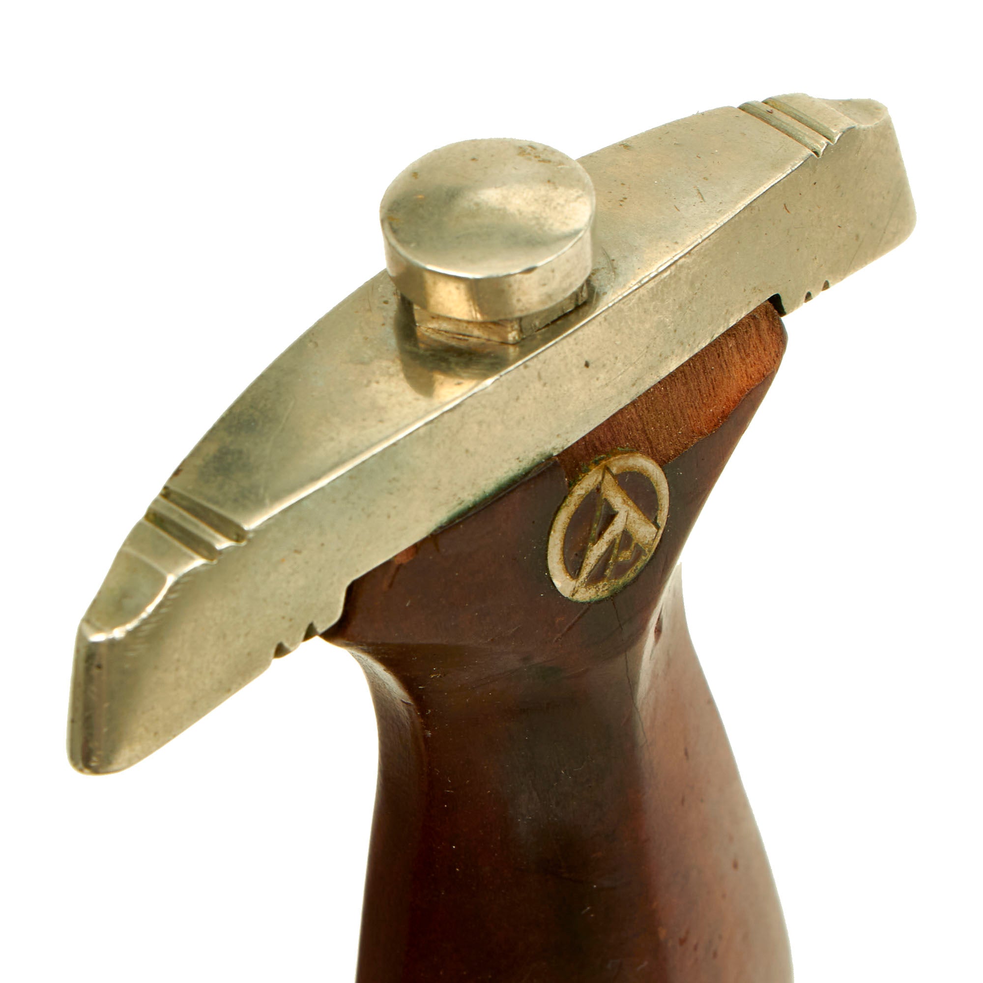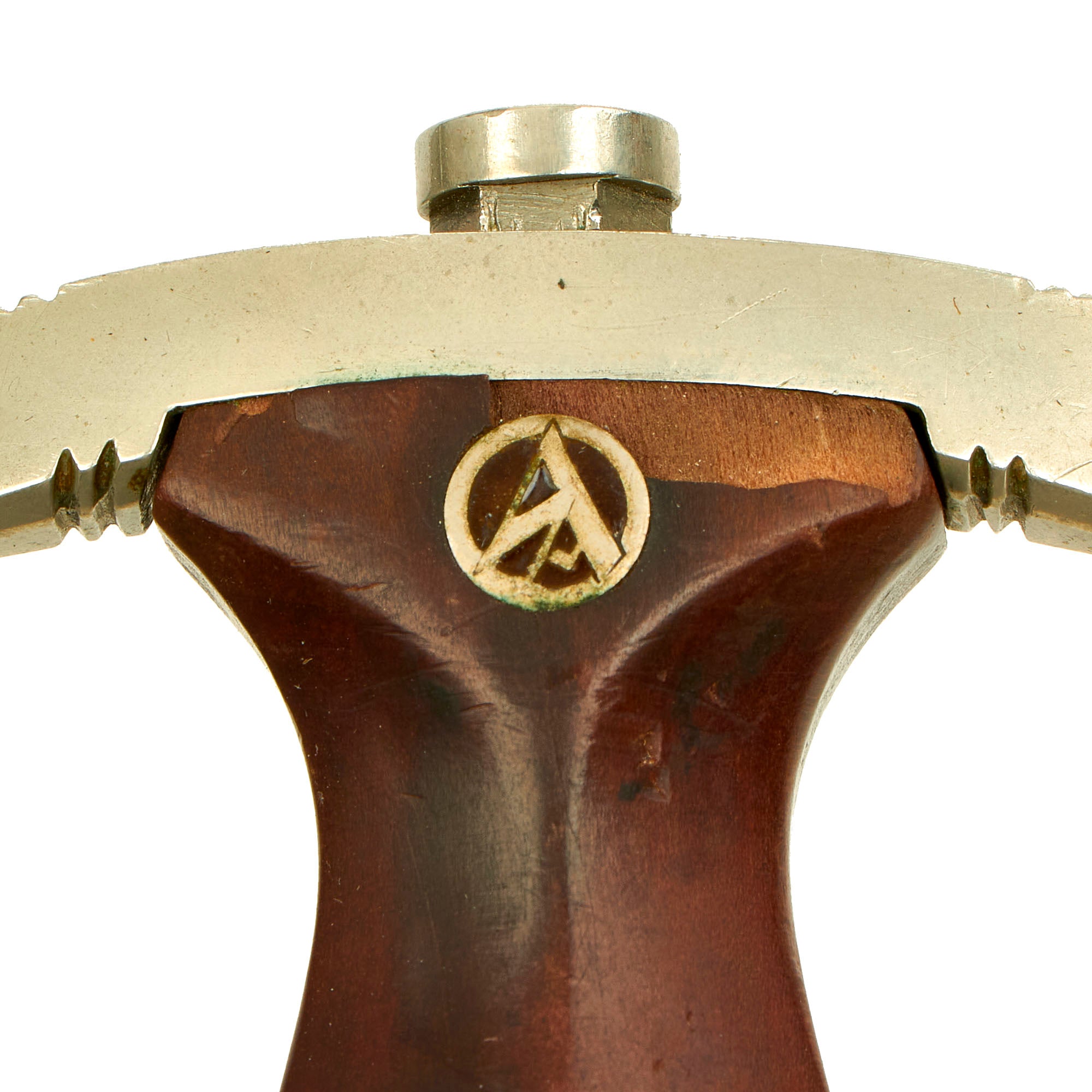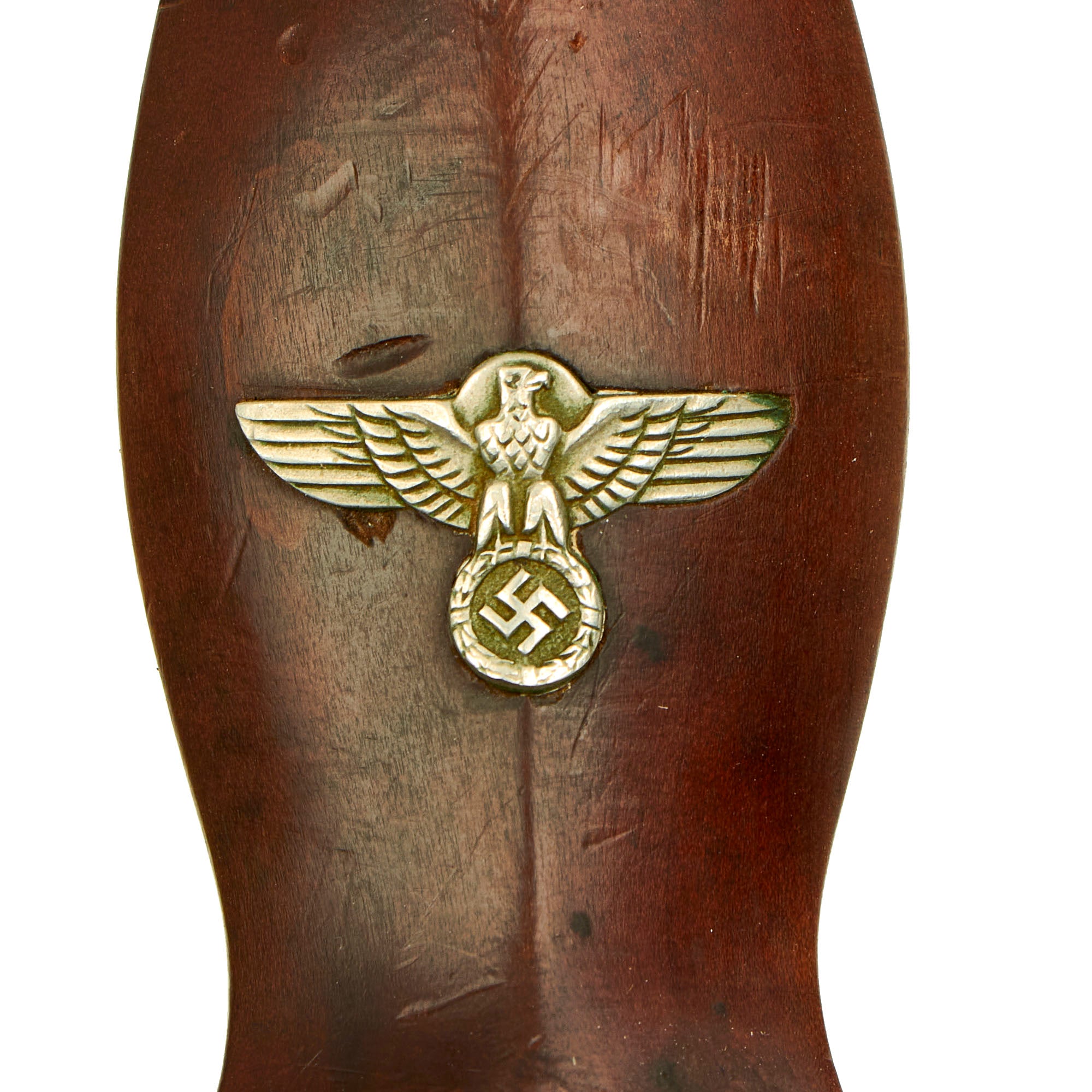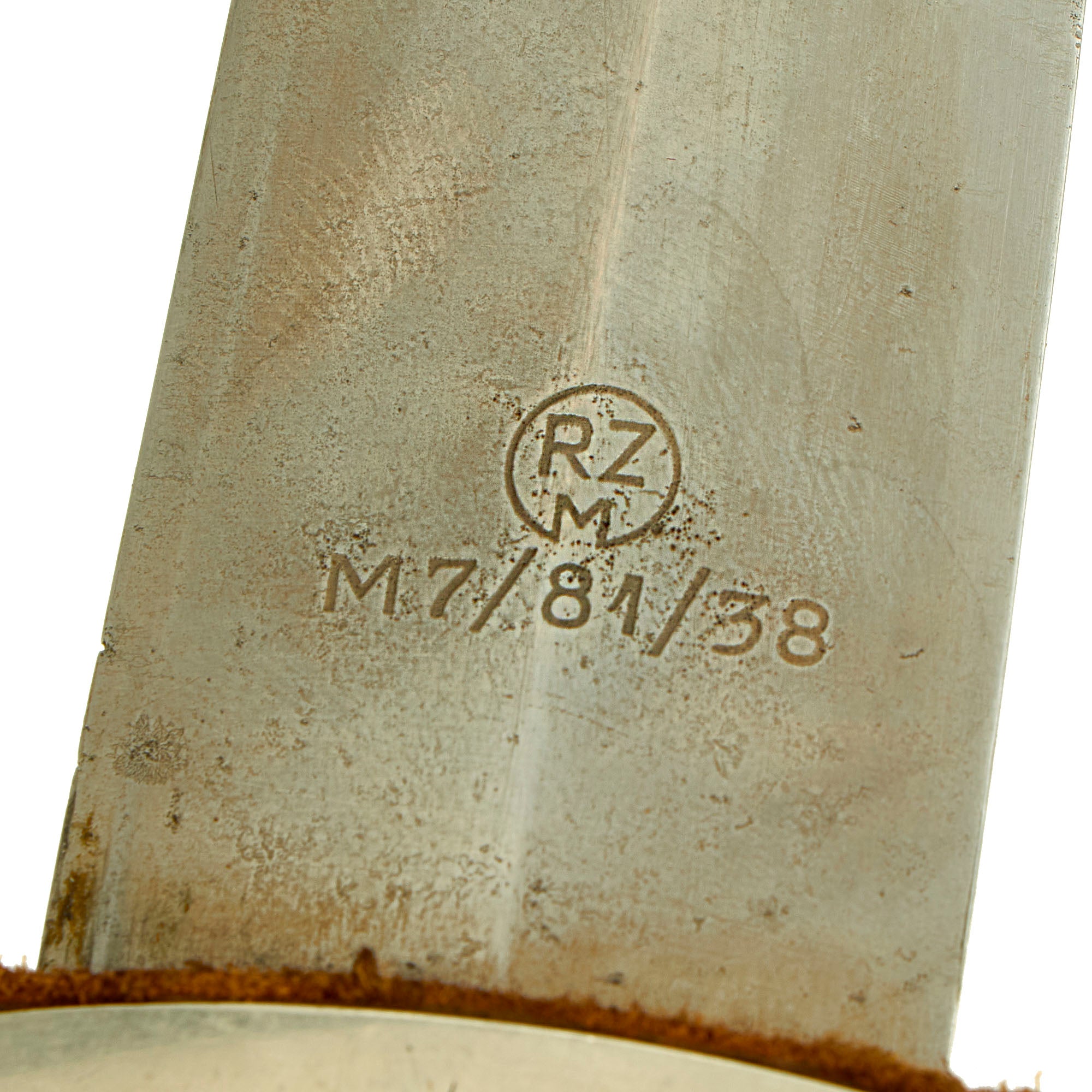 This marking indicates the dagger was made by RZM Dagger contractor "81", which records show is the rare maker Karl Tiegel, Tiegelwerk (Tiegel Works), located in Riemberg, then part of the Schlesien Bezirk (Silesian District) Breslau. Post-war this area was returned to Poland, and is now known as Rościsławice, and is part of the Lower Silesian Vovoidship. Tiegel also operated a depot in Solingen-Gräfrath, part of the legendary "City of Blades" in western Germany. Per J. Anthony Carter's fine work GERMAN SWORD AND KNIFE MAKERS, this metalworking business was first founded in 1877 to produce butchers' kitchen and professional knives. They produced some SA and NSKK daggers during WWII, first with their own trademark during the early years, and later with their RZM code during the 1938-1940 period. This is only the second example of a Karl Tiegel edged weapon that we have ever seen, and the firm is assumed to have been abandoned and probably destroyed during the Russian advance in 1945.