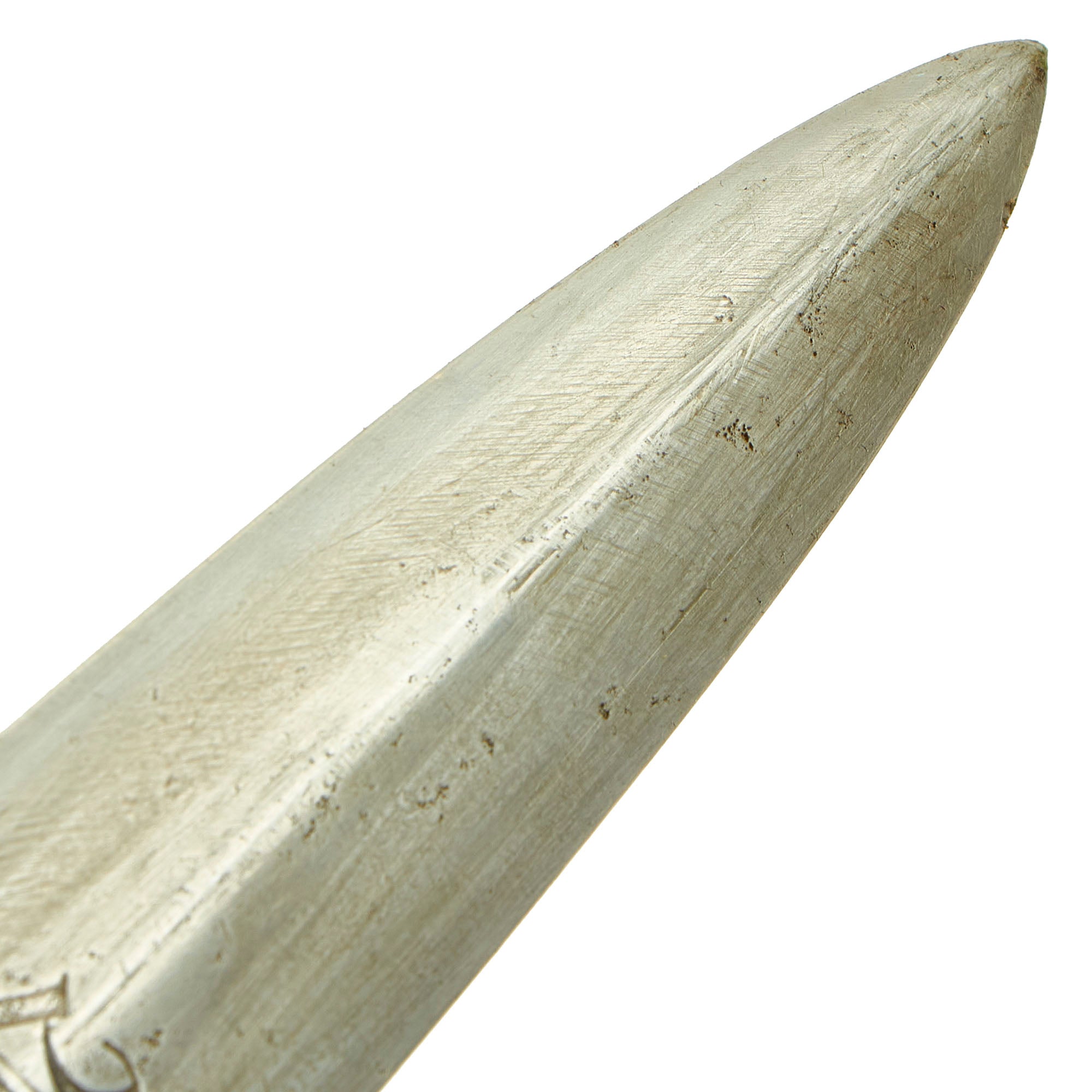 The blade of this example is in very good service used condition, showing overall past wear and oxidation, which was then polished out. This has unfortunately almost completely removed the original factory final polish grind cross grain. We can just see a bit of this texture in areas. This texture is iconic, and is the definitive identifying characteristic for a real WWII German Blade. The dagger retains the original factory "blunt" edge, with no dents or chips, just a bit of bending / deformation near the tip. The acid-etched Alles für Deutschland (Everything for Germany) SA motto is present, but a bit worn from cleaning, and much of the factory darkening is missing.