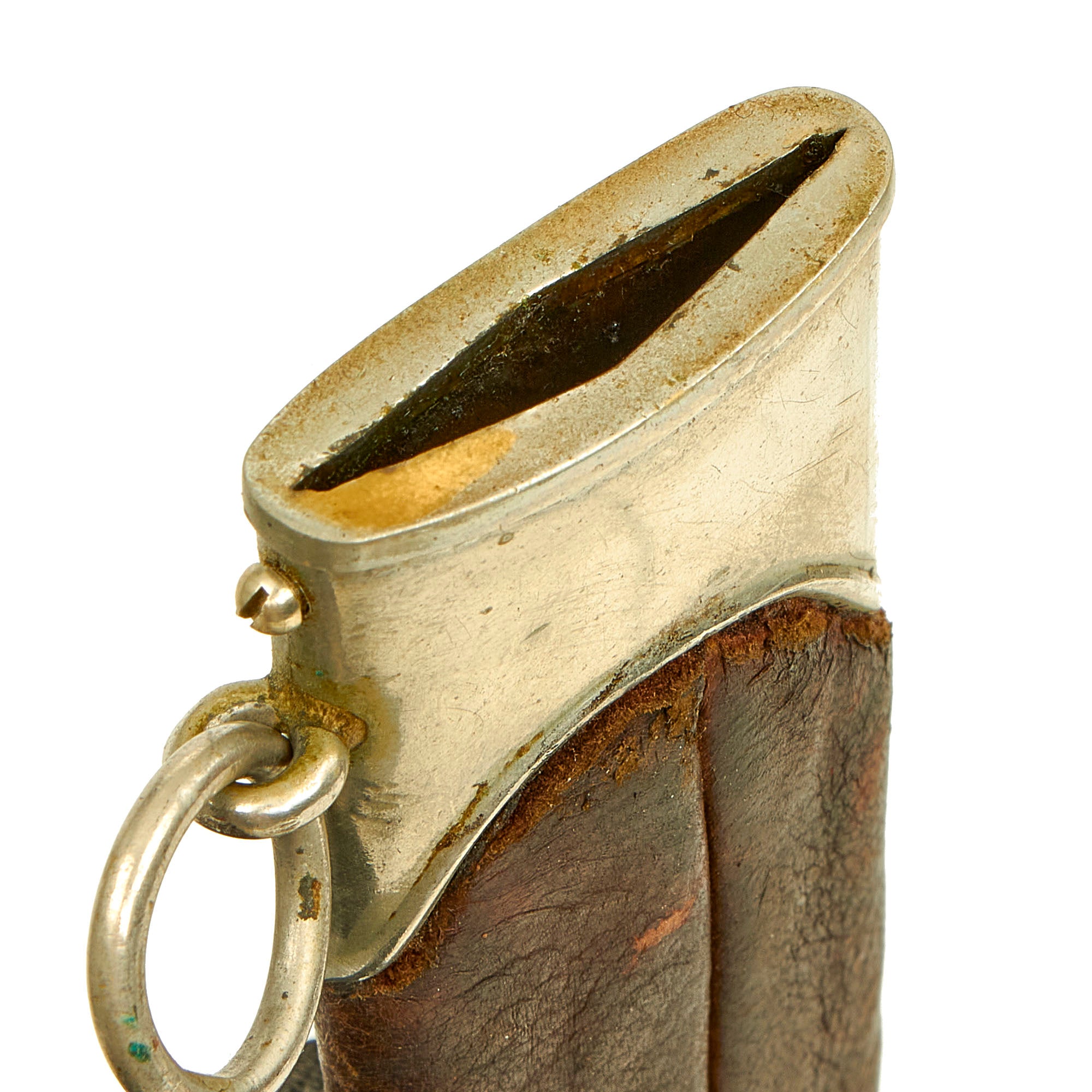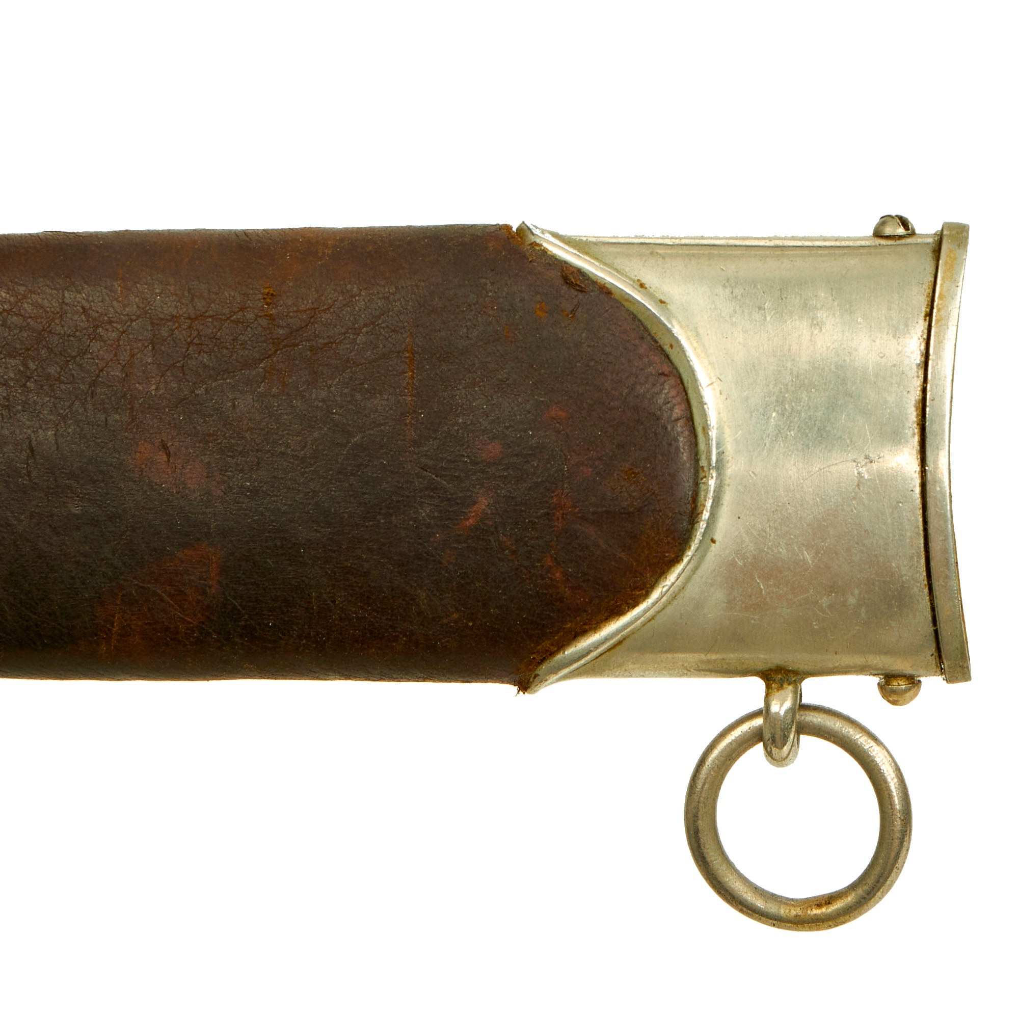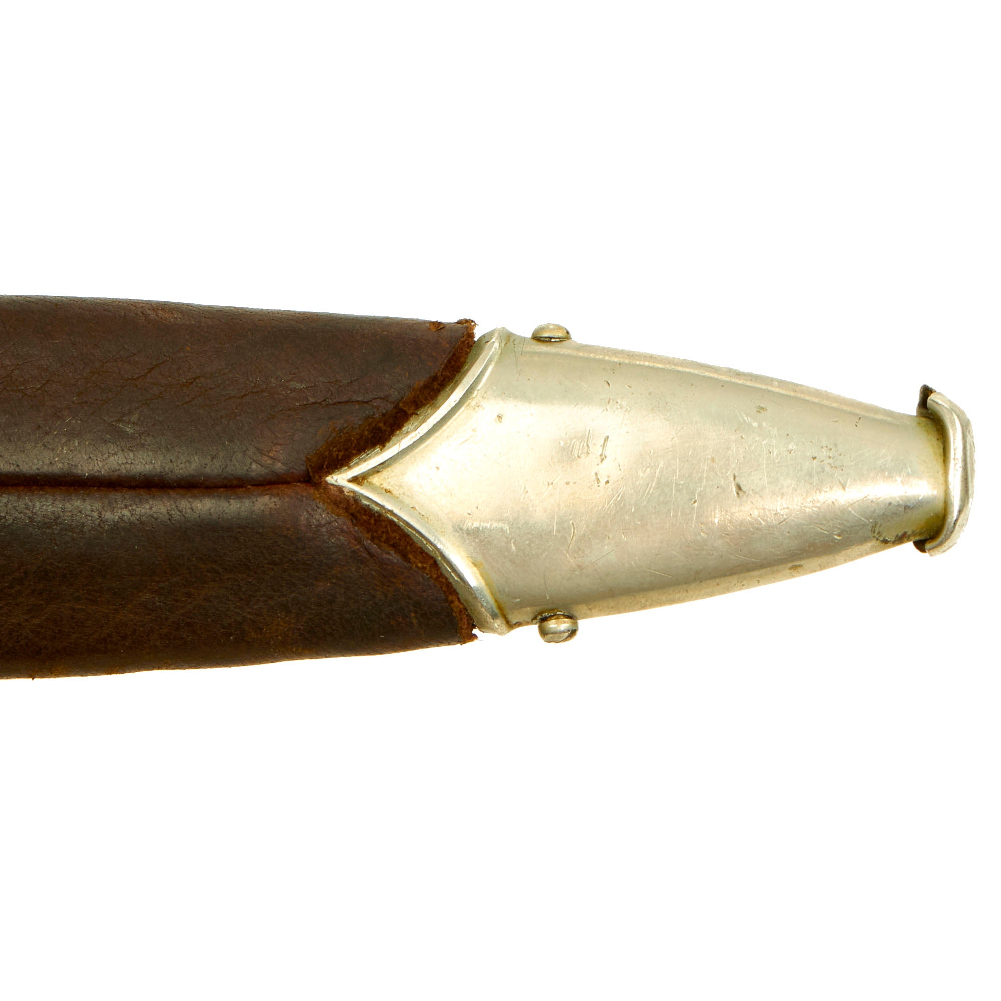 The scabbard shell looks to be straight throughout, however it is completely covered with leather, so cannot really assess the condition. The upper and lower fittings are solid nickel silver, with a great look and some dents and scratches showing typical wear on the locket. The chape fitting however has had the end ball completely crushed in an cracked, almost bent backwards. The nickel alloy is soft, so damage is common, but not to this extent. The throat nicely matches the crossguards, and all four original screws are present.