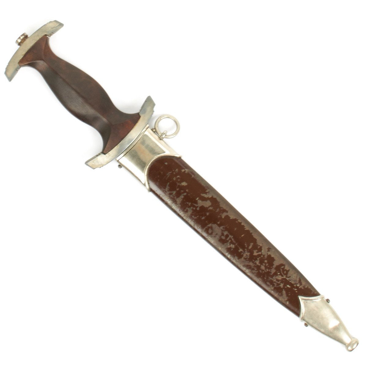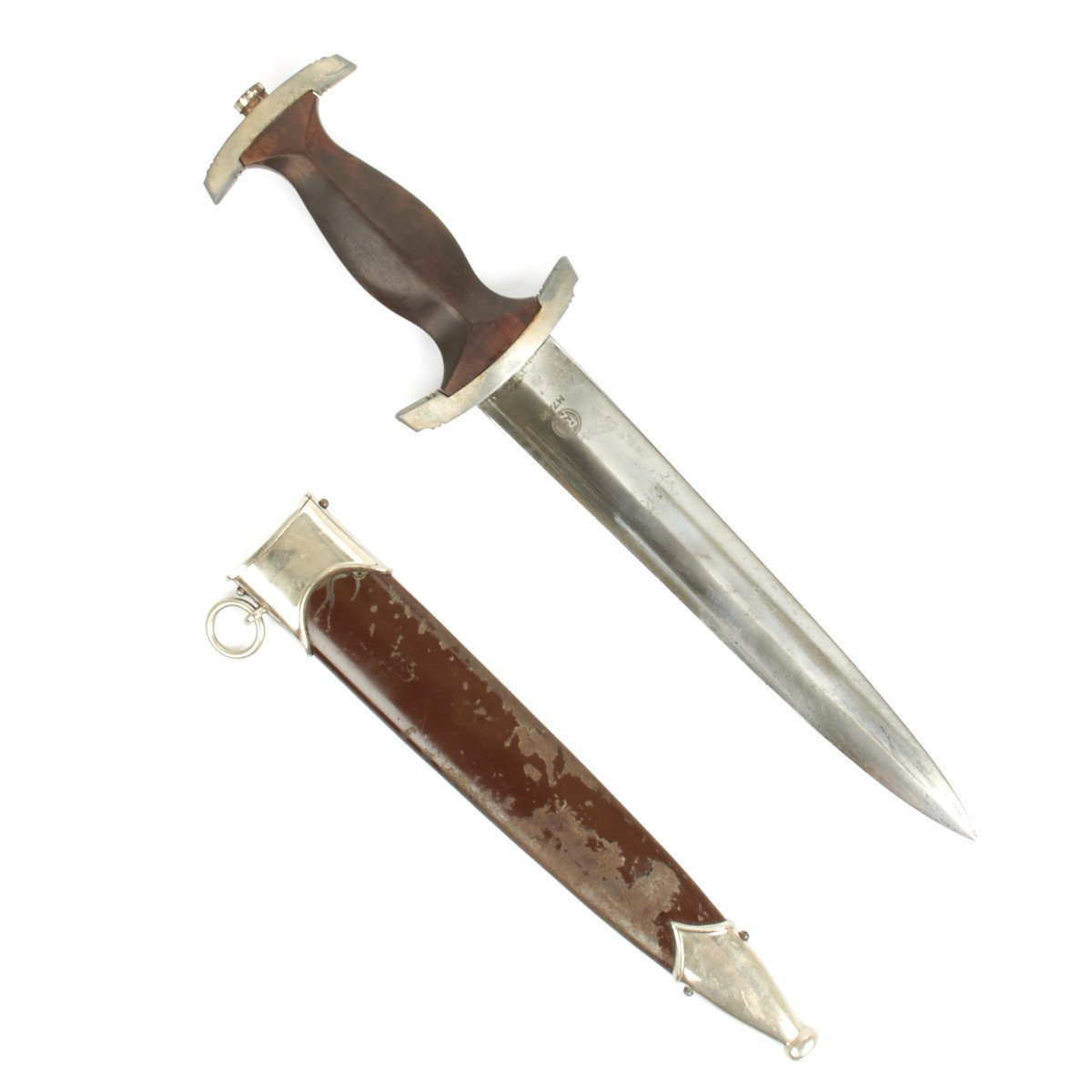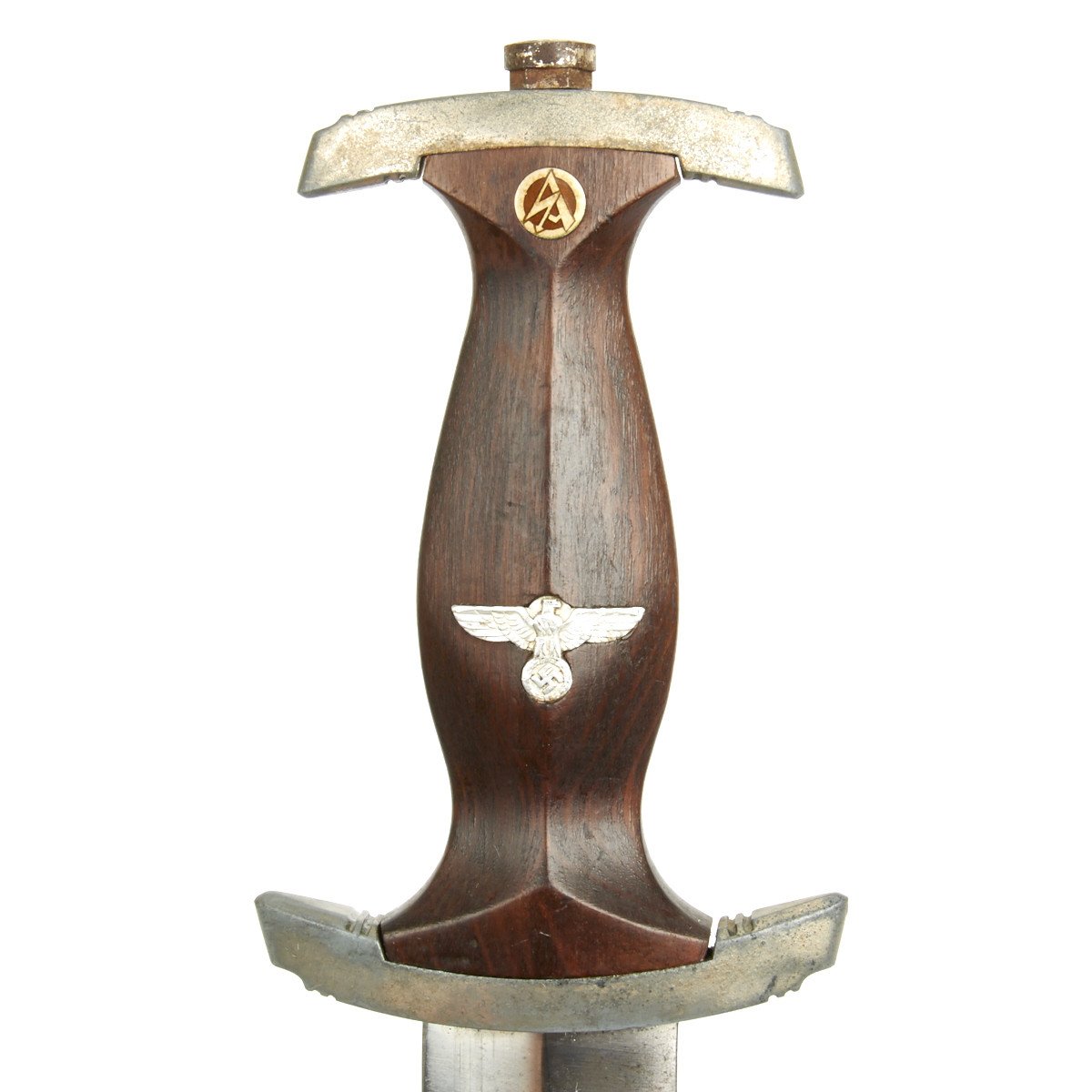 Original Item: Only One Available: This later SA Dagger has not been cleaned in a long while and it appears to not have been taken apart in modern times. The nickel hilt mounts are in good condition having a nice dull look to their surfaces. The crossguards still have smooth surfaces and crisp edges. The accent grooves are quite deeply cut into the surfaces.