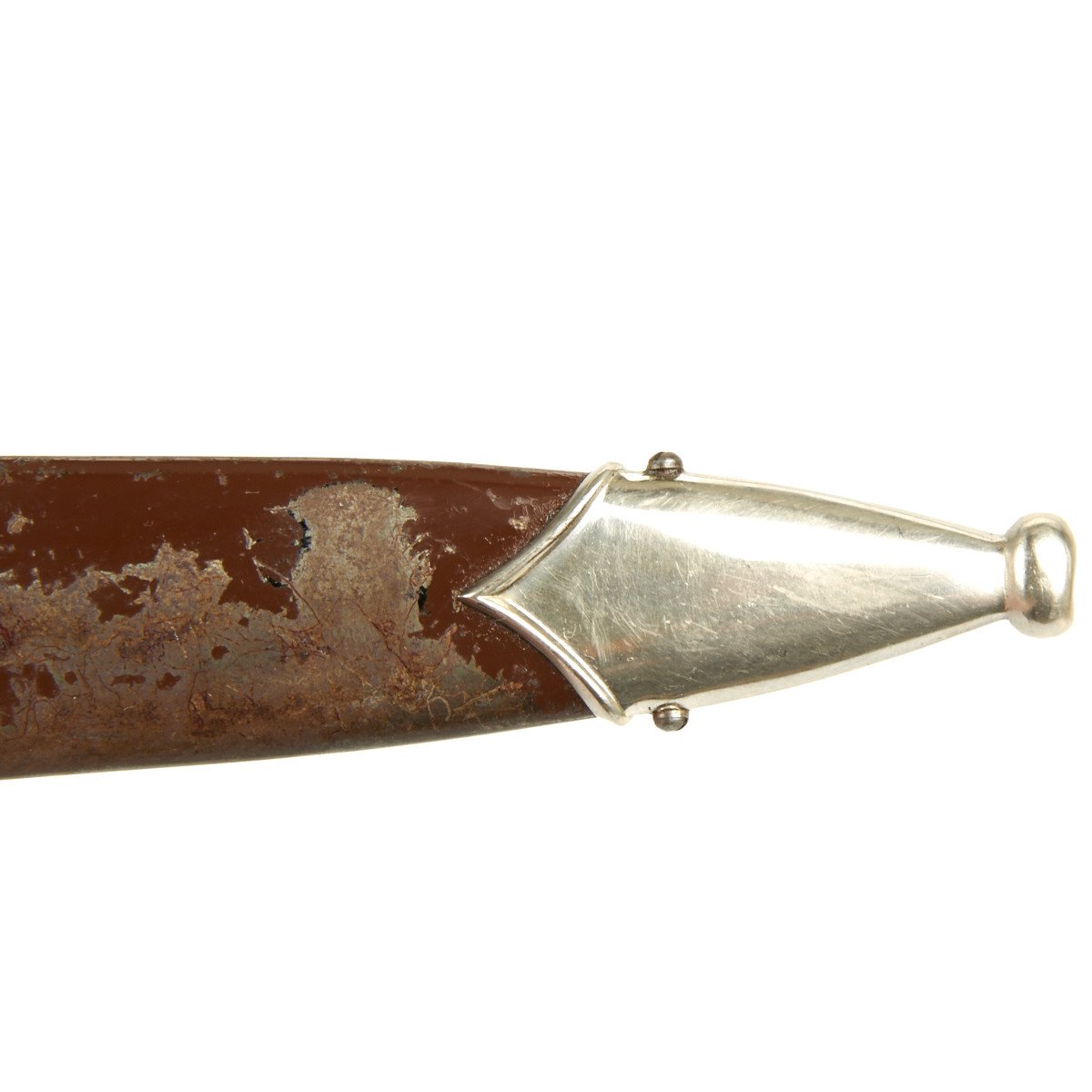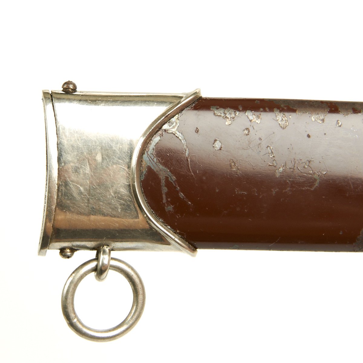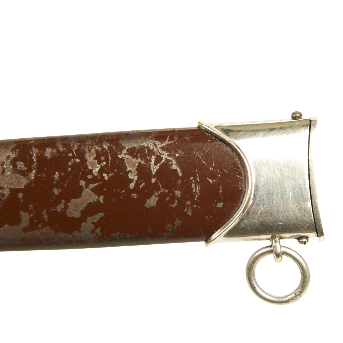 The scabbard of this example is straight throughout. Also though there is some minor rust in the surfaces but not bad with some brown paint remaining. The scabbard shell is equipped with matching nickel mounts. The lower ball has a dent. The mounts are retained by the original nickel screws.