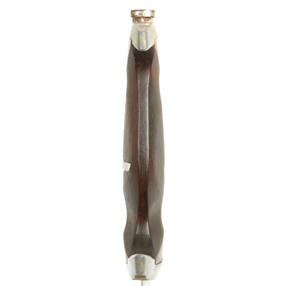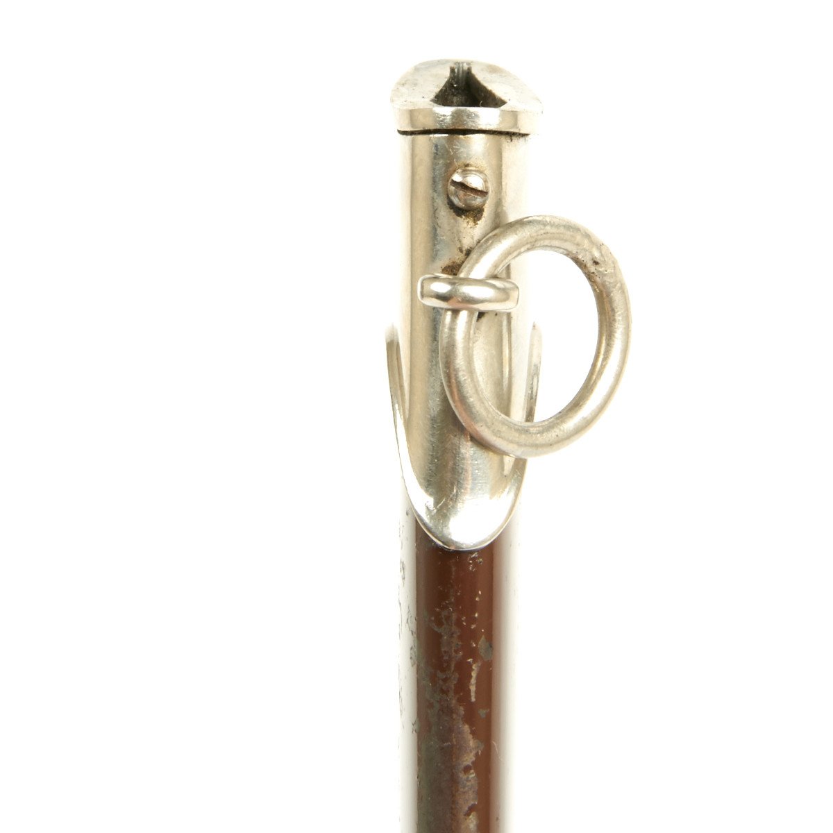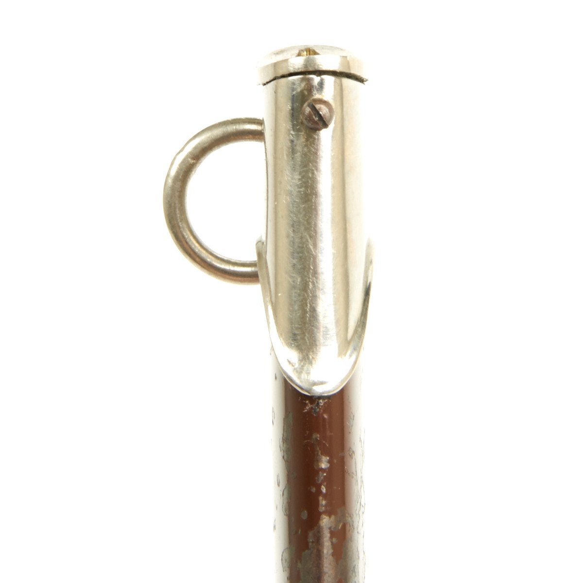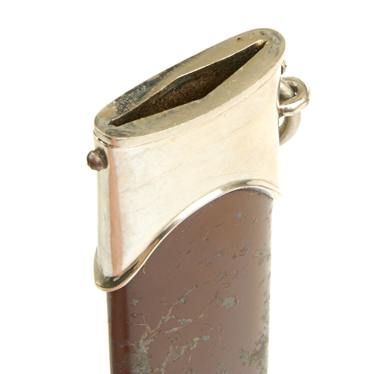 The scabbard of this example is straight throughout. Also though there is some minor rust in the surfaces but not bad with some brown paint remaining. The scabbard shell is equipped with matching nickel mounts. The lower ball has a dent. The mounts are retained by the original nickel screws.