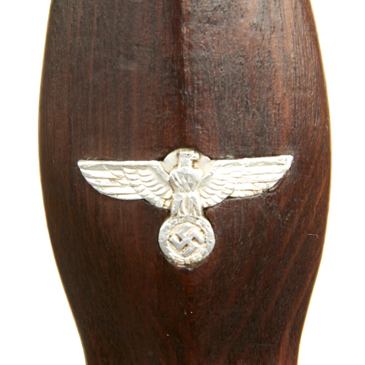 The grip is a brown color wood having a nice subtle burl in the center area which could be brought out with a little furniture polish. This grip is in good condition throughout and nicely fits the crossguards. The symbol button is nicely placed and has no damage to the enamel. The nickel grip eagle is the type with point-behind-the-head construction. This bird is in choice condition having crisp detail remaining to the eye, beak, breast feathering, wing feathering, talons and mobile swas.