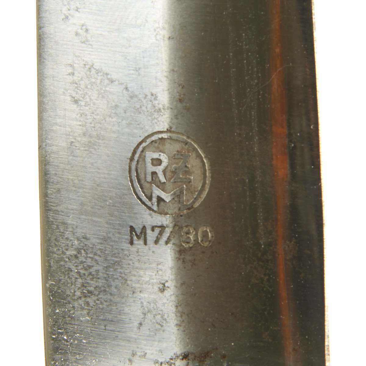 The blade of this example is still bright. It does have some minor staining in the surfaces a lot of which could come out with a little work. The crossgraining is also still mostly there. The SA motto is deep and crisp having about 50% of the original darkening in the backgrounds. The reverse blade is in the same condition. The reverse ricasso is matching etched with RZM M7/80 denoting Gustav C. Spitzer of Solingen manufactured this dagger.
