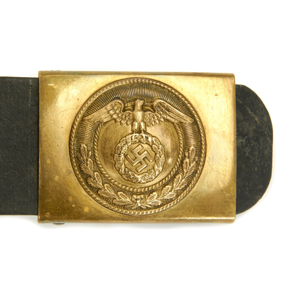 Original Item: Only One Available. This is a very nice WWII German Sturmabteilung (SA) EM/NCO's Brass Belt Buckle (Koppelschloß) with correct leather belt. It is embossed with the standard NSDAP Political eagle with downward sloping wings. This example has the two piece buckle, with the a stamped brass single piece box with stamped slot, and a soldered on eagle emblem.
