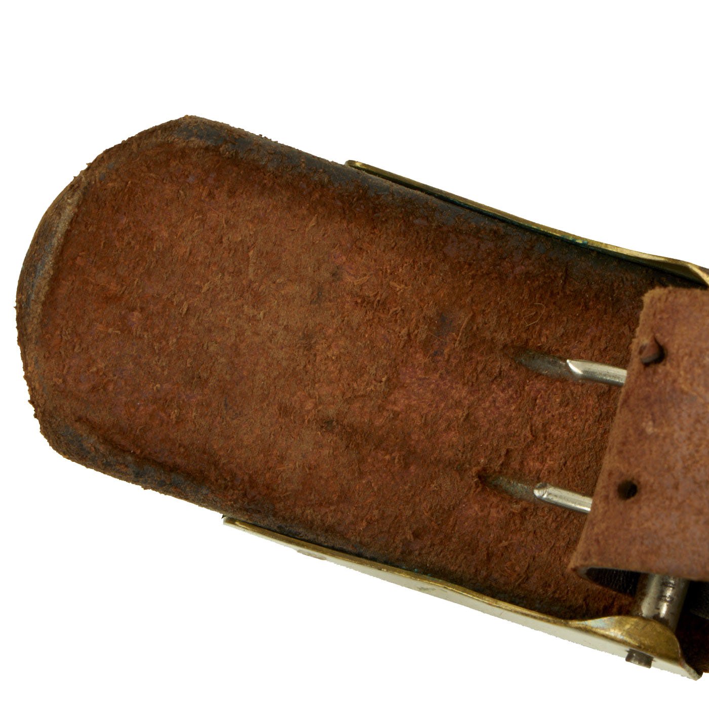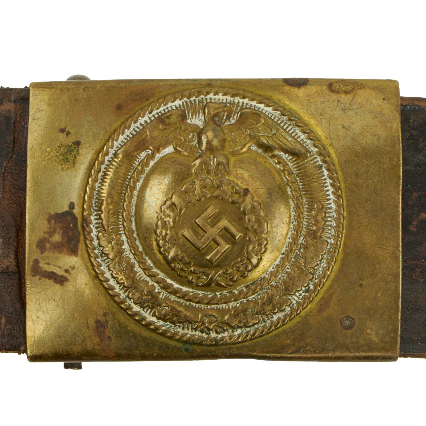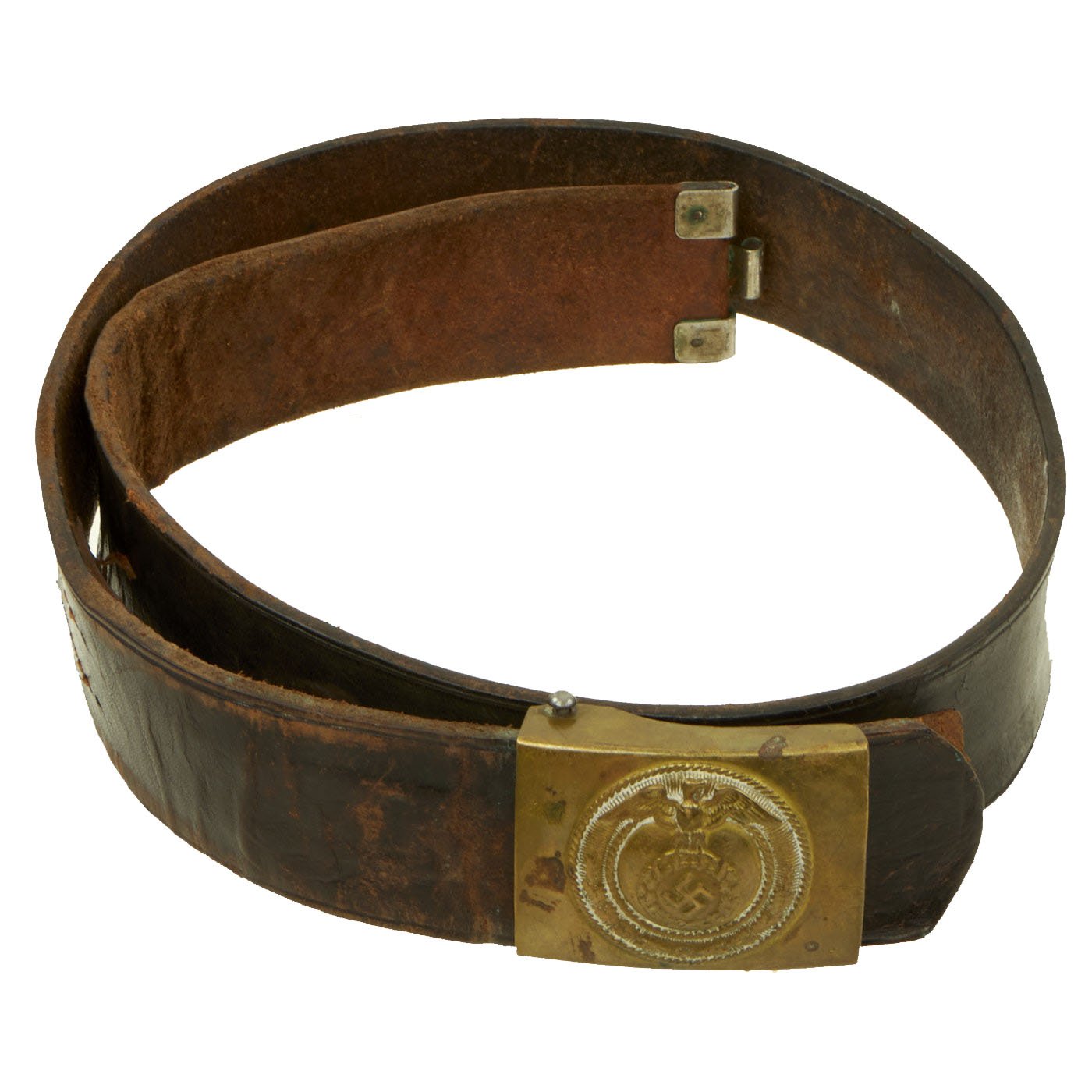 Original Item: Only One Available. This is a very nice WWII German Sturmabteilung (SA) EM/NCO's Brass Belt Buckle (Koppelschloß) with correct leather belt. It is embossed with the standard NSDAP Political eagle with downward sloping wings. This example has a single piece stamped brass buckle, with a brazed on catch loop.