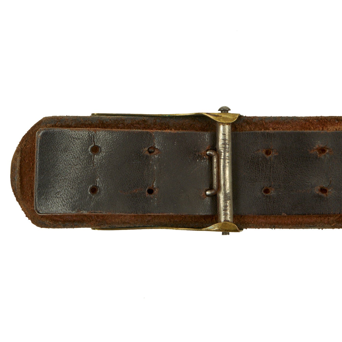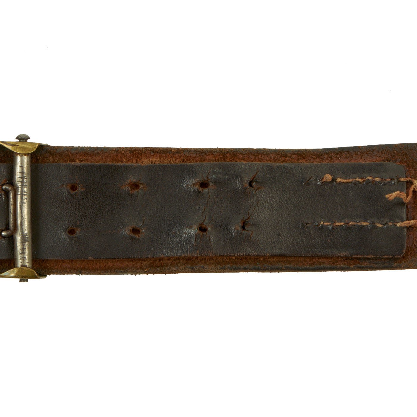 The belt itself measures 39” when fully extended. The leather is definitely worn, but condition is solid with no holes or tears, though some surface cracking is present, and leather is soft and pliable. Overall a great example of a hard to find WW2 German Belt.