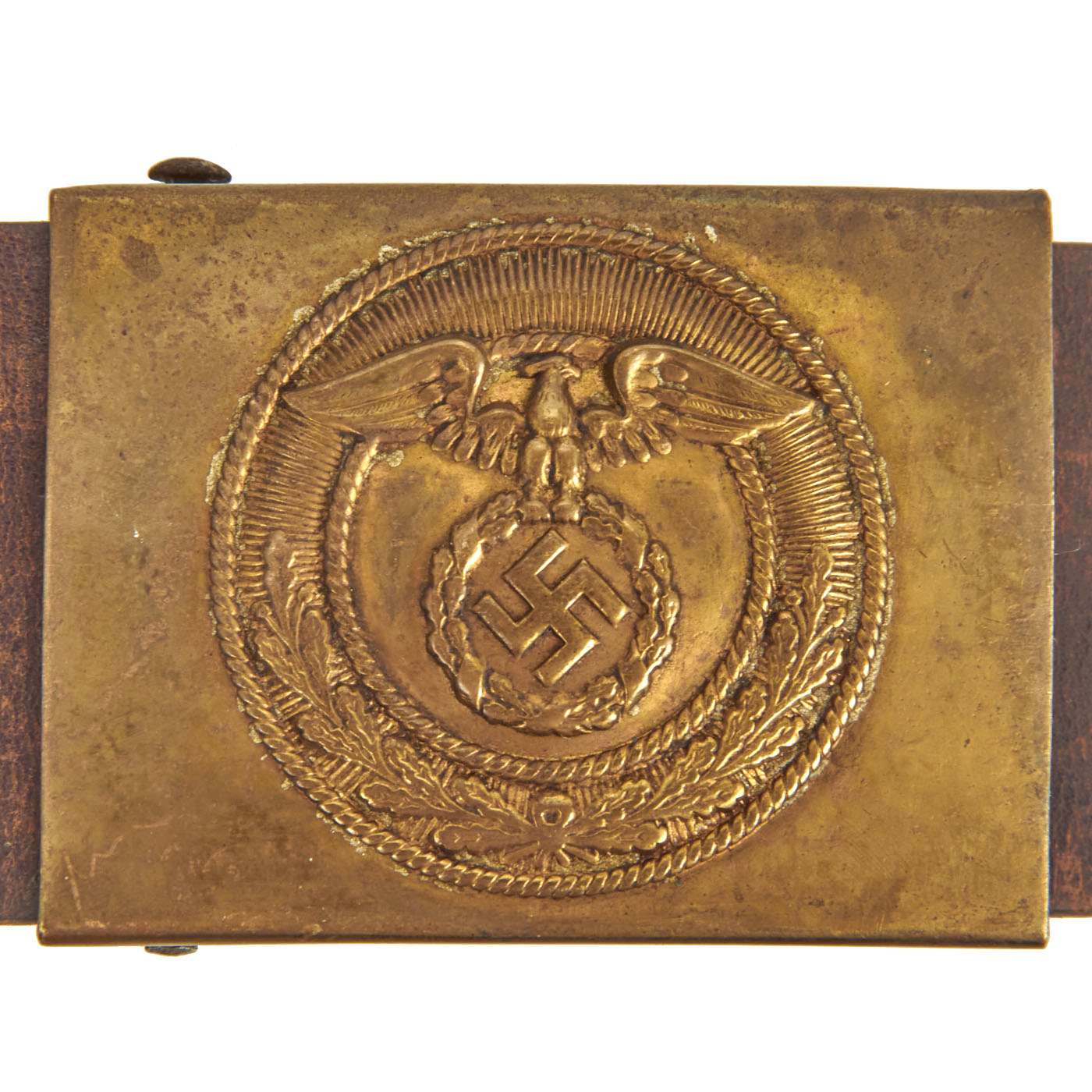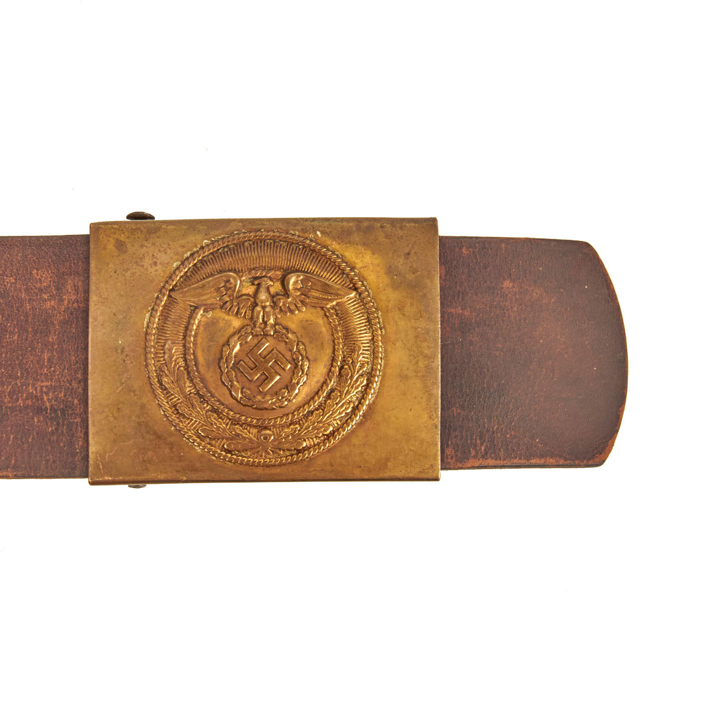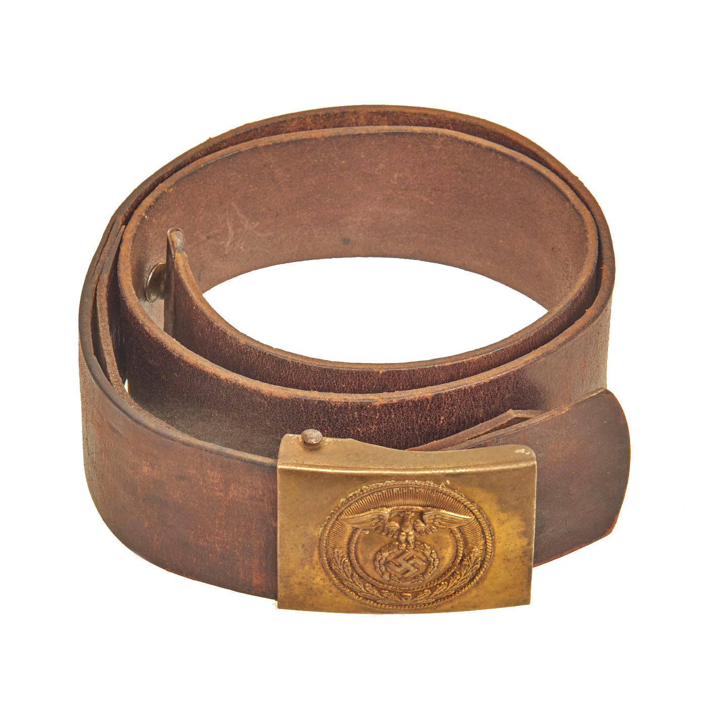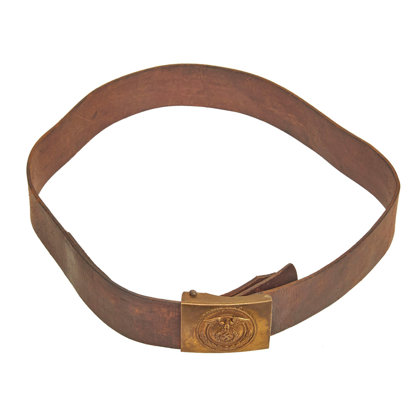 Original Item: Only One Available. This is a very nice WWII German Sturmabteilung (SA) EM/NCO's Brass Belt Buckle (Koppelschloß) with correct leather belt. It is embossed with the standard NSDAP Political eagle with downward sloping wings. This example has a single piece stamped brass buckle, with a brazed on catch loop. We checked the back, and there are no maker markings, but that is fairly typical for SA belts buckles.