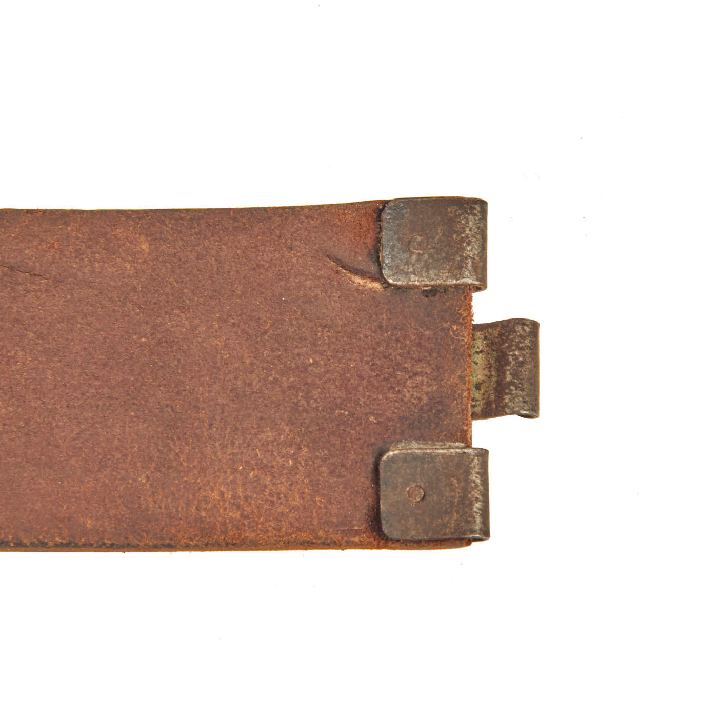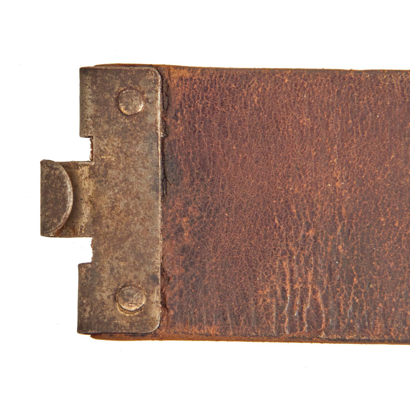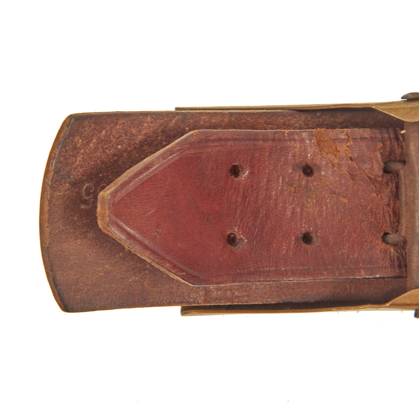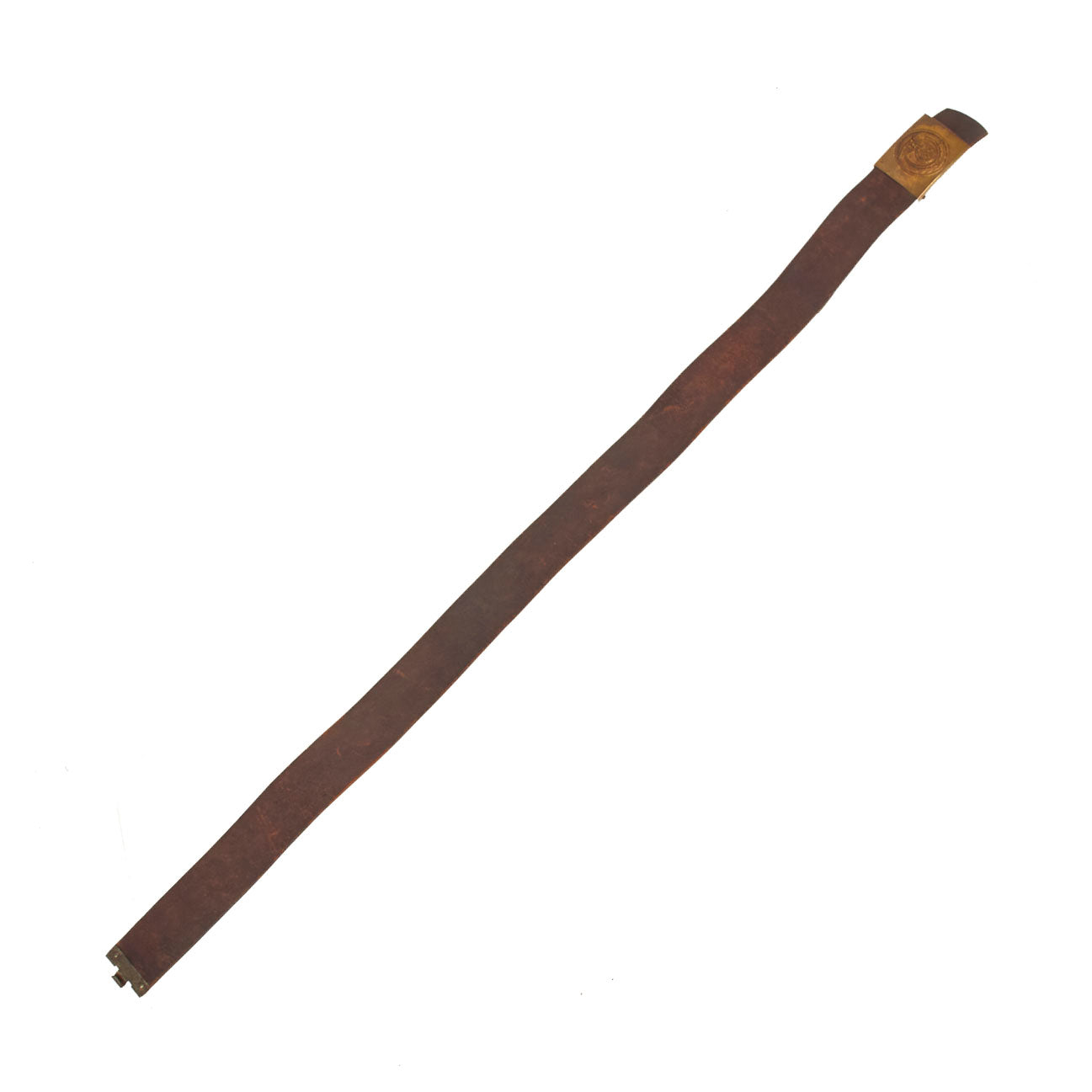 Original Item: Only One Available. This is a very nice WWII German Sturmabteilung (SA) EM/NCO's Brass Belt Buckle (Koppelschloß) with correct leather belt. It is embossed with the standard NSDAP Political eagle with downward sloping wings. This example has a single piece stamped brass buckle, with a brazed on catch loop. We checked the back, and there are no maker markings, but that is fairly typical for SA belts buckles.