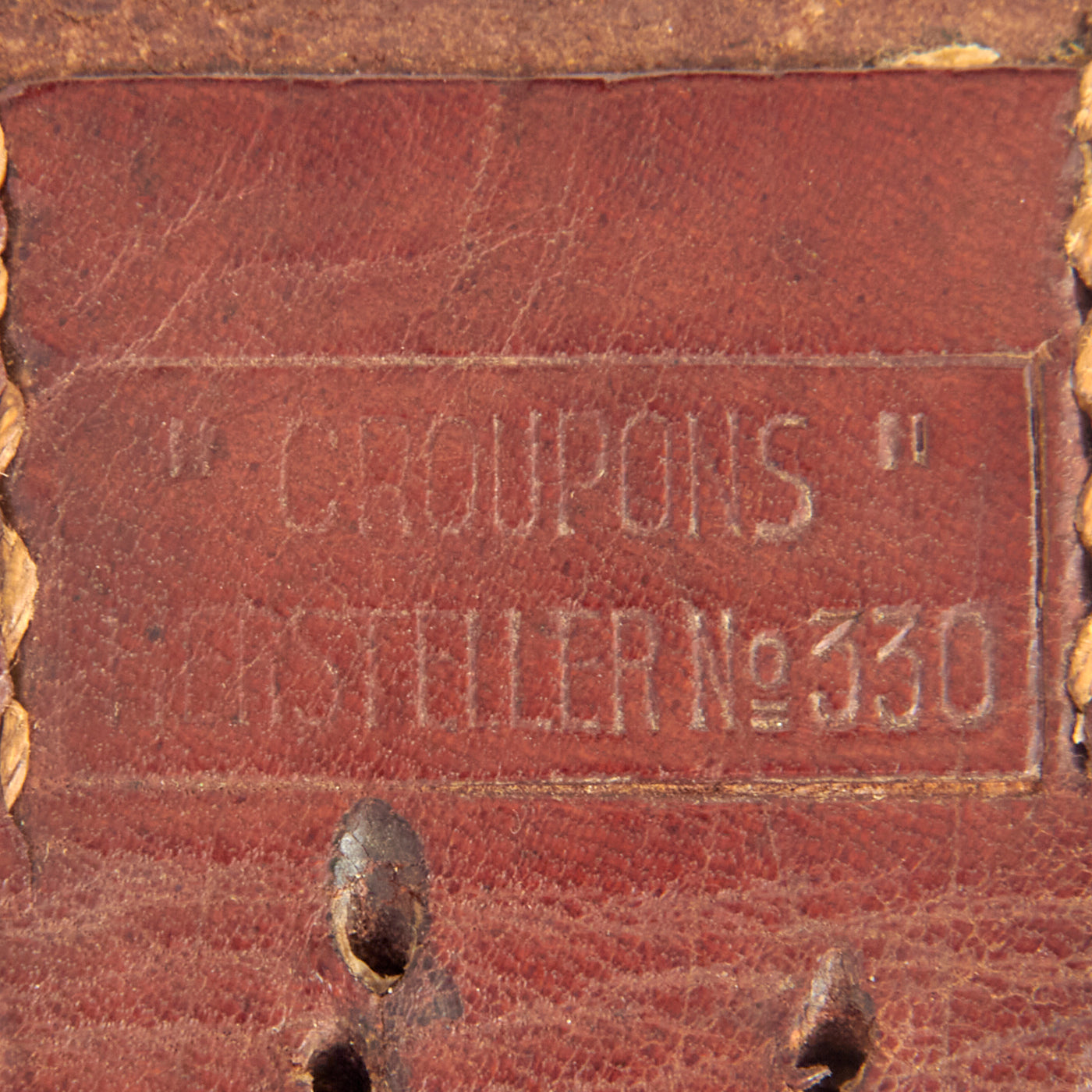 The belt itself measures about 38” when fully extended. The leather does show wear to the finish, but there is no cracking or tears, and it is still soft and pliable. It still has the original size adjustment tab, which is marked " CROUPONS " / HERSTELLER No 330, which references the type of leather used and the supplier number.
