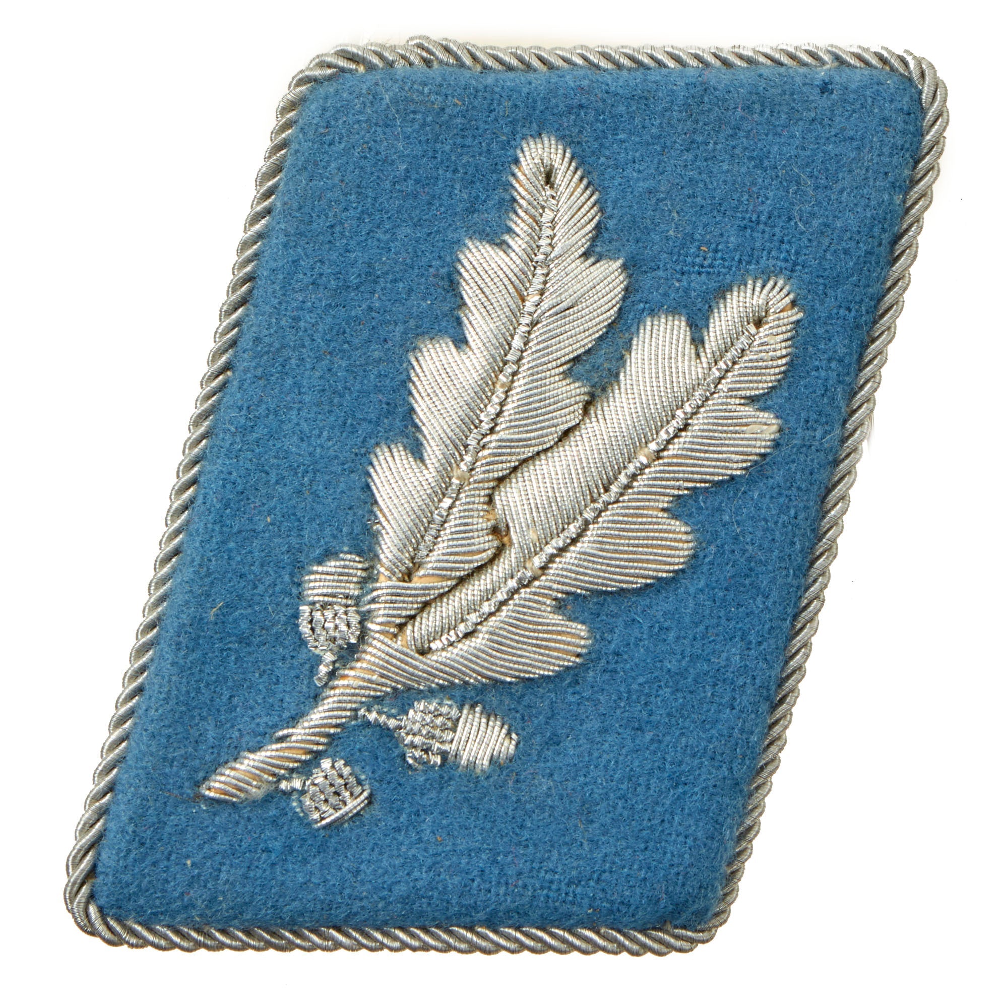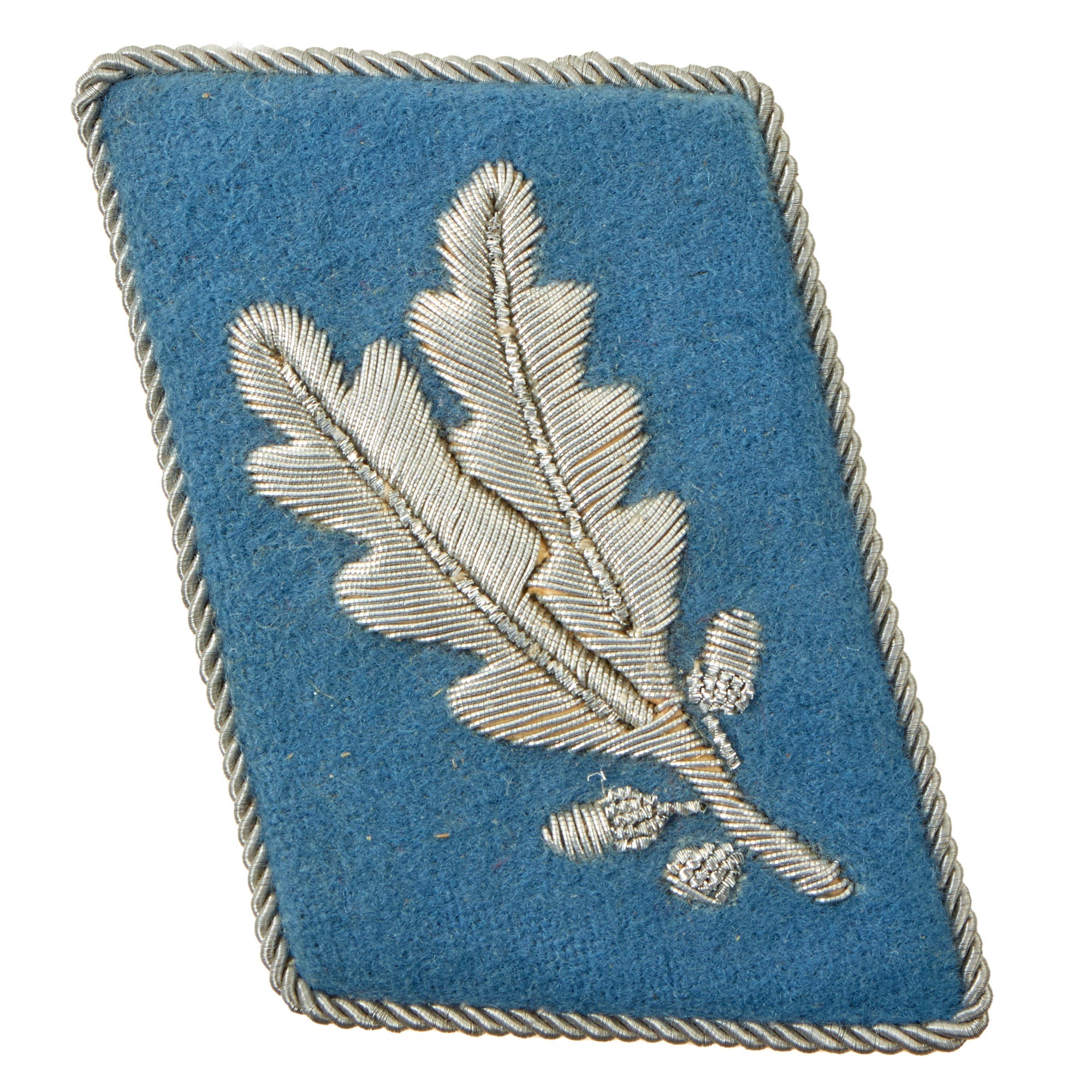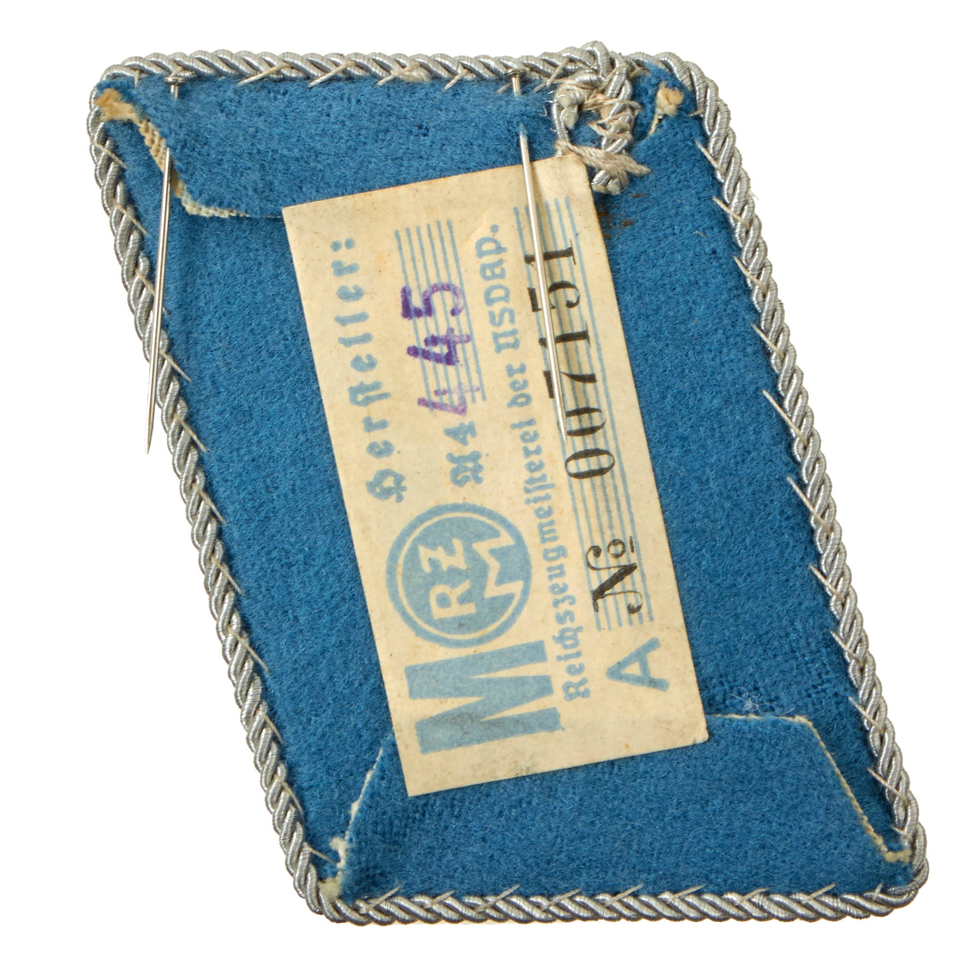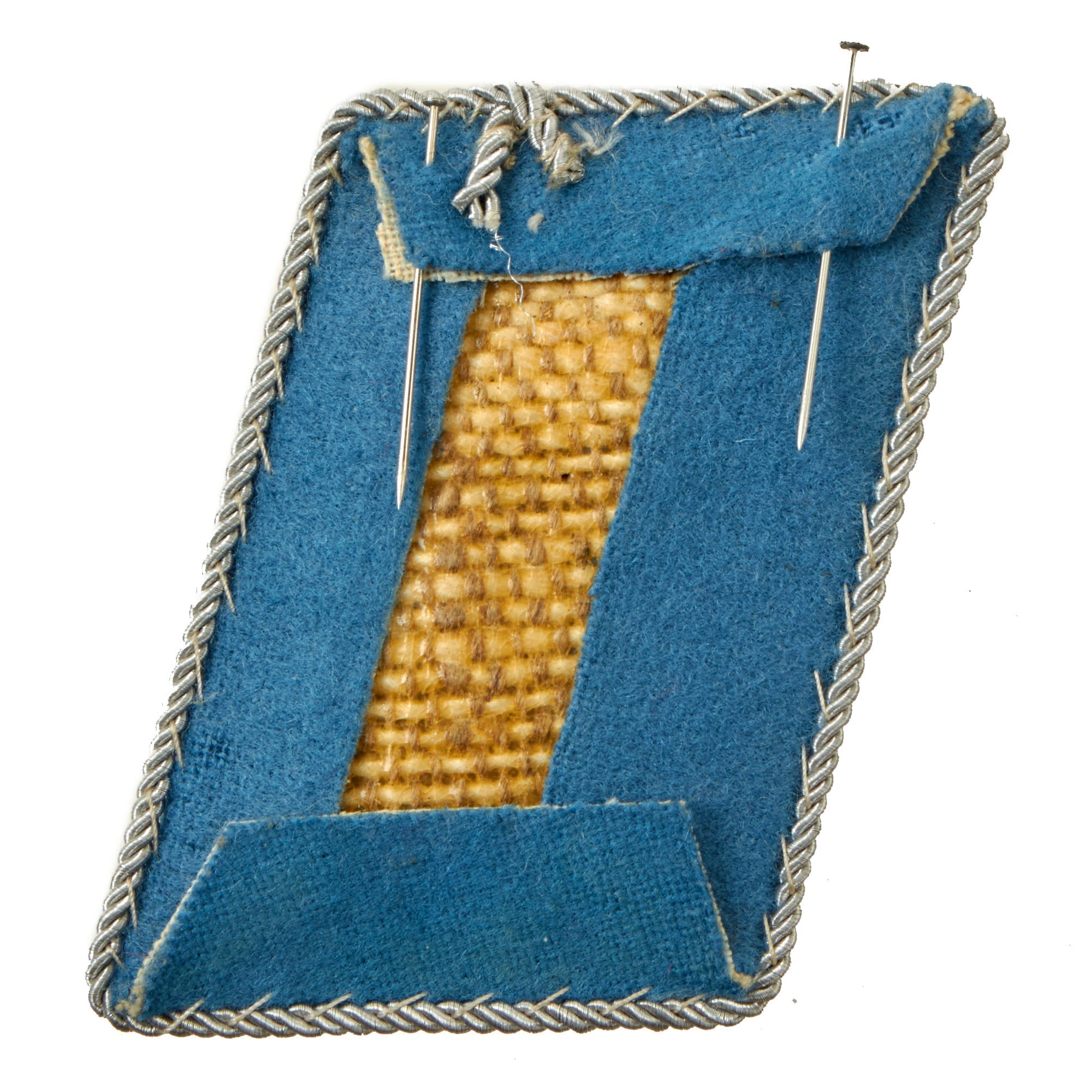Original Item: Only One Available. This is a fantastic unissued matched pair (left and right) of 1939-1945 Pattern Kragenspiegelen (Collar tabs), often called "Gorget Patches", used to denote rank and district in the SA. These have the correct lacquered buckram internal stiffeners, and are wrapped in light blue felt wool, with silver bullion borders and embroidery. This color scheme indicates use by the SA Gruppe Hochland (Highlands), which was made from the mountainous areas of Southern and Western Bavaria. The major city in this region was München (Munich), the core of the NSDAP movement in Germany.