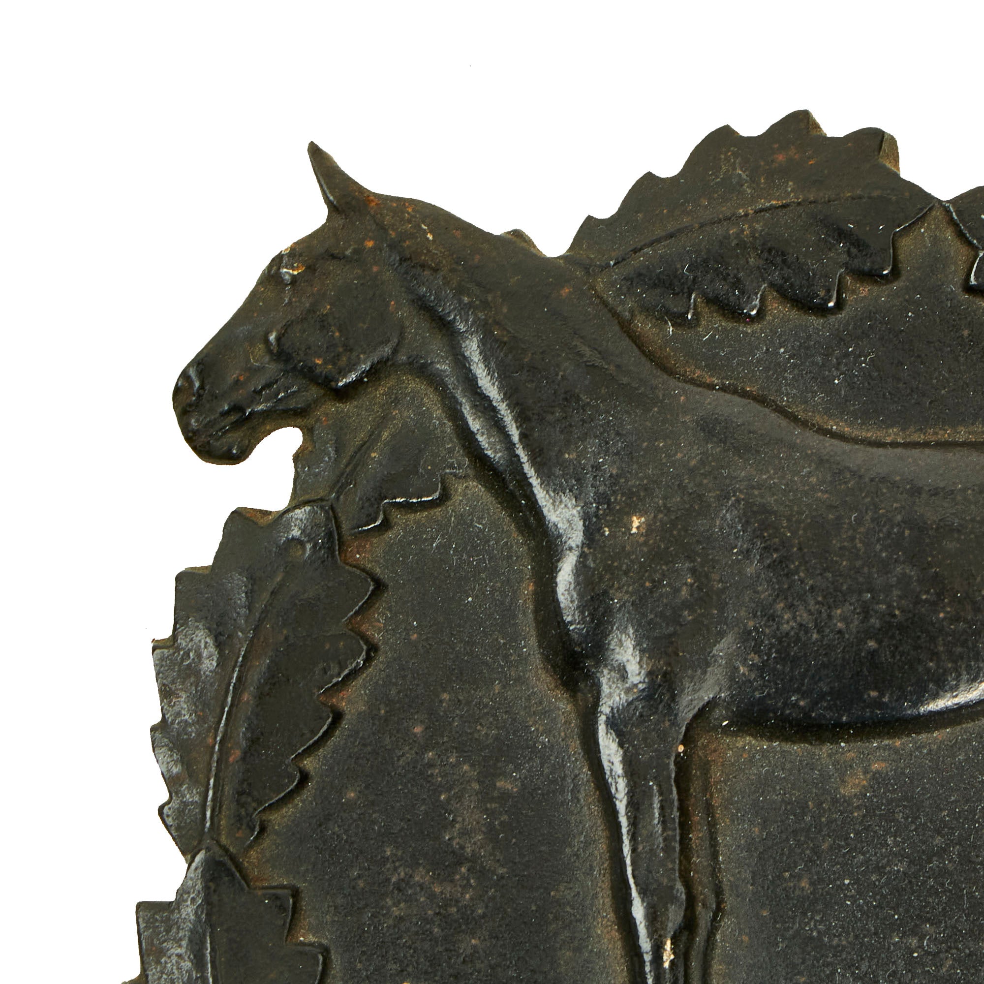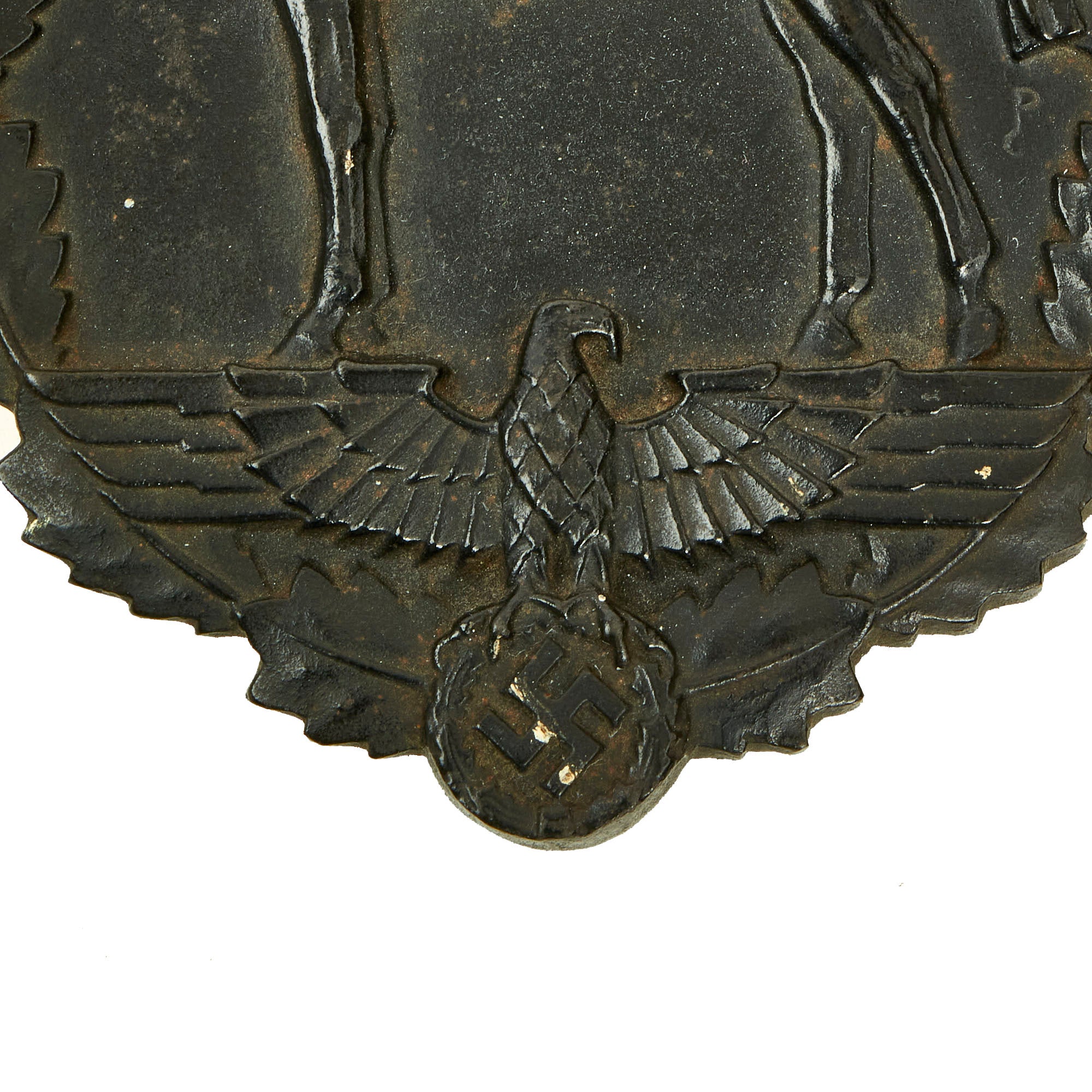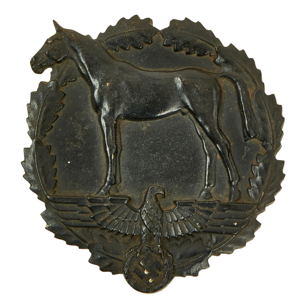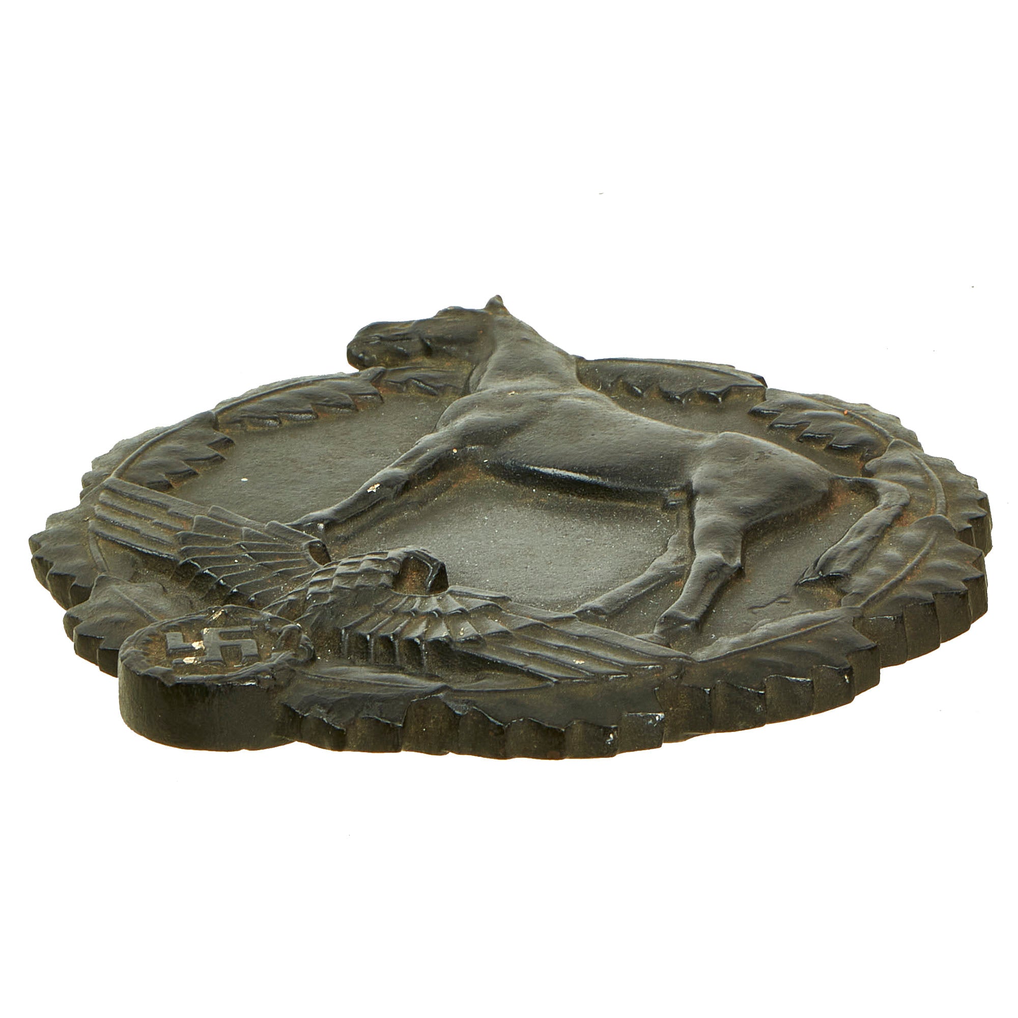 Original Item: Only One Available. This is a very nice German WWII Era Cased Presentation "Table Medal", a large award usually displayed on a shelf or table, as the name implies. The award itself measures approximately 4 ½” x 4 ¼” and appears to be constructed of a cast alloy. The front of the award has lovely artwork by Paul Casberg which features a beautiful horse standing atop a Reichs eagle surrounded by a wreath.